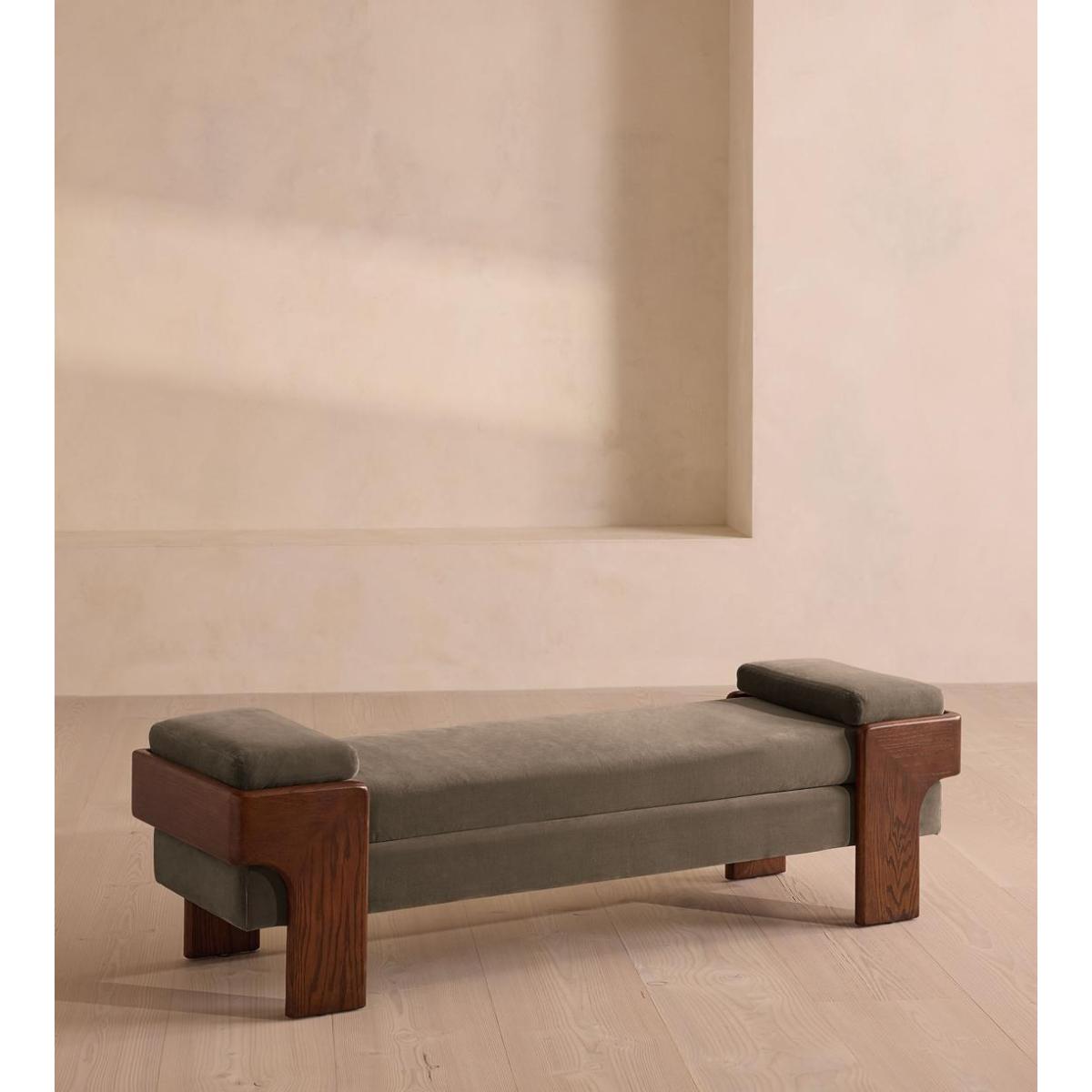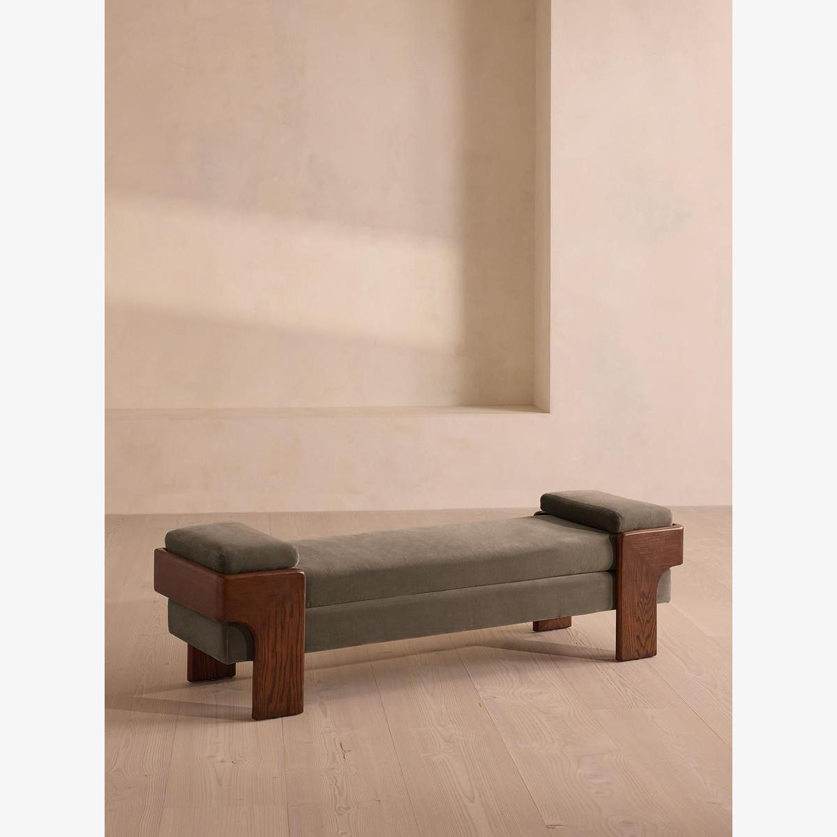 The relaxed silhouette is finished with feather-wrapped cushions upholstered in velvet. Designed as part of our Marcia collection, this bench similarly echoes the relaxed social setting of Shoreditch House. Secured by a solid oak framing at either side, its silhouette is fitted with a feather-wrapped seat cushion and two bolster cushions fully upholstered in velvet in our made-to-order palette.