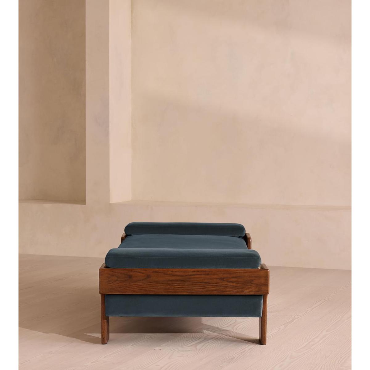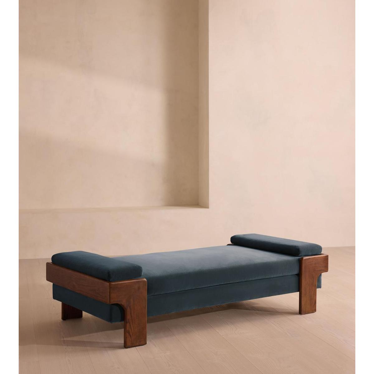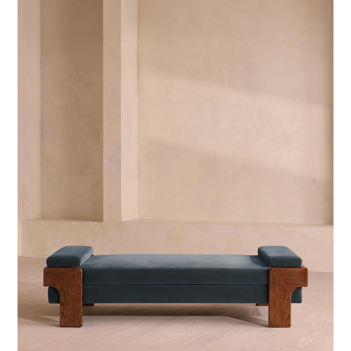 The relaxed silhouette is finished with feather-wrapped cushions upholstered in velvet. Designed as part of our Marcia range, this daybed similarly echoes the relaxed social setting of Shoreditch House with its wide, laid-back silhouette. Its feather-wrapped seat cushion and two bolster cushions are fully upholstered in velvet, available in our made-to-order palette.