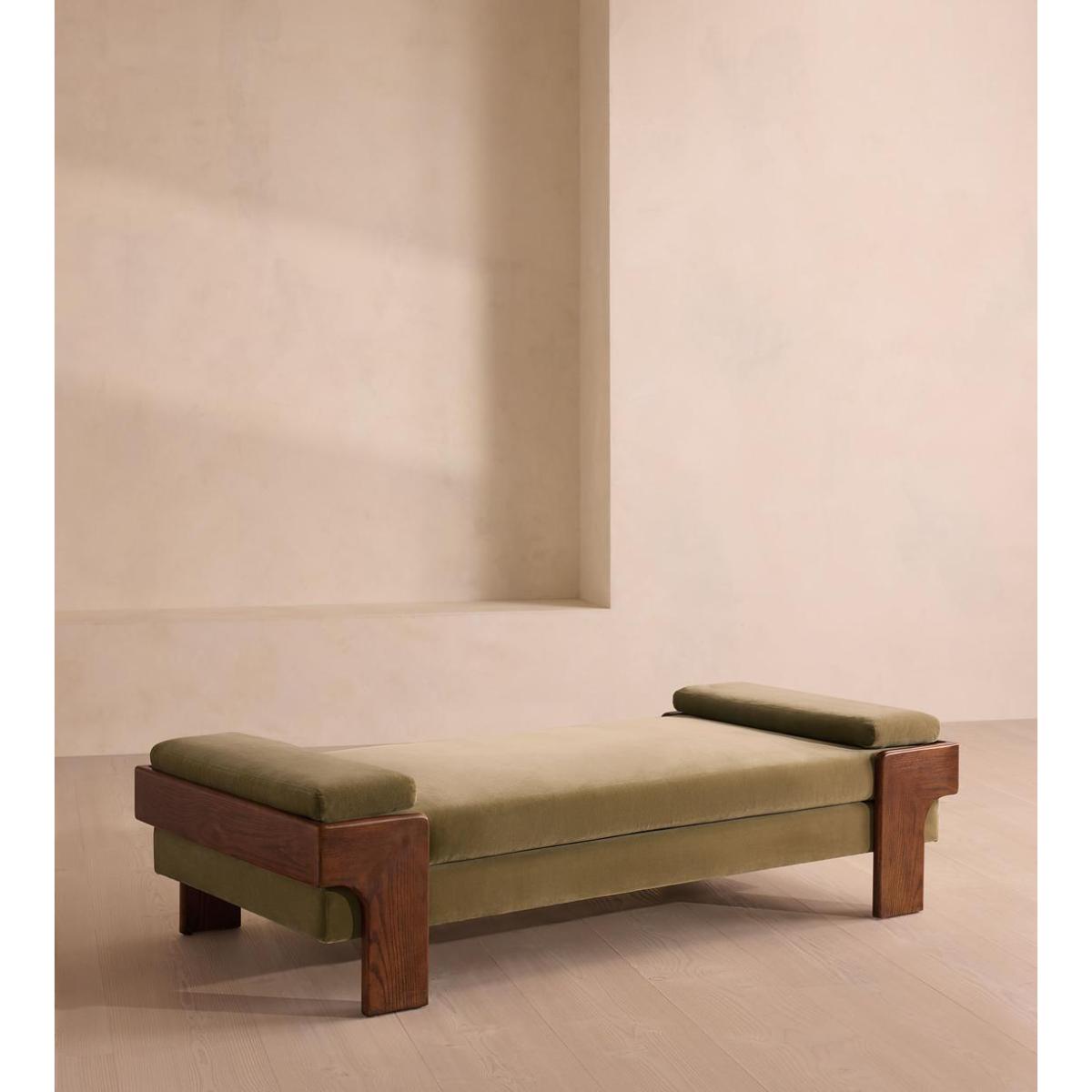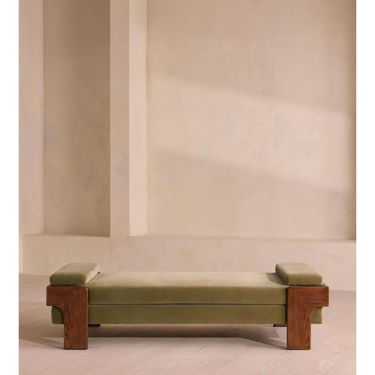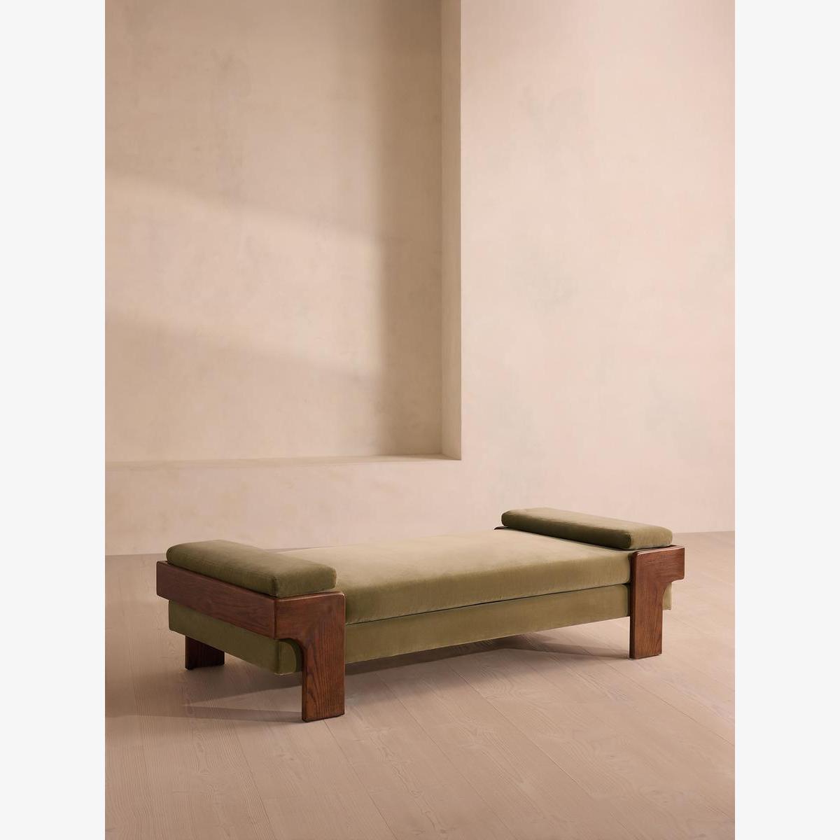 The relaxed silhouette is finished with feather-wrapped cushions upholstered in velvet. Designed as part of our Marcia range, this daybed similarly echoes the relaxed social setting of Shoreditch House with its wide, laid-back silhouette. Its feather-wrapped seat cushion and two bolster cushions are fully upholstered in velvet, available in our made-to-order palette.