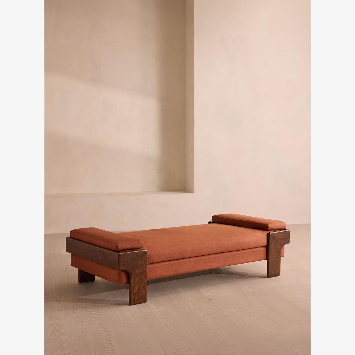 The relaxed silhouette is finished with feather-wrapped cushions upholstered in linen. Designed as part of our Marcia range, this daybed similarly echoes the relaxed social setting of Shoreditch House with its wide, laid-back silhouette. Its feather-wrapped seat cushion and two bolster cushions are fully upholstered in linen, available in our made-to-order palette.