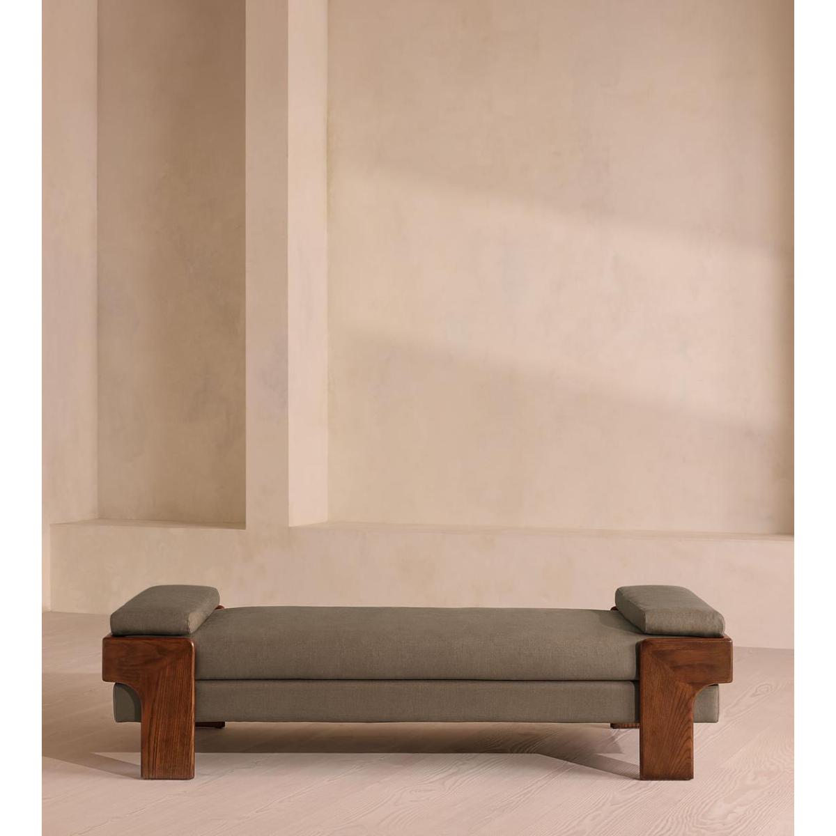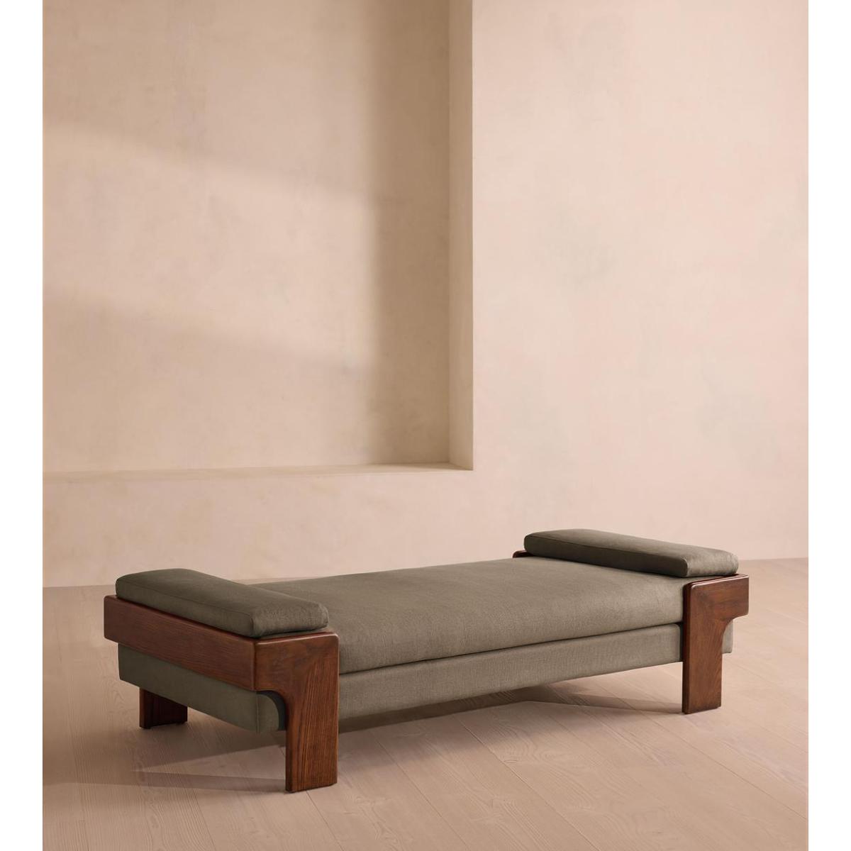 The relaxed silhouette is finished with feather-wrapped cushions upholstered in linen. Designed as part of our Marcia range, this daybed similarly echoes the relaxed social setting of Shoreditch House with its wide, laid-back silhouette. Its feather-wrapped seat cushion and two bolster cushions are fully upholstered in linen, available in our made-to-order palette.