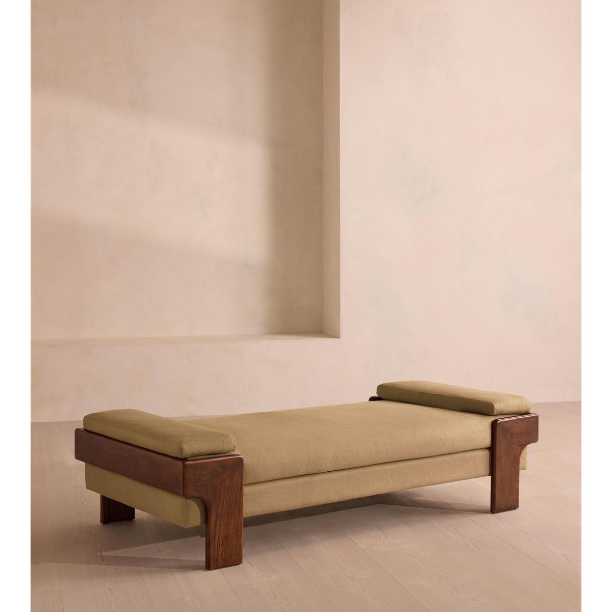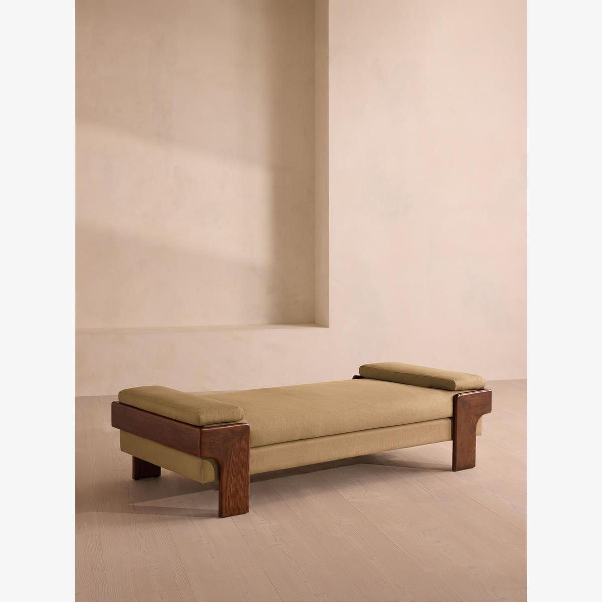 The relaxed silhouette is finished with feather-wrapped cushions upholstered in linen. Designed as part of our Marcia range, this daybed similarly echoes the relaxed social setting of Shoreditch House with its wide, laid-back silhouette. Its feather-wrapped seat cushion and two bolster cushions are fully upholstered in linen, available in our made-to-order palette.