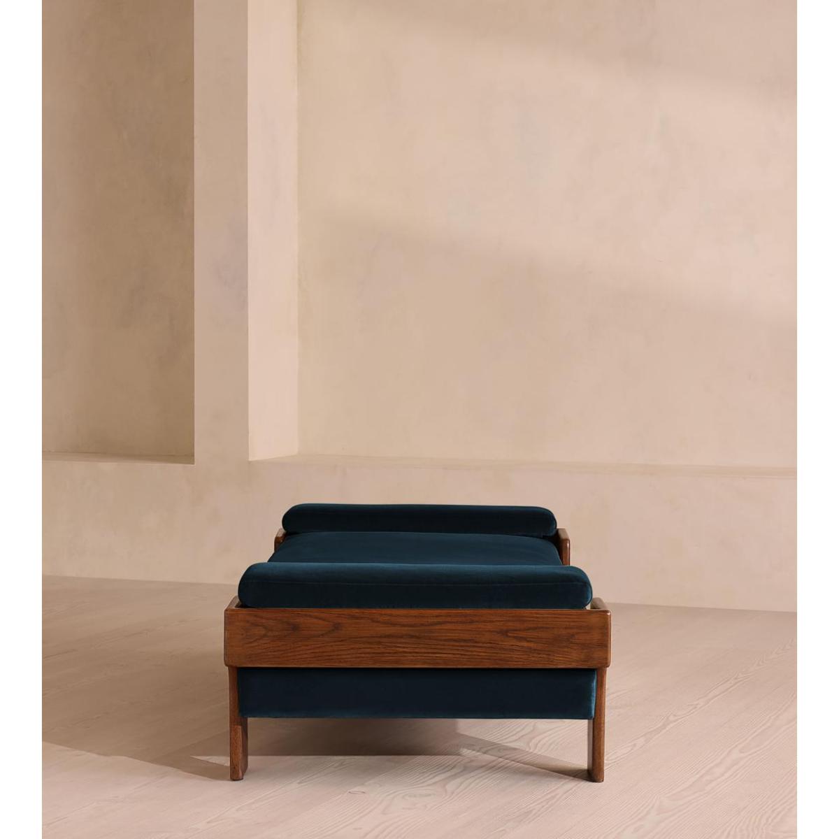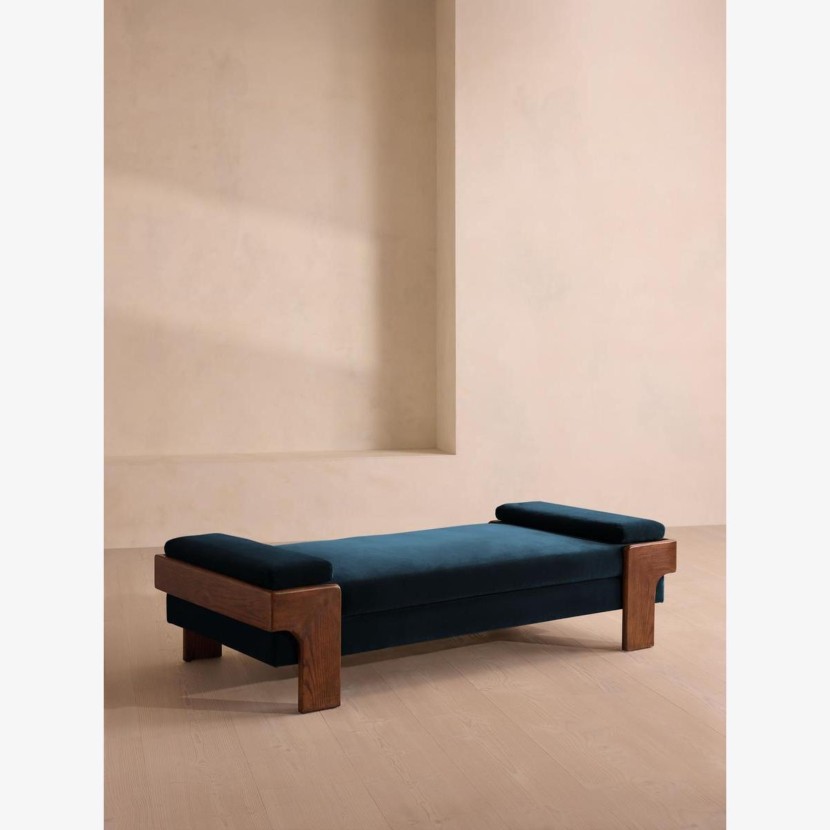 The relaxed silhouette is finished with feather-wrapped cushions upholstered in velvet. Designed as part of our Marcia range, this daybed similarly echoes the relaxed social setting of Shoreditch House with its wide, laid-back silhouette. Its feather-wrapped seat cushion and two bolster cushions are fully upholstered in velvet, available in our made-to-order palette.