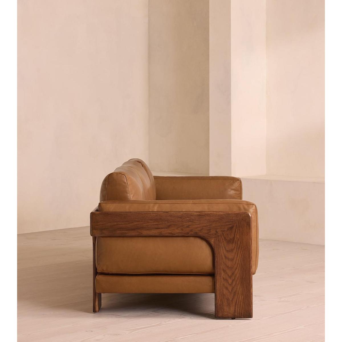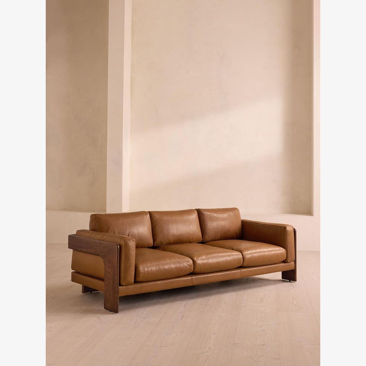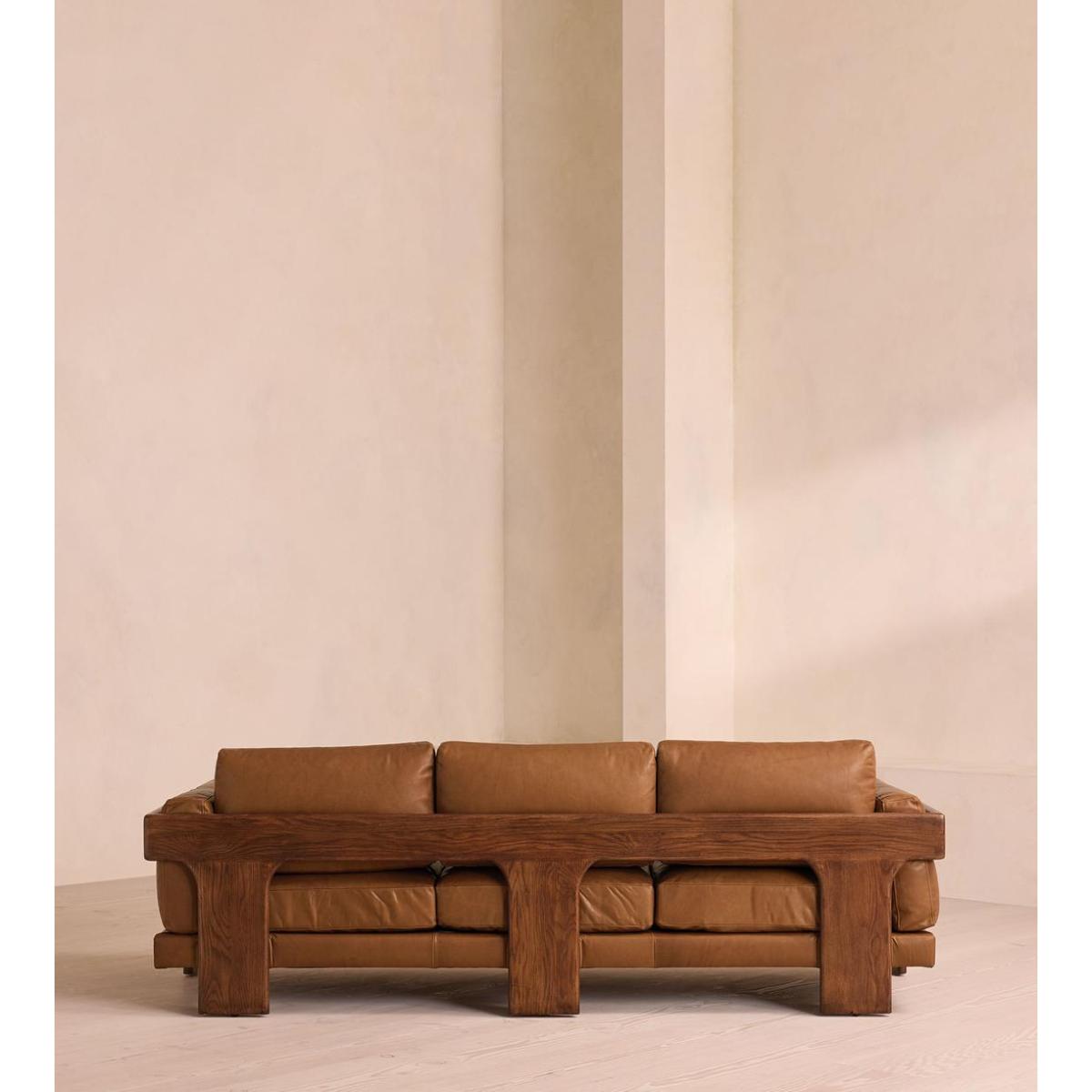 A laid-back silhouette combines a solid oak frame with fully reversible, feather-wrapped cushions upholstered in leather. Echoing the relaxed social setting of Shoreditch House, the Marcia three-seater sofa has a laid-back silhouette carved from solid oak. Its feather-wrapped cushions are fully reversible, and come upholstered in leather in select made-to-order colours.