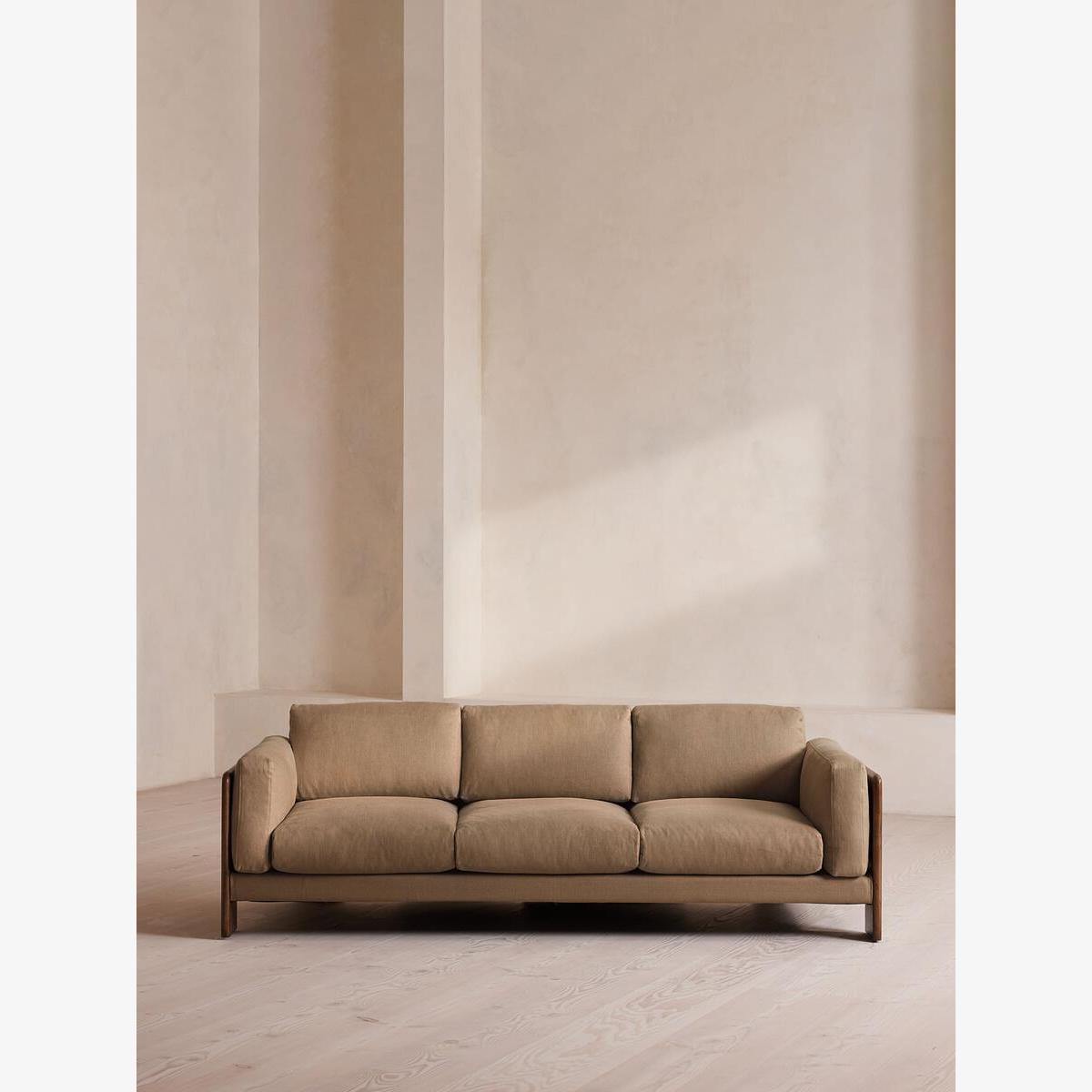 I’m a fan of this mushroom-coloured linen three-seater because its warm neutral tone and clean lines slot straight into Scandi, modern-minimal or even soft-industrial schemes. The low, cushioned profile feels relaxed yet tailored, so it works equally well against a pale-painted wall or beneath a gallery of sculptural prints. For styling, layer in a chunky wool throw and a couple of velvet or leather cushions in deep forest or rust to add depth, then anchor the seating area with a natural-fibre rug and a simple wood-and-metal coffee table. Keep direct sunlight to a minimum and vacuum regularly to maintain that fresh linen look.