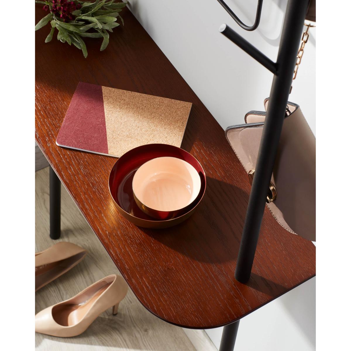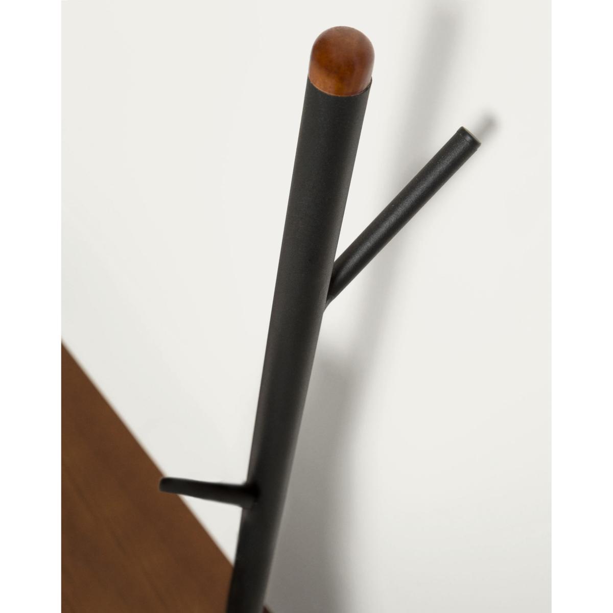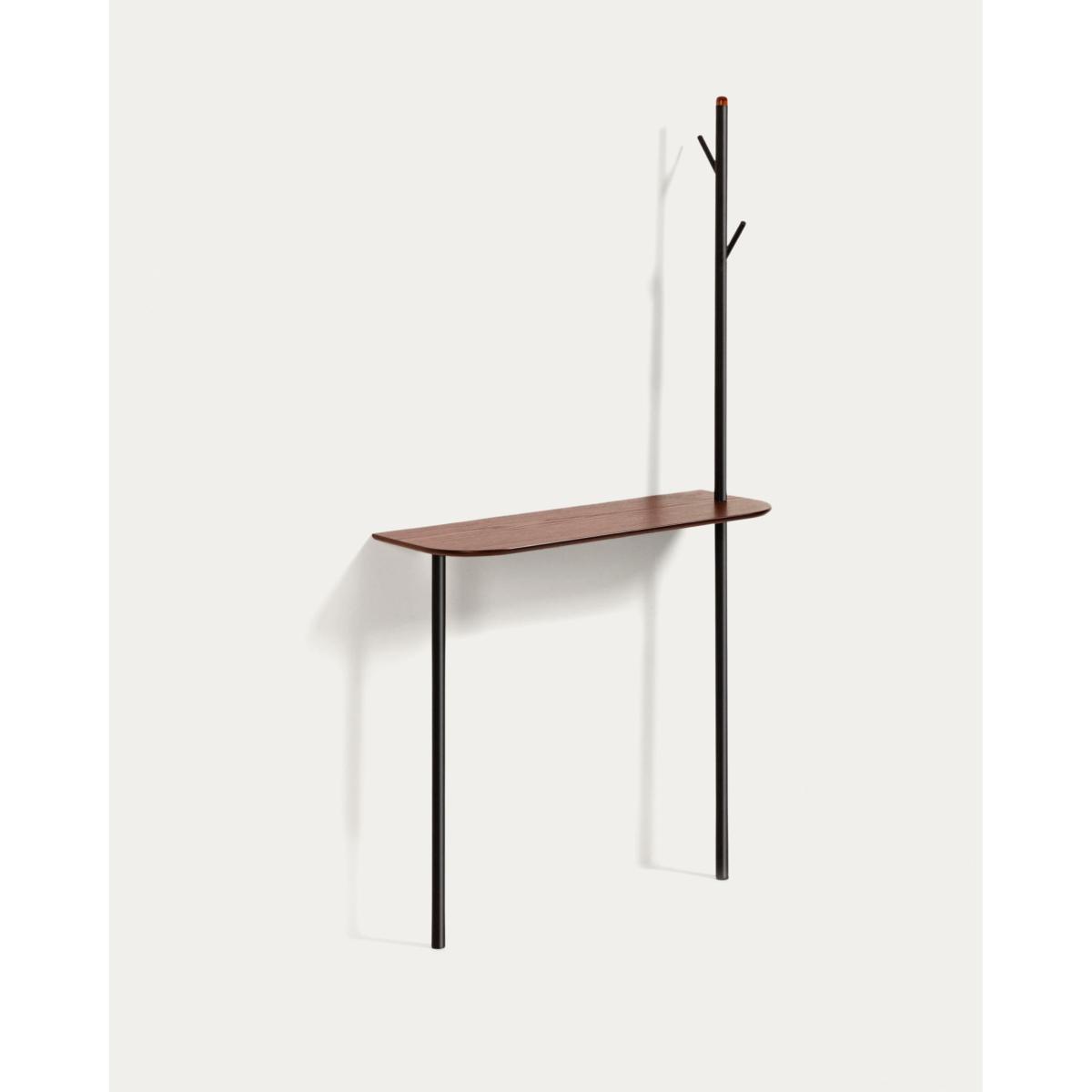 The Marcolina console has an oak veneer top with a walnut finish and a metal structure painted matte black. There is a built-in metal coat rack on the right side of the console. This is an ideal piece of stylish furniture to greet you in your entrance hall. Welcome home.