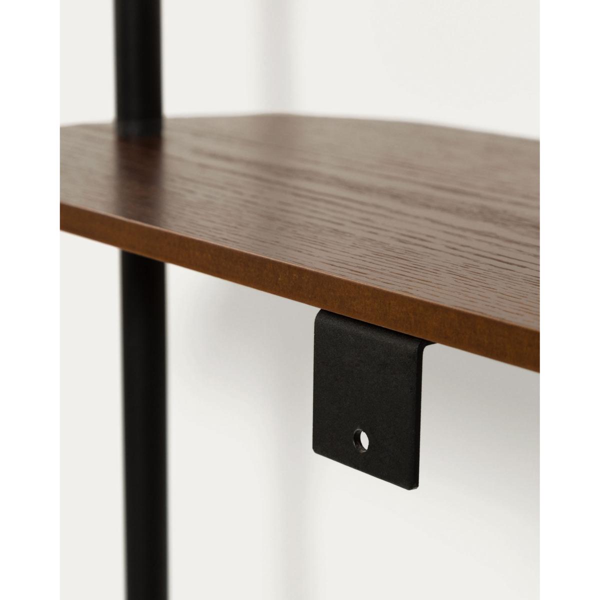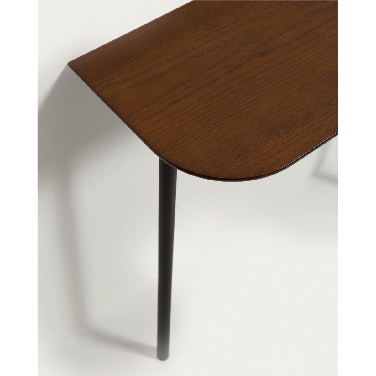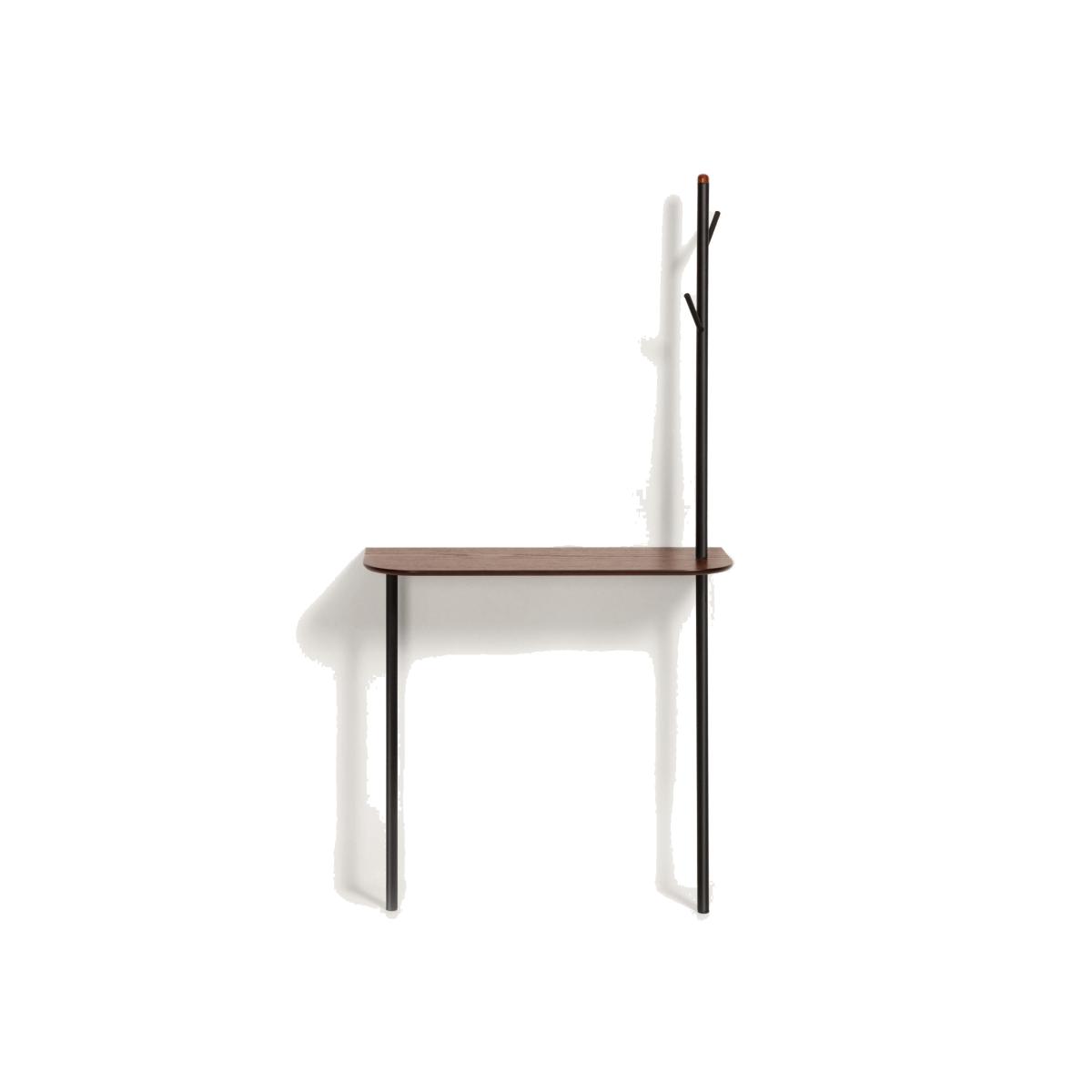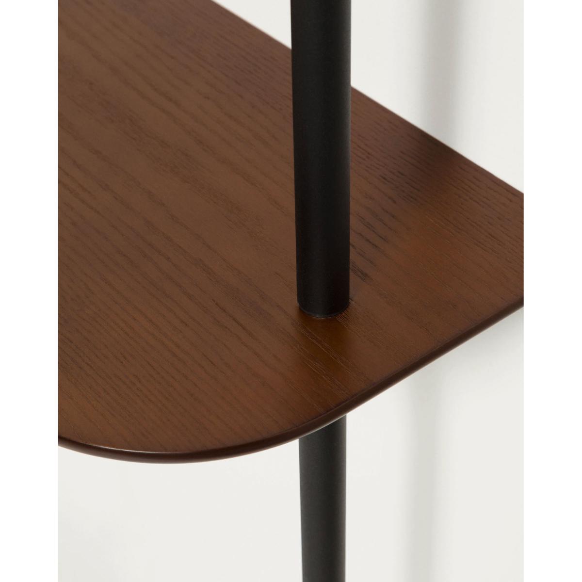 The Marcolina console has an oak veneer top with a walnut finish and a metal structure painted matte black. There is a built-in metal coat rack on the right side of the console. This is an ideal piece of stylish furniture to greet you in your entrance hall. Welcome home.