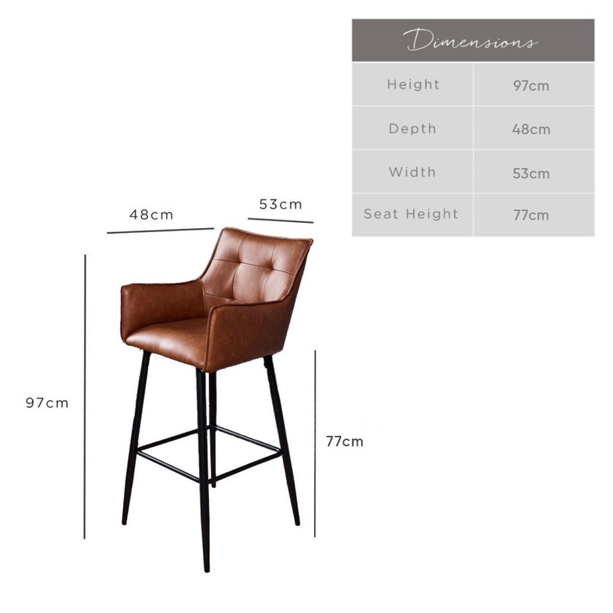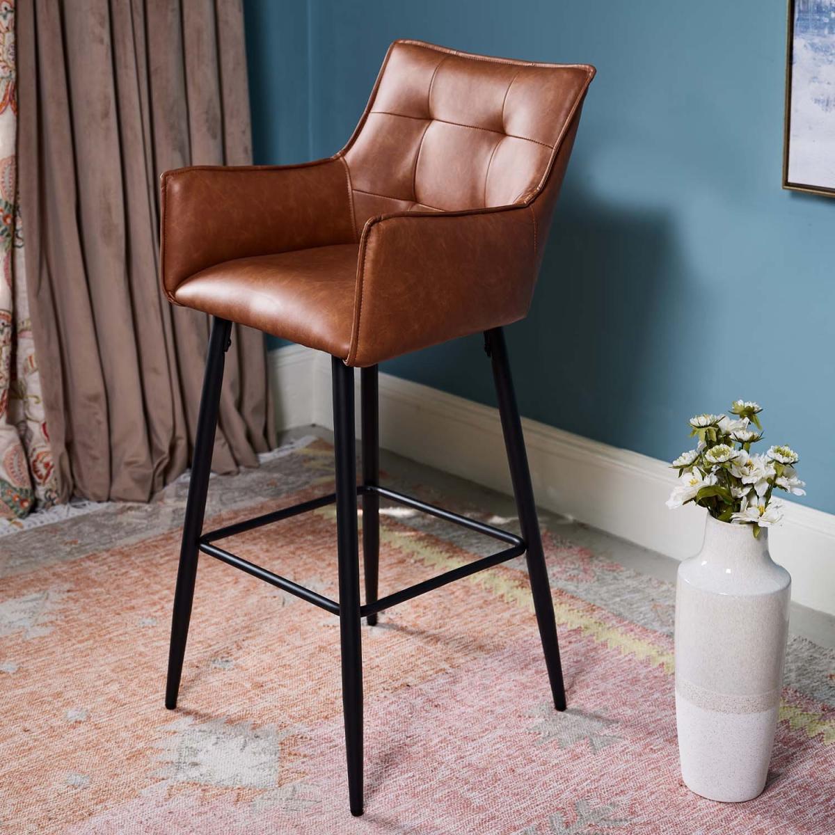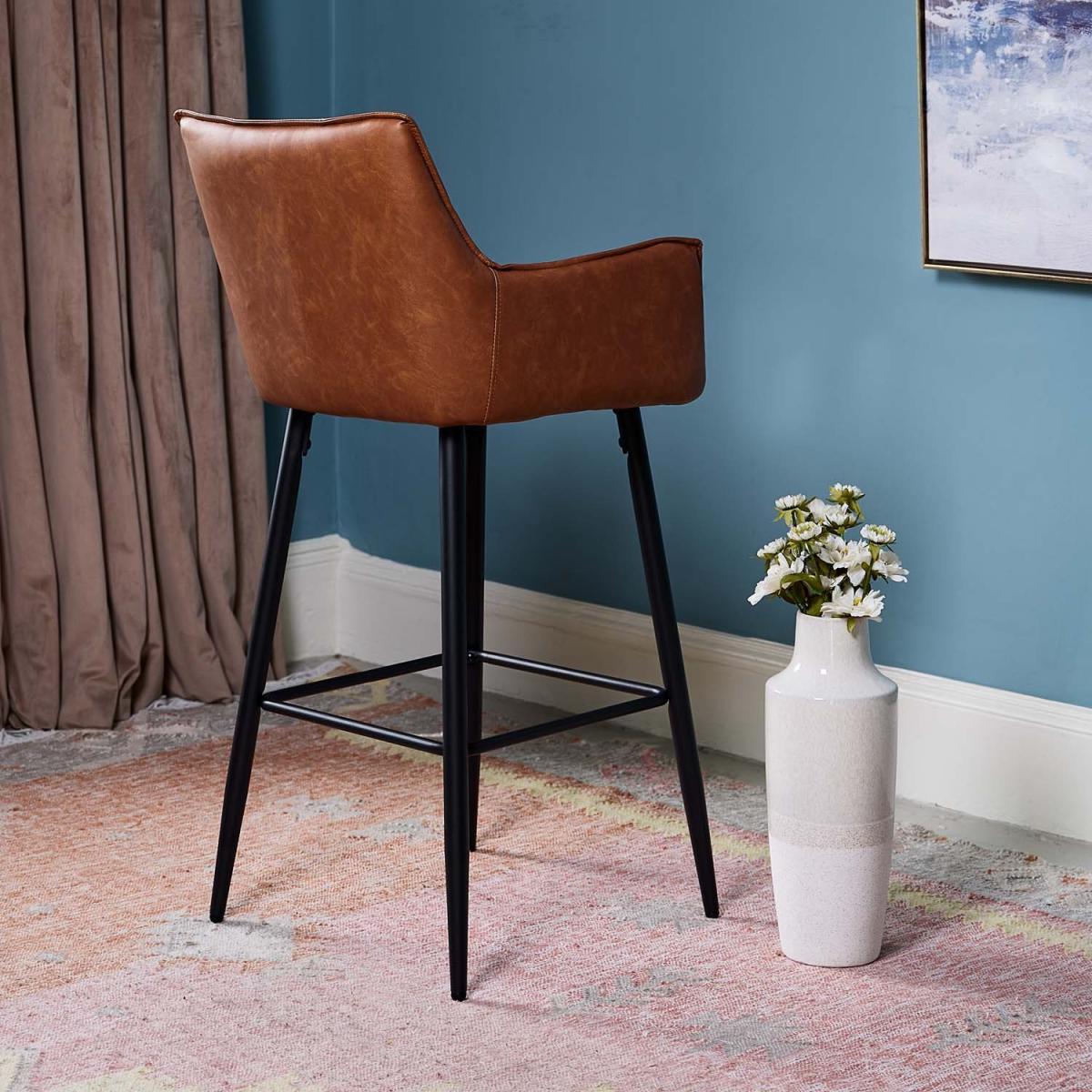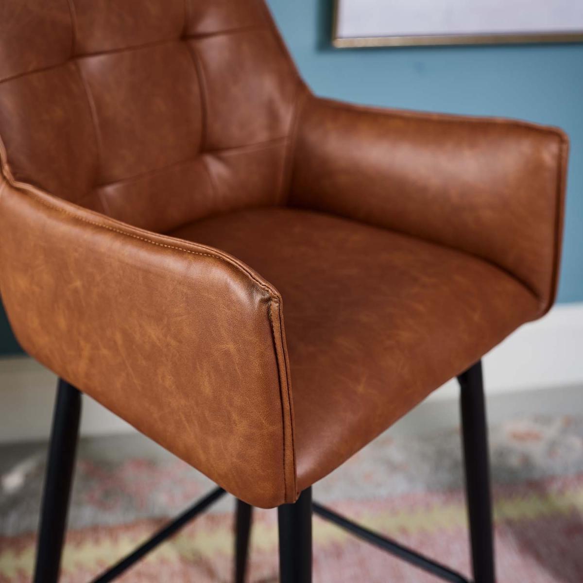 The Marcus barstool is a sophisticated addition to any space. With tan faux leather upholstery and square stitching, this seat brings classic features to a modern design. Sturdy black metal legs and high arms add a supportive element, creating a comfortable bar stool perfect for any breakfast bar or island. Sold as a pair, these barstools are also available in grey, making them a versatile fit for any home.