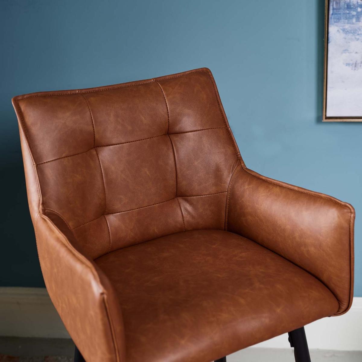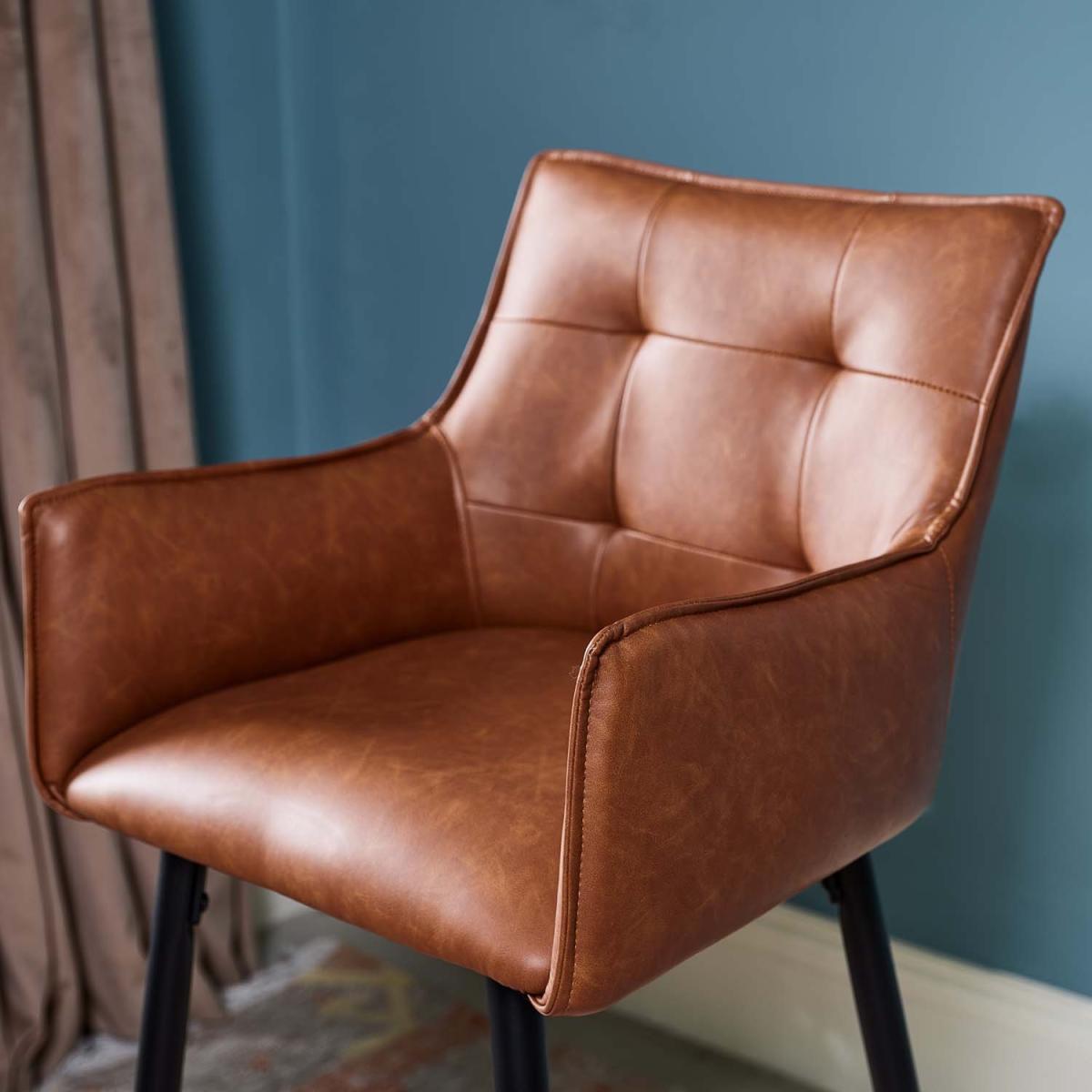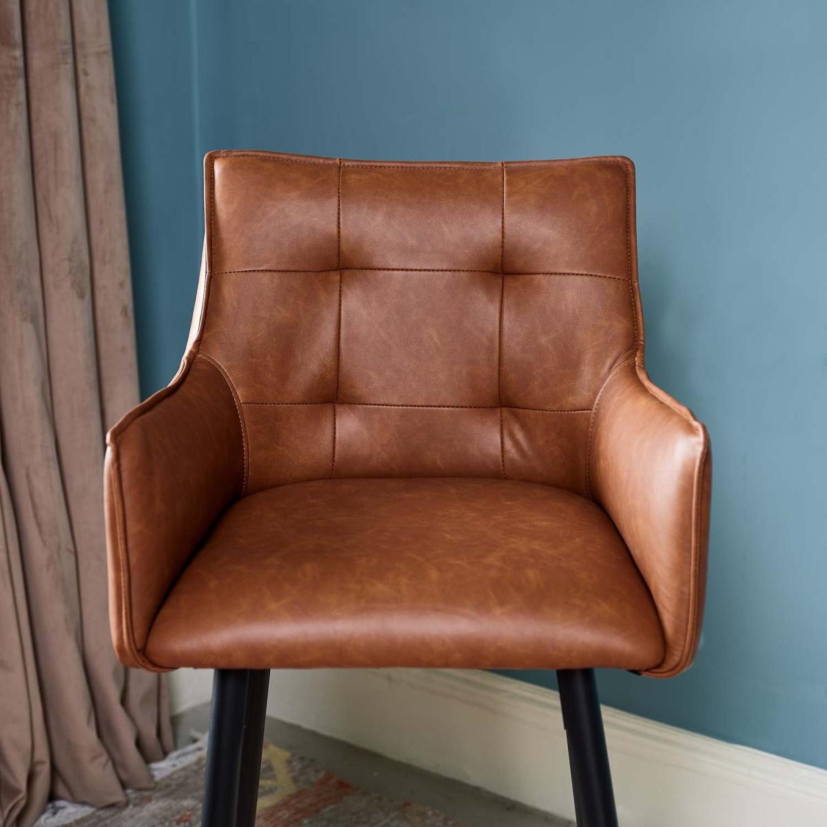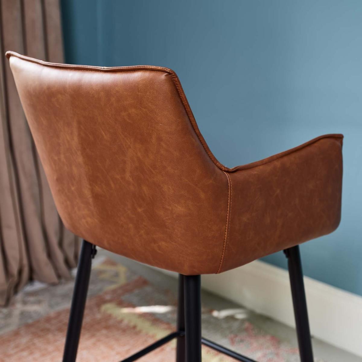 The Marcus barstool is a sophisticated addition to any space. With tan faux leather upholstery and square stitching, this seat brings classic features to a modern design. Sturdy black metal legs and high arms add a supportive element, creating a comfortable bar stool perfect for any breakfast bar or island. Sold as a pair, these barstools are also available in grey, making them a versatile fit for any home.