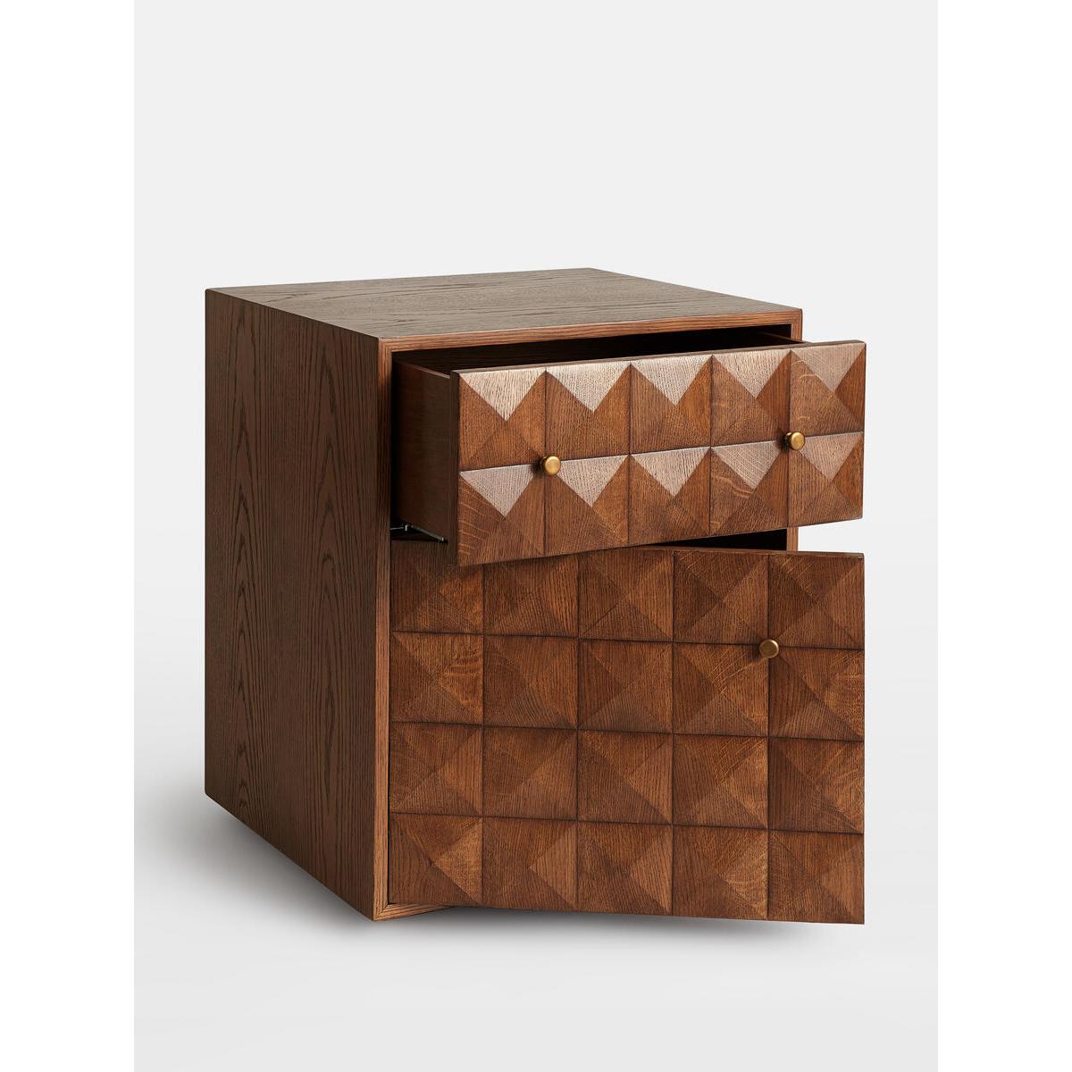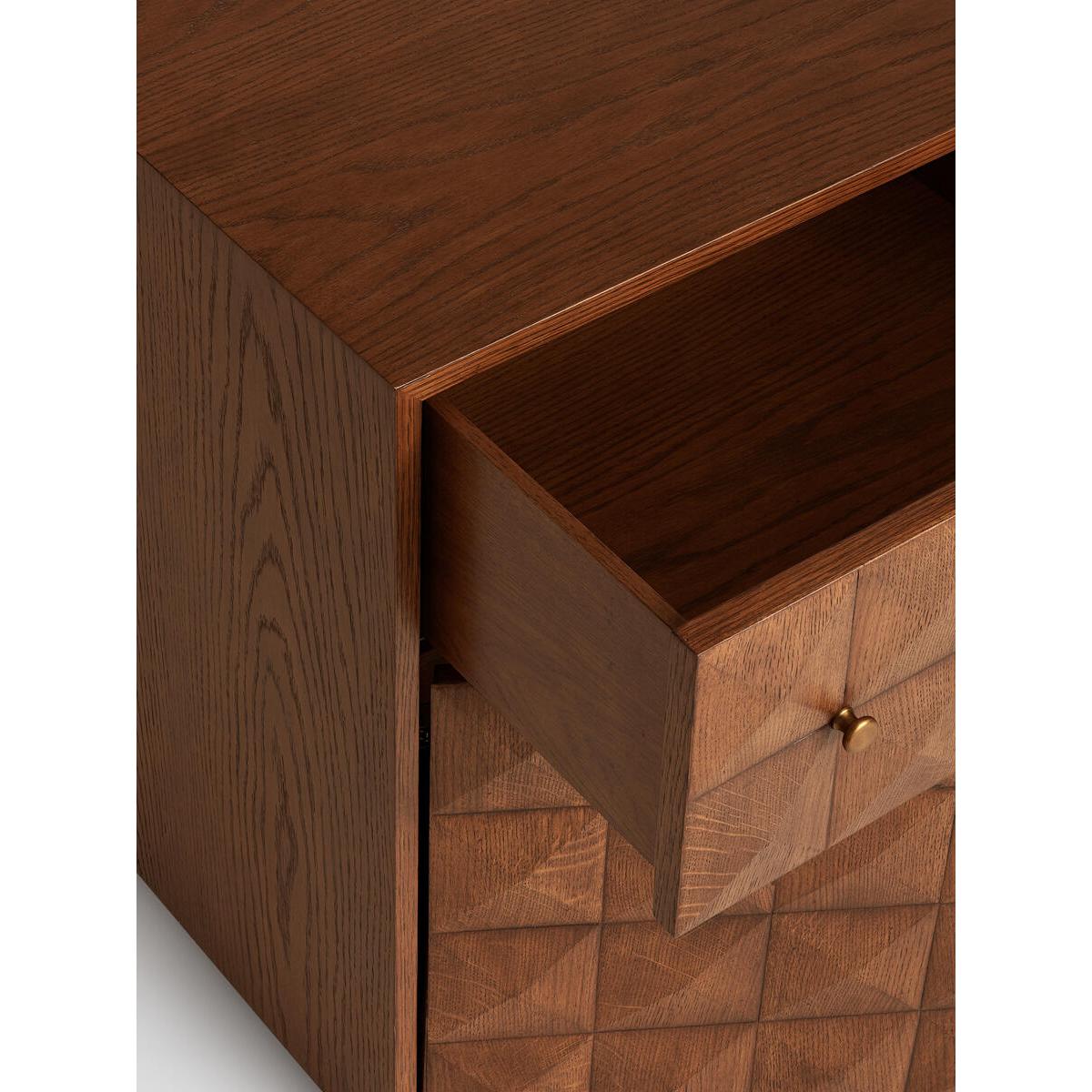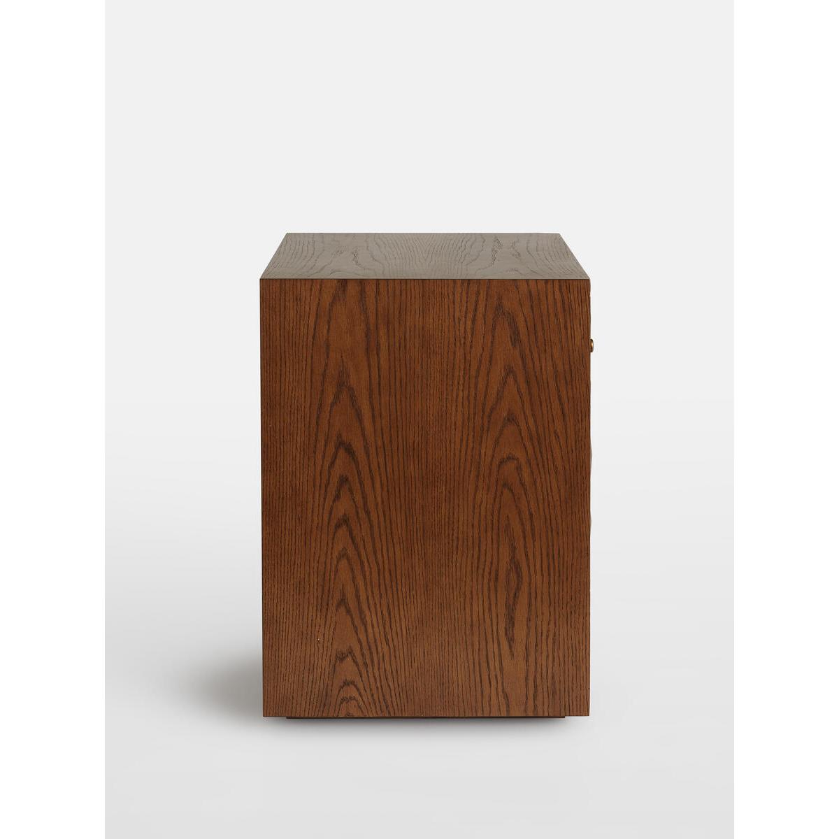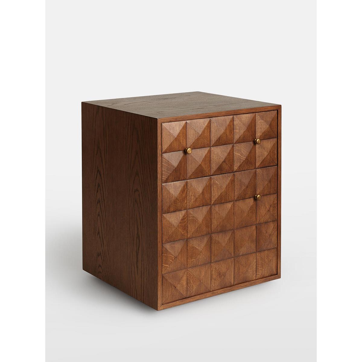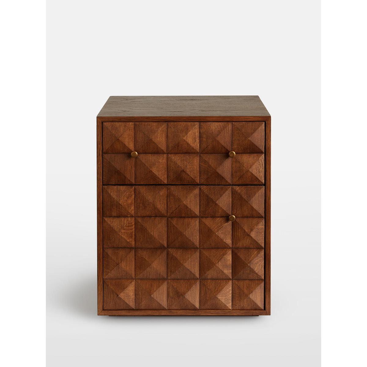 The Marena bedside table takes its cues from White City House. Crafted from warm oak, it is characterised by textured square studsthat catch the light at different angles. Make use of the concealeddrawers to hide away books and sleeping masks. Solid oak. Textured-stud front. Brass handles. Two drawers. As seen in White City House.