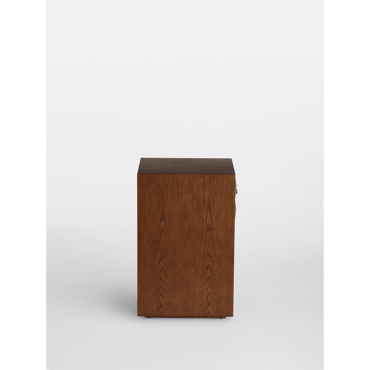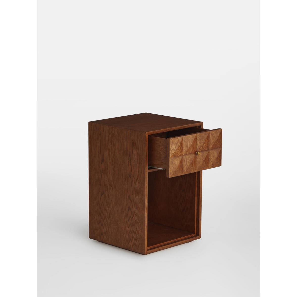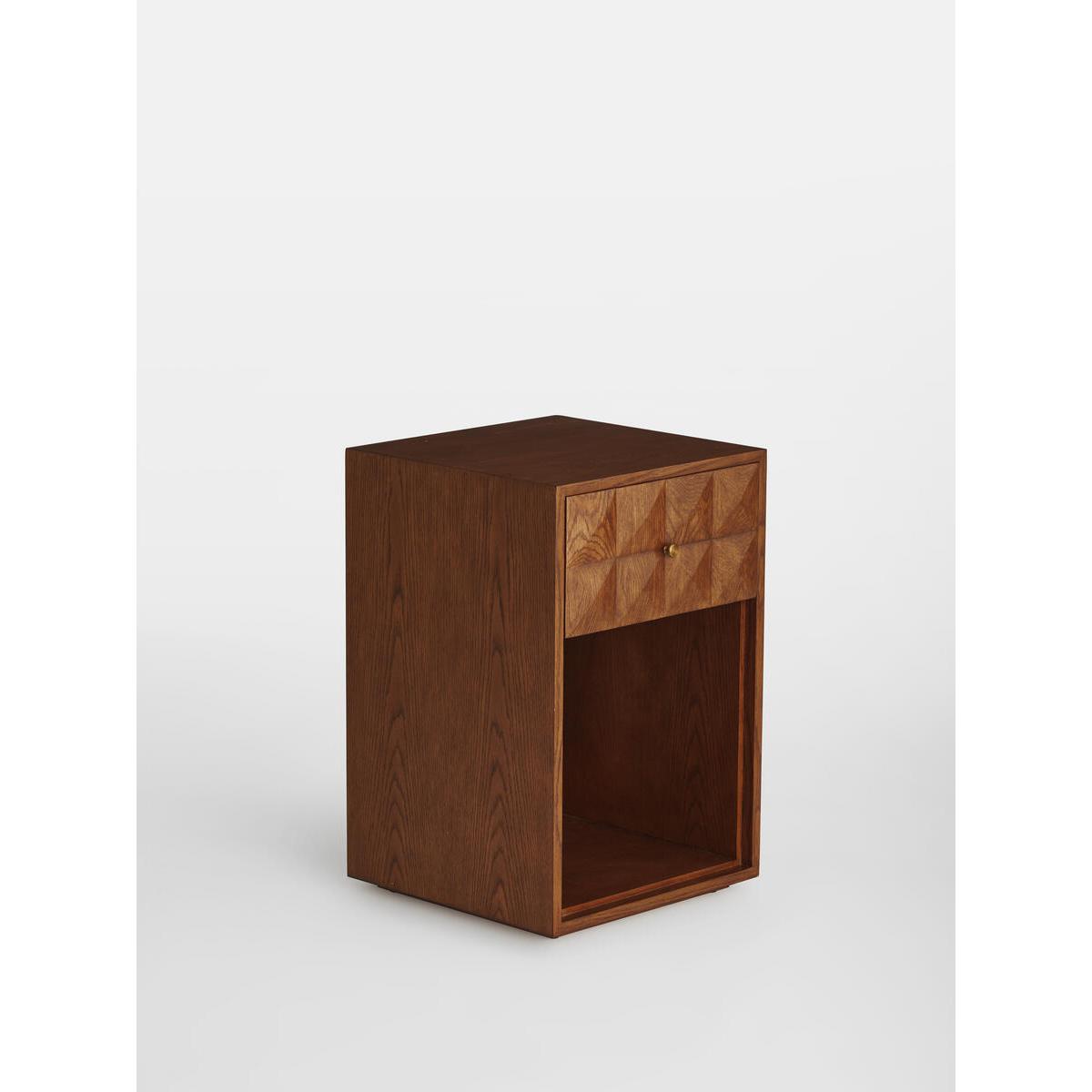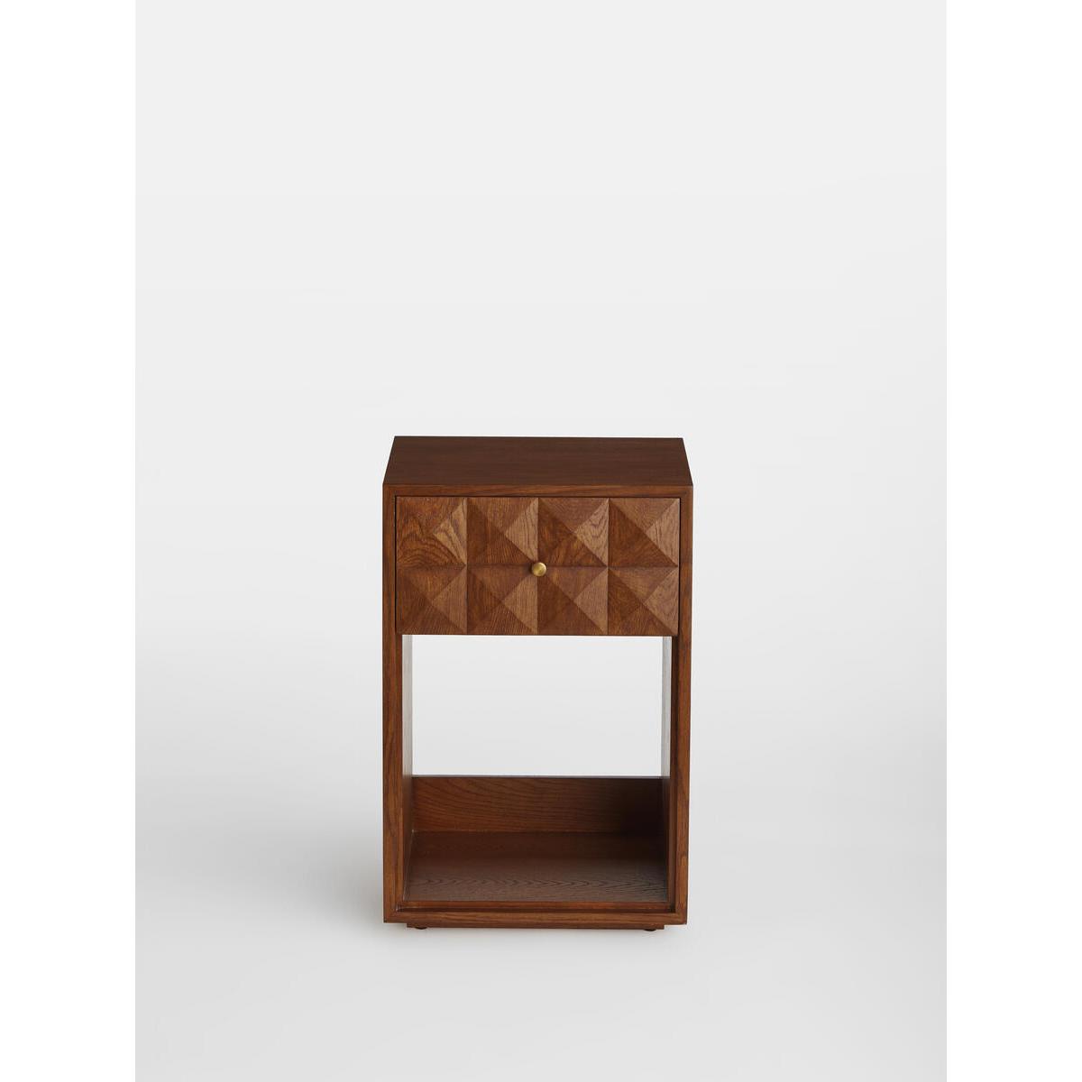 The Marena open bedside table takes its cues from White City. House. Crafted from warm oak, it is characterised by texturedsquare studs that catch the light at different angles. Make use ofthe open design to showcase your favourite books. Solid oak. Open design. Textured-stud front. Brass handle. One top drawer. As seen in White City House.