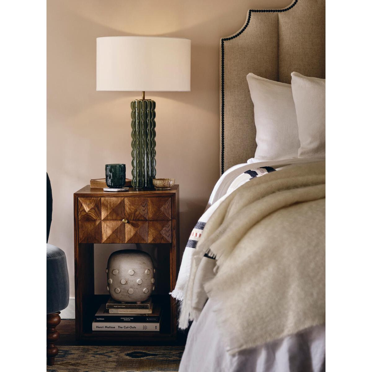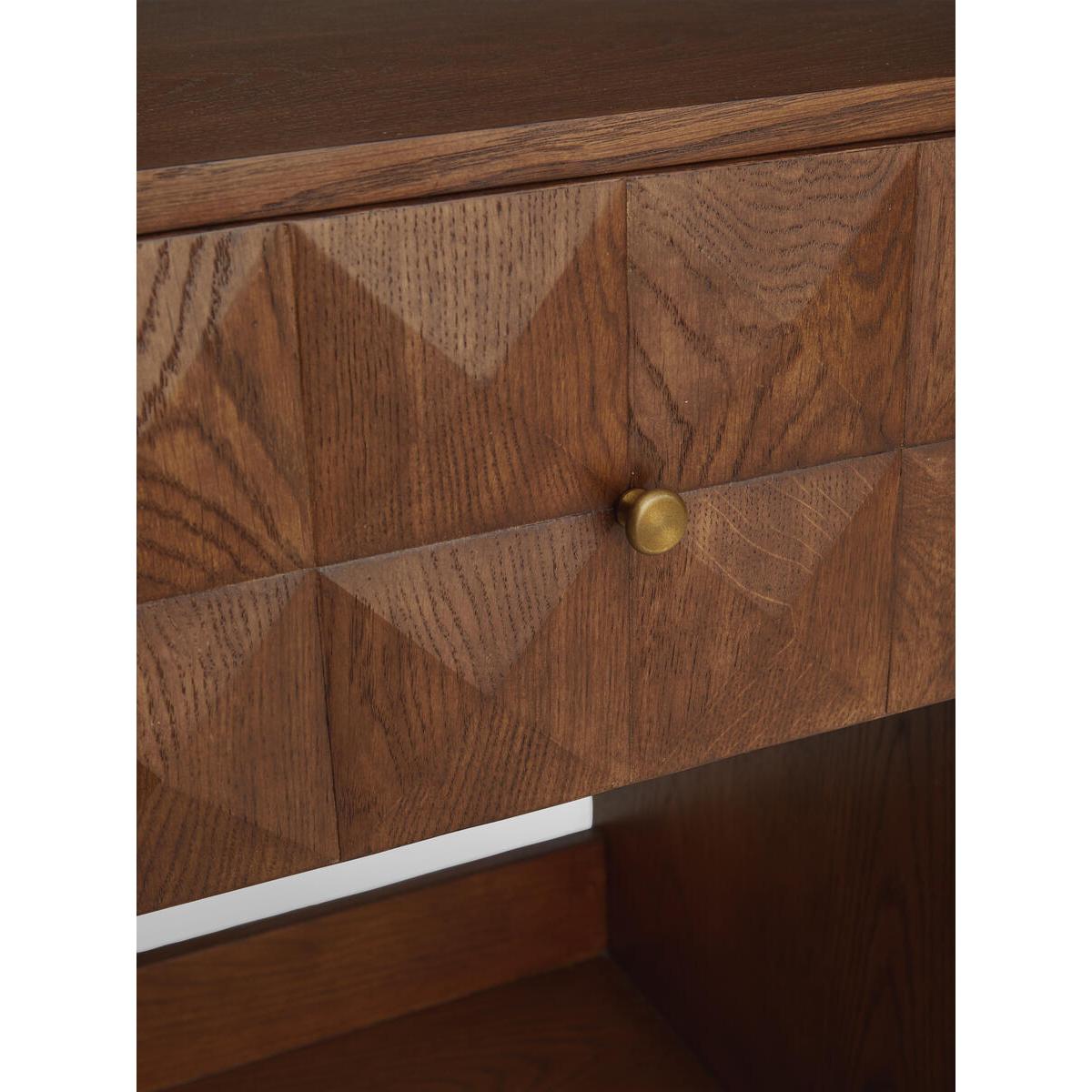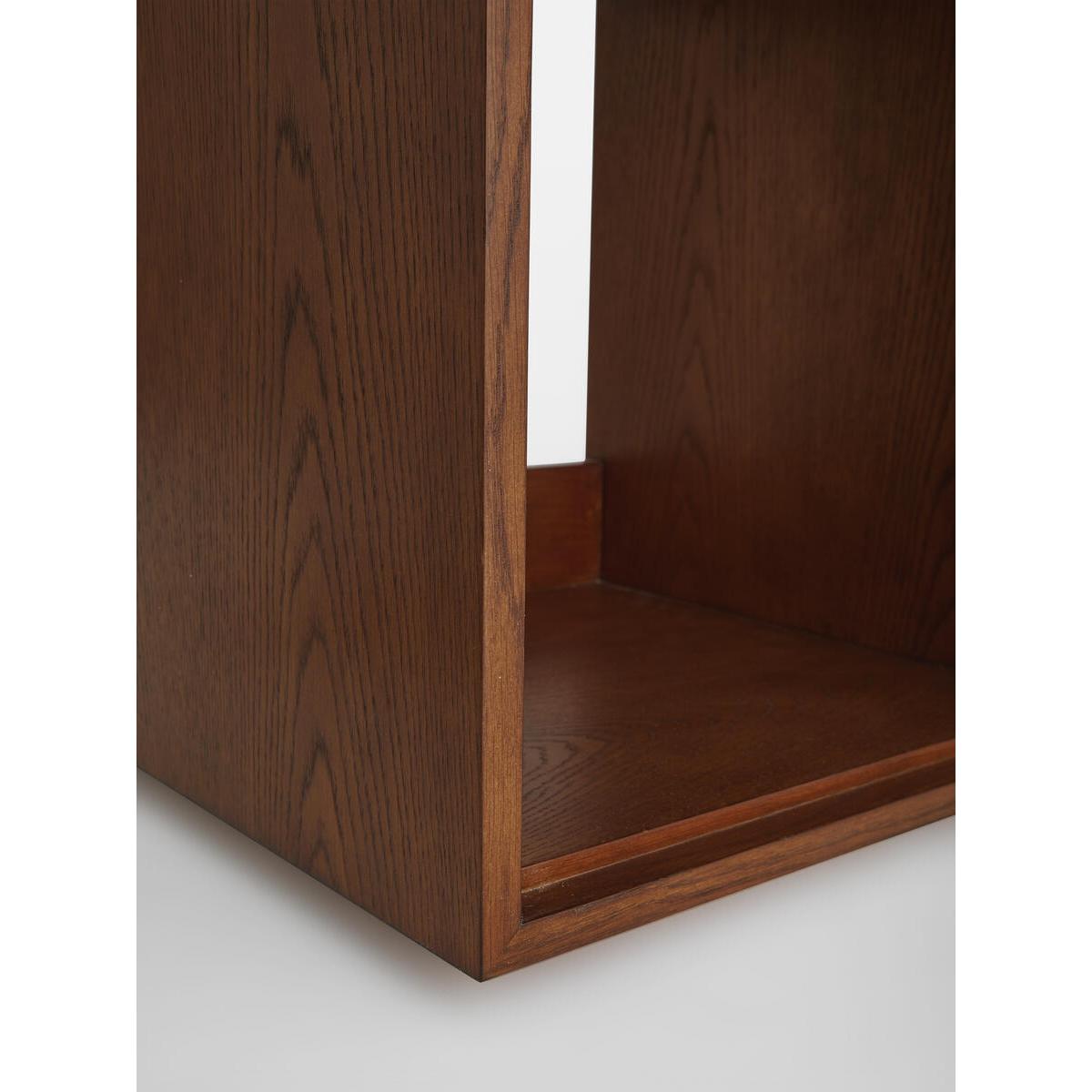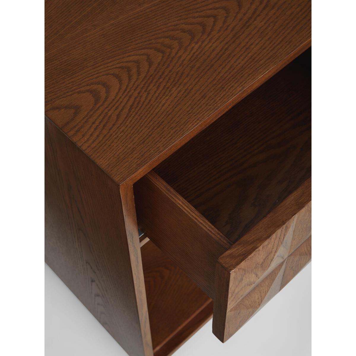 The Marena open bedside table takes its cues from White City. House. Crafted from warm oak, it is characterised by texturedsquare studs that catch the light at different angles. Make use ofthe open design to showcase your favourite books. Solid oak. Open design. Textured-stud front. Brass handle. One top drawer. As seen in White City House.