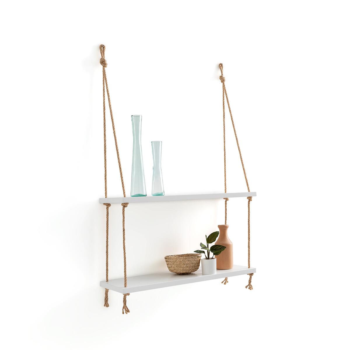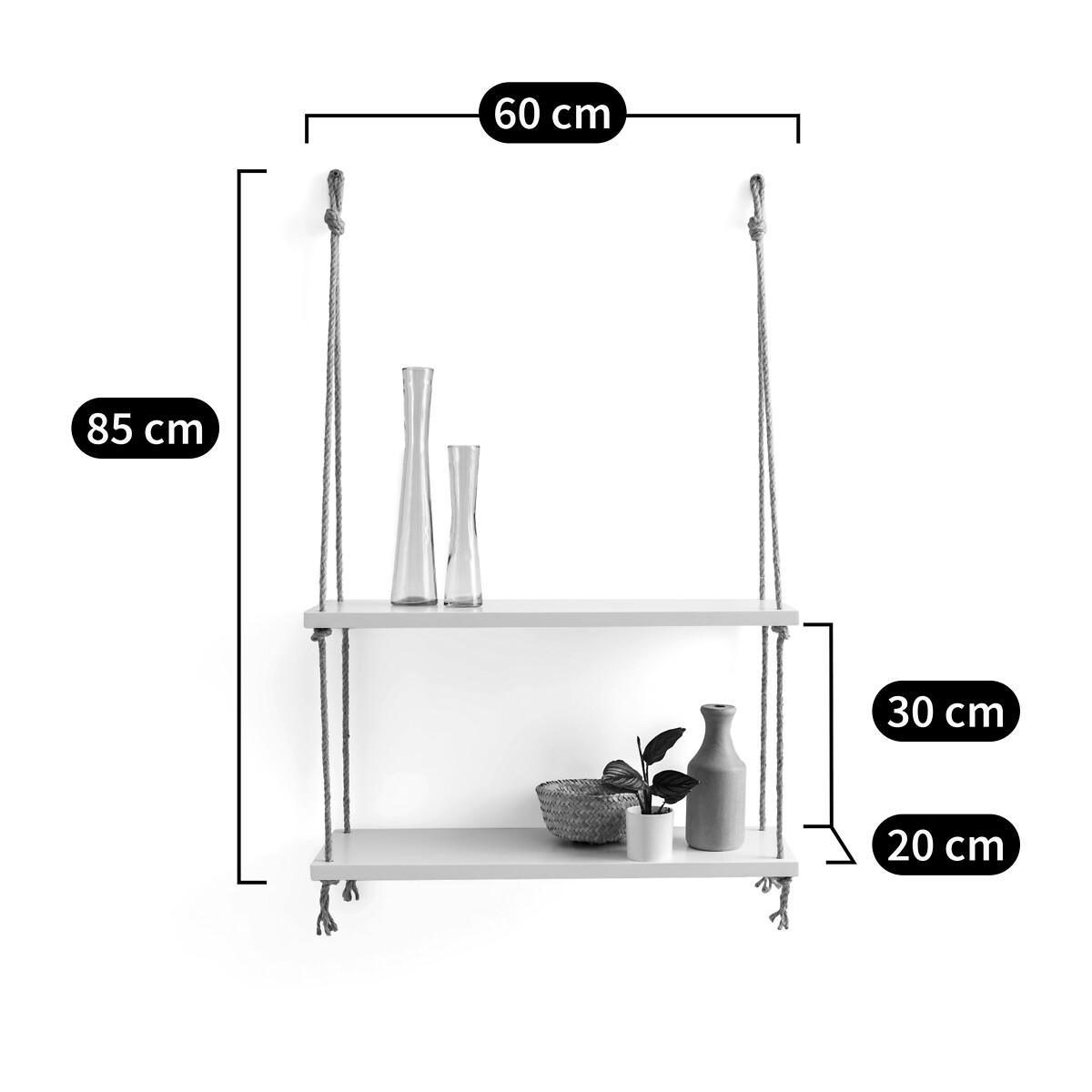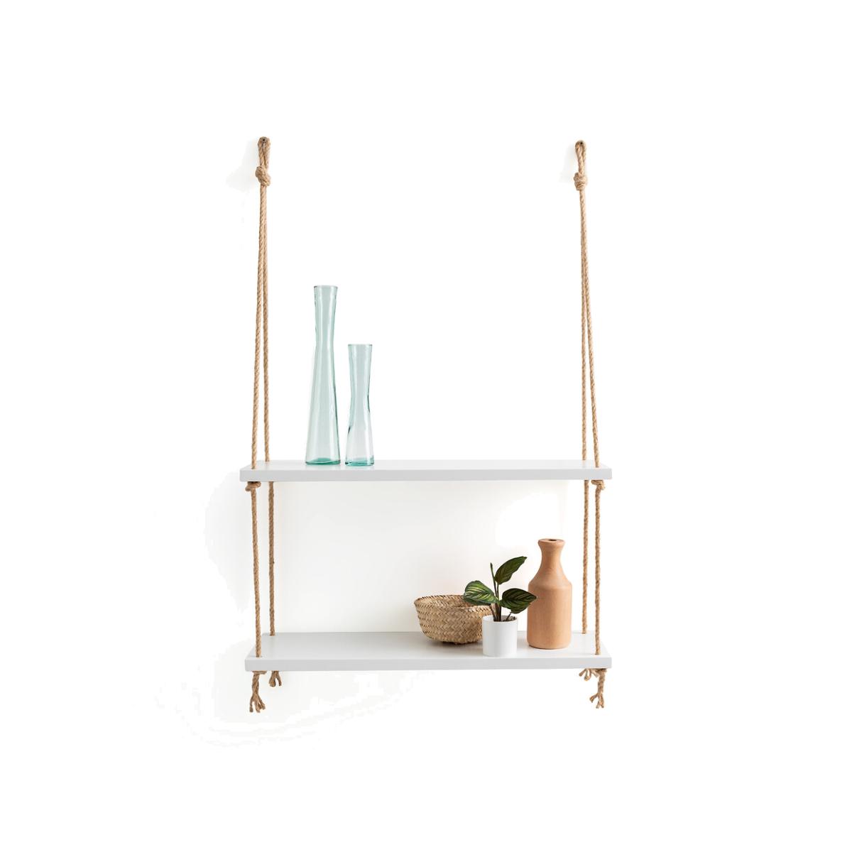 The Mareo double wall shelf. This simple and charming wall shelf has a seaside feel. Product Details • Made from FSC® certified MDF covered with white nitrocellulose paint • Sisal cord • Screws and plugs not included. Dimensions • Length: 60cm • Depth: 20cm • Total Height: 85cm • Height between the 2 shelves: 30cm • WOOD FROM SUSTAINABLY MANAGED FORESTS. FSC® certified wood comes from forests that are environmentally, socially and economically well managed. Parcel dimensions and weight:1 parcel • L66 x H9 x D24cm. 4.05kg