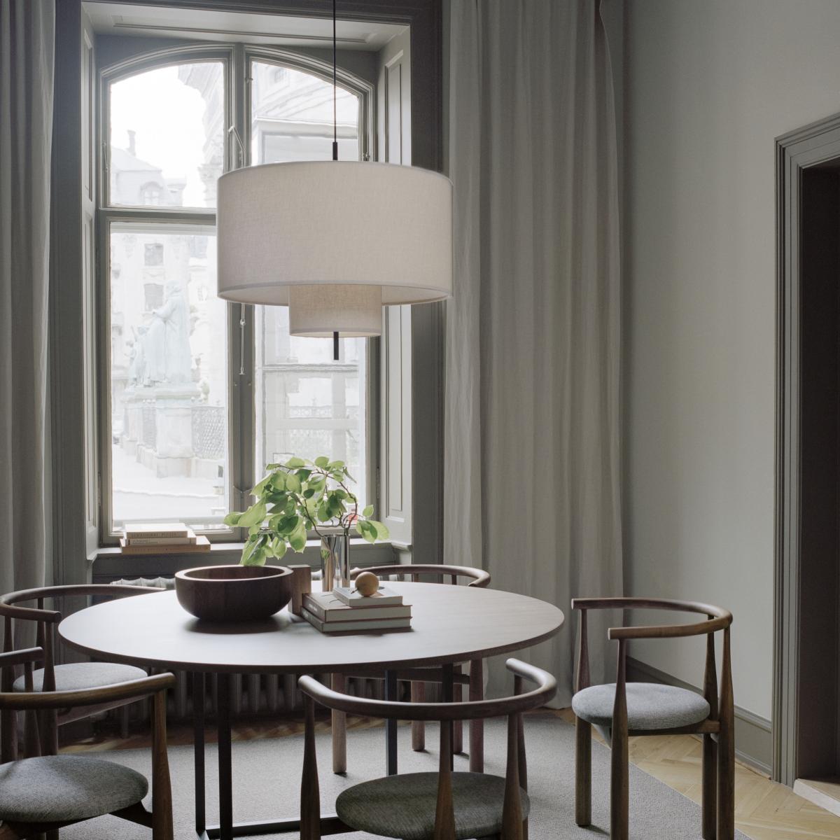 Designed by Swedish designer John Asbury, Margin is a modern interpretation of the classic stacked-shade luminaire. The Pendant is formed by two interlocking fabric cylinders. These simple, architectural shapes overlap to create beautiful volumes.