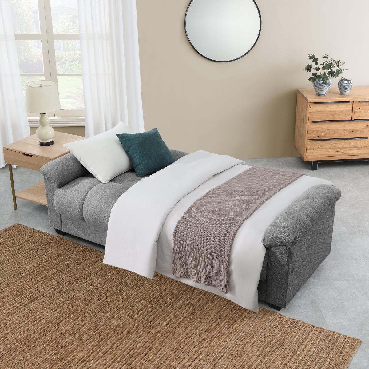 * Fabric Sofa Bed* Extra Storage Solution* 3 Seater Sofa, Double Mattress* Cup Holder included This 3-seater sofa effortlessly transforms into a bed in seconds, providing a comfortable sleeping space for your guests. What sets this sofa bed apart is its large storage compartment, designed to accommodate all your pillows, bed linen, and other storage needs, keeping your living space organised and clutter-free. Additionally, the sofa bed features a convenient fold-out table with a cup holder, allowing you to enjoy a great movie night with your favorite drinks and snacks within arm's reach. Perfect for cosy nights in and accommodating overnight guests, this sofa bed combines comfort, functionality, and style, making it an essential addition to your home. Please note, unfortunately we cannot deliver this item to the Channel Islands and Northern Ireland.