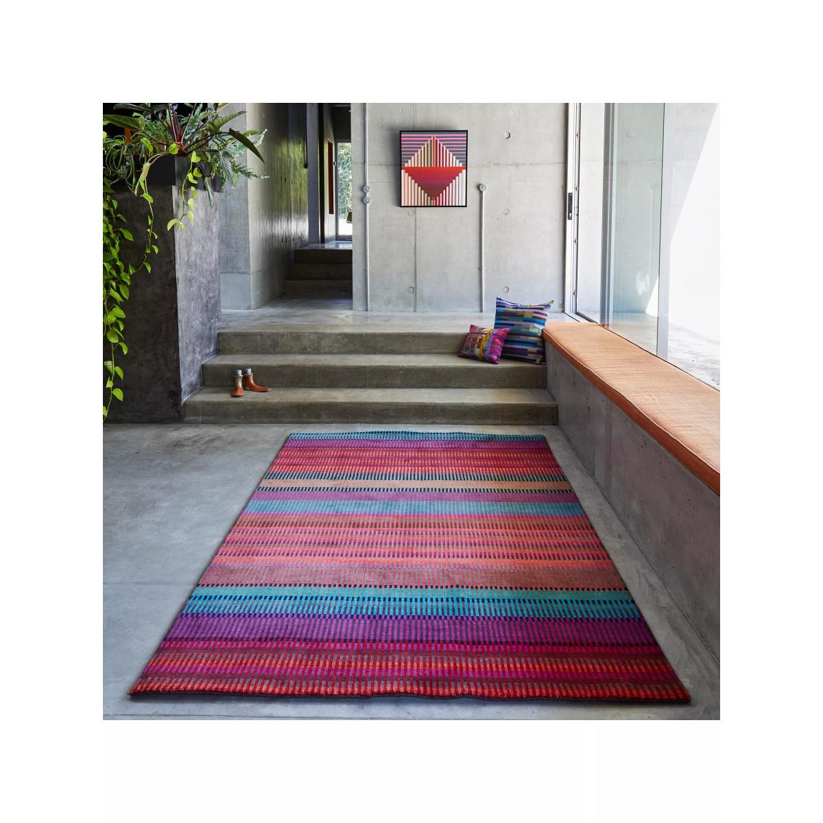 The dense and sumptuous Bridge rug has a textural stripe with a focus on reds and pinks. The design incorporates twelve curated vibrant colours, carefully chosen to complement and contrast with each other. The benefits of a wool rug Warm and durable, wool feels beautifully soft underfoot and is long-lasting Naturally flame-retardant and odour resistant Water repellent so easier to clean Naturally biodegradable, wool is part of the circular economy and contains no micro plastics This rug is loomed by hand, a traditional shuttle process in which material is laced together to create a strong and durable weave. About your new rug We recommend John Lewis & Partners Rug Hold Underlay. It prevents your rug from moving underfoot and protects against colour transfer to the floor As this rug is made using natural fibres, shedding is to be expected. This will reduce over time, and should not have an impact on the lifespan or performance of your rug. When you first get your rug, please use the brush attachment on your vacuum cleaner whilst the shedding dies down. After that, when vacuuming your rug, use suction only. Rotating brushes may damage the fibres. When vacuuming your rug, use suction only. Rotating brushes may damage the fibres Blot any spills with a clean, dry cloth. Do not rub or use harsh detergents. Attend to spillages immediately and blot with a clean, dry cloth to prevent staining. Dilute a small amount of appropriate carpet shampoo in water. Dampen a colourfast cloth in the diluted shampoo solution and dab the rug, lightly agitating, moving in the direction of the pile. Treat the whole rug and not just the affected area. To restore the appearance of the affected area, use a soft bristled brush to gently comb in the direction of the pile. Allow the rug to thoroughly dry.