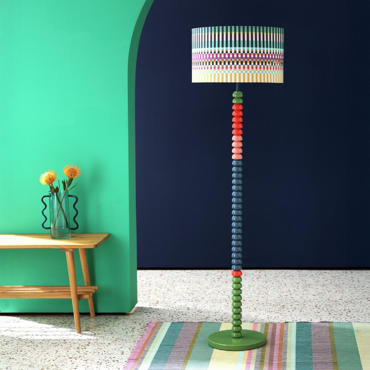 Our Buster floor lamp has been designed by Margo Selby, an award-winning British artist and textile designer. Inspired by the 'bobbin', a small spool to hold yarn in handweaving techniques, this striking lamp features a colourful wooden bobble stand with a shade in one of Margo's signature prints. It takes its name from Margo's grandpa, Buster, a pattern cutter on Saville Row. Designed by Margo Selby, exclusively for Habitat. Dimensions: Size H152, W40, Diameter 40cm. Diameter of base 28cm. Shade size H25, D 40cm. Cord length 2m. Bulb Information: Bulb required 1 x classic E27 edison screw LED (not included). 15 watts. LED bulb only. General Information: Shade material: fabric. Base material: rubberwood. Foot switch. IP 20. Minimal assembly. Product is mains powered plug in. This lighting product is a class 2 fitting. Weight 3.25kg. By choosing FSC certified products, you are supporting responsible management of the world's forests. Manufacturer's 1 year guarantee.