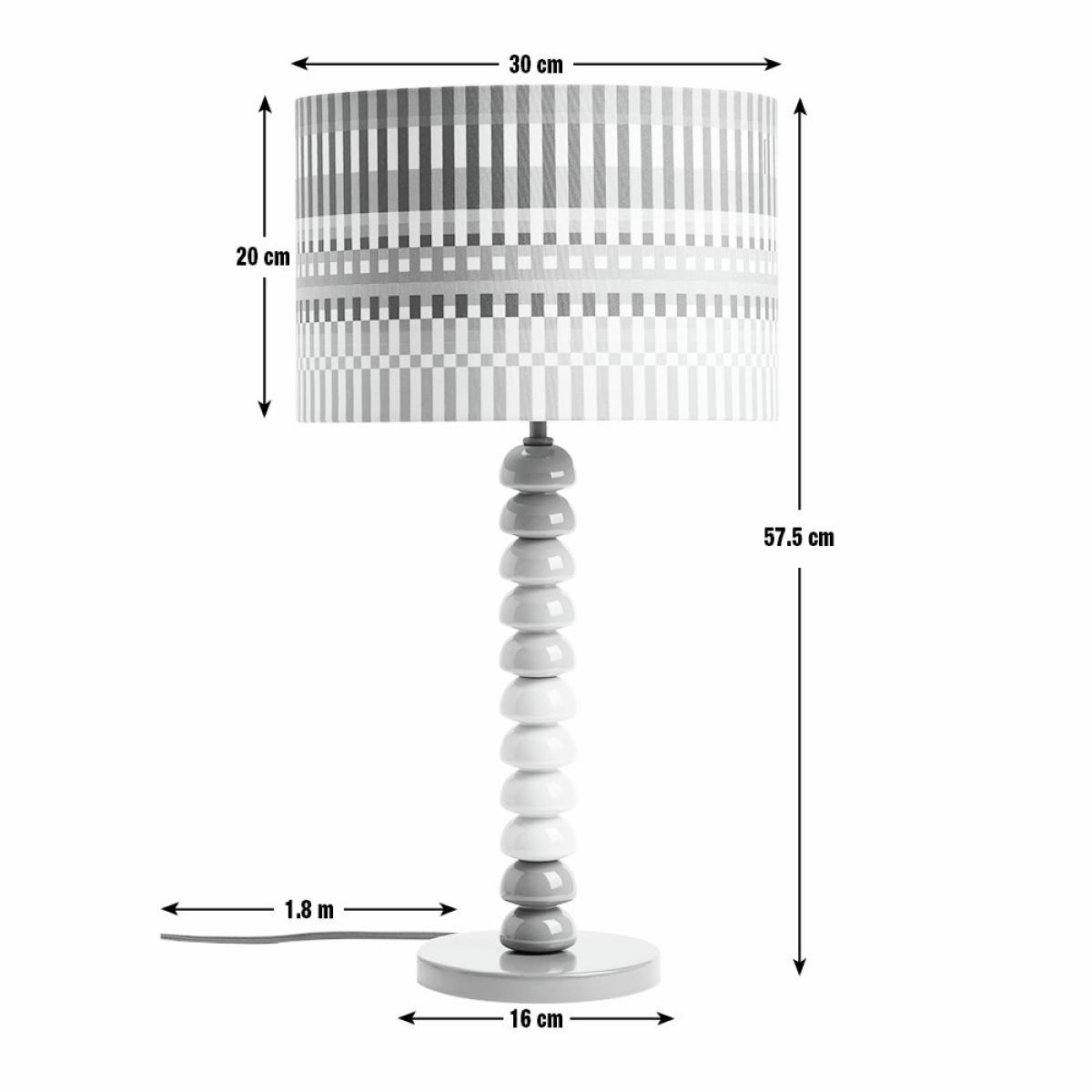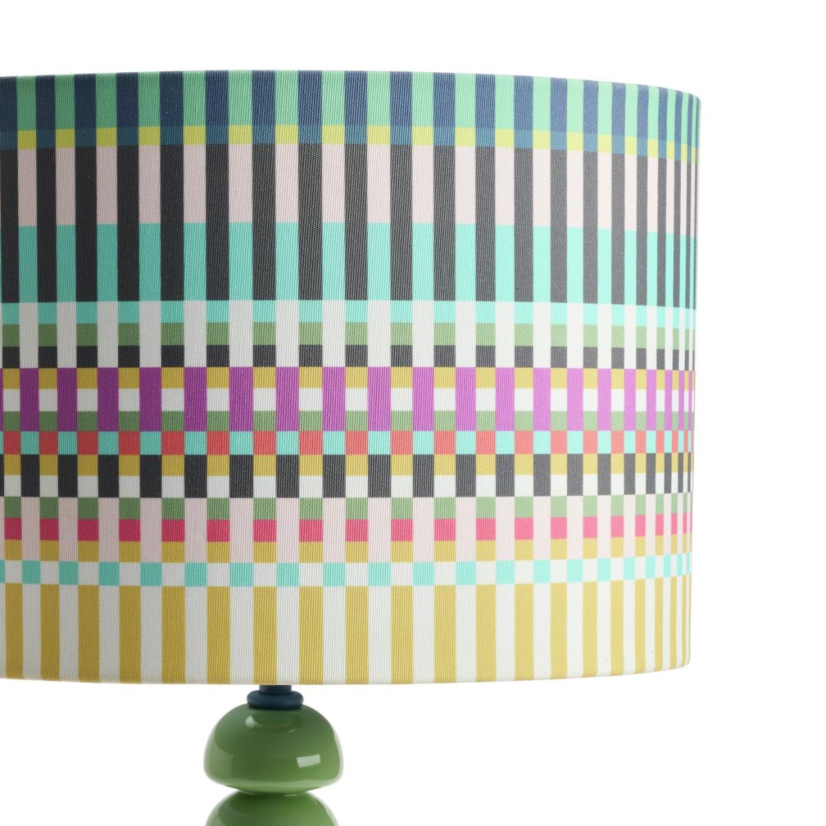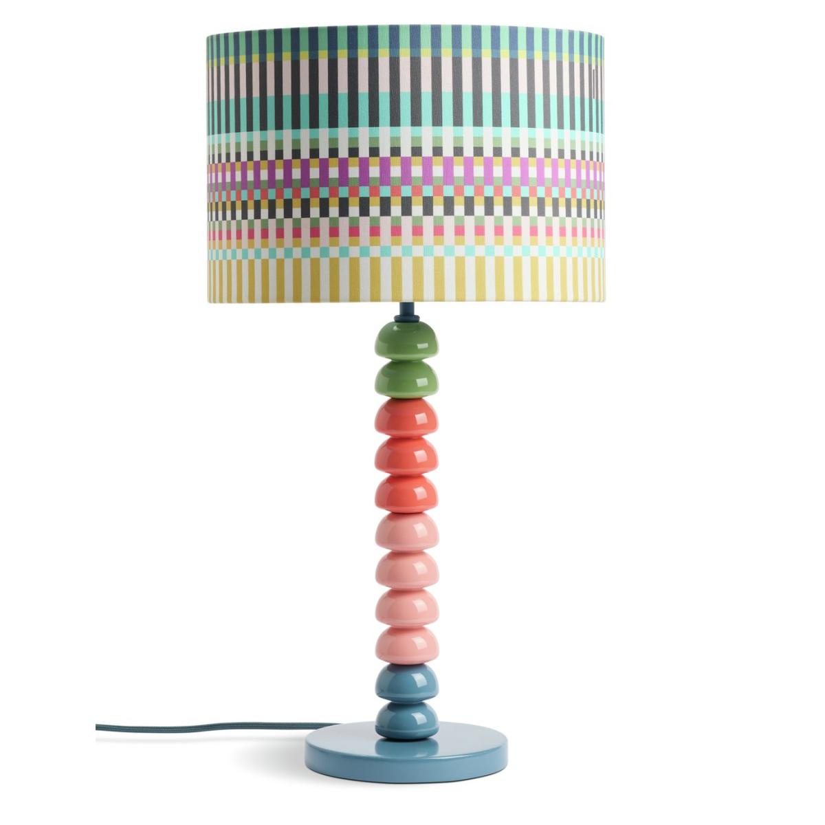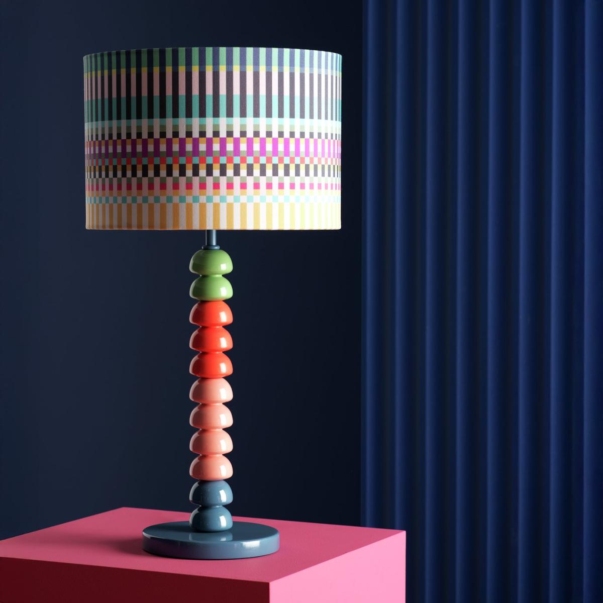 Our Buster table lamp has been designed by Margo Selby, an award-winning British artist and textile designer. Inspired by the 'bobbin', a small spool to hold yarn in handweaving techniques, this striking lamp features a colourful wooden bobble stand with a shade in one of Margo's signature prints. It takes its name from Margo's grandpa, Buster, a pattern cutter on Saville Row. Designed by Margo Selby, exclusively for Habitat. Dimensions: Overall size H57.5, W30cm. Diameter 30cm. Shade size H20, D30cm. Diameter of base 16cm. Cord length 1.8m. Bulb Information: Bulbs required 1 x classic E27 edison screw LED bulb(s)(not included). Recommended maximum wattage: 15 watts. LED bulb only. General Information: Shade colour: multicoloured. Base colour: multicoloured. Shade material: polyester. Base material: rubberwood. In-line switch. IP rating 20. Minimal assembly. Product is mains powered plug in. This lighting product is a class 2 fitting. Manufacturer's 1 year guarantee. By choosing FSC certified products, you are supporting responsible management of the world's forests.