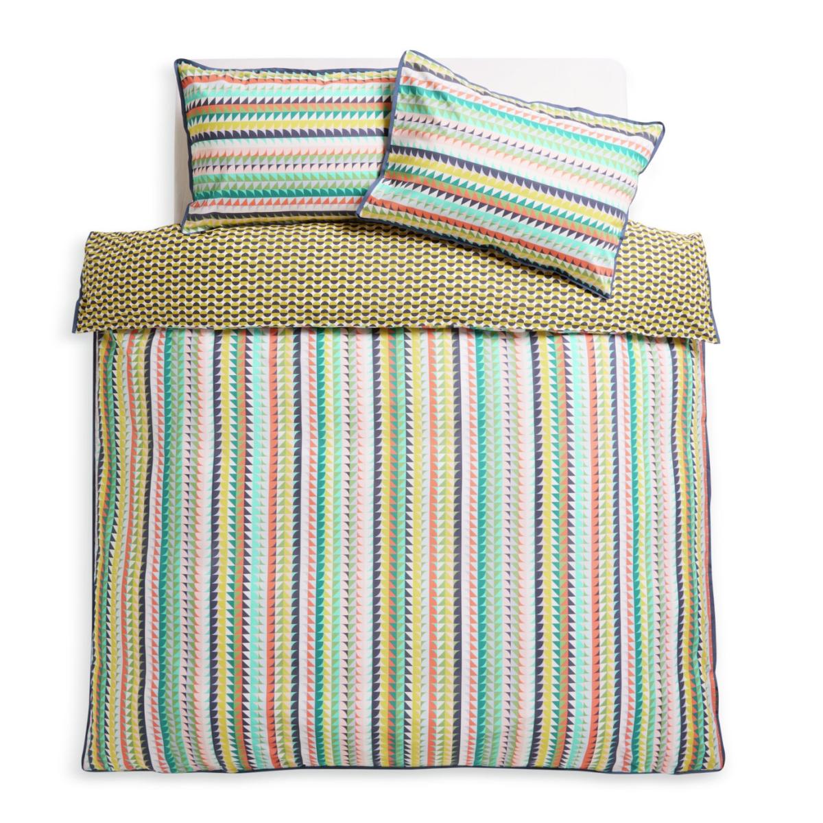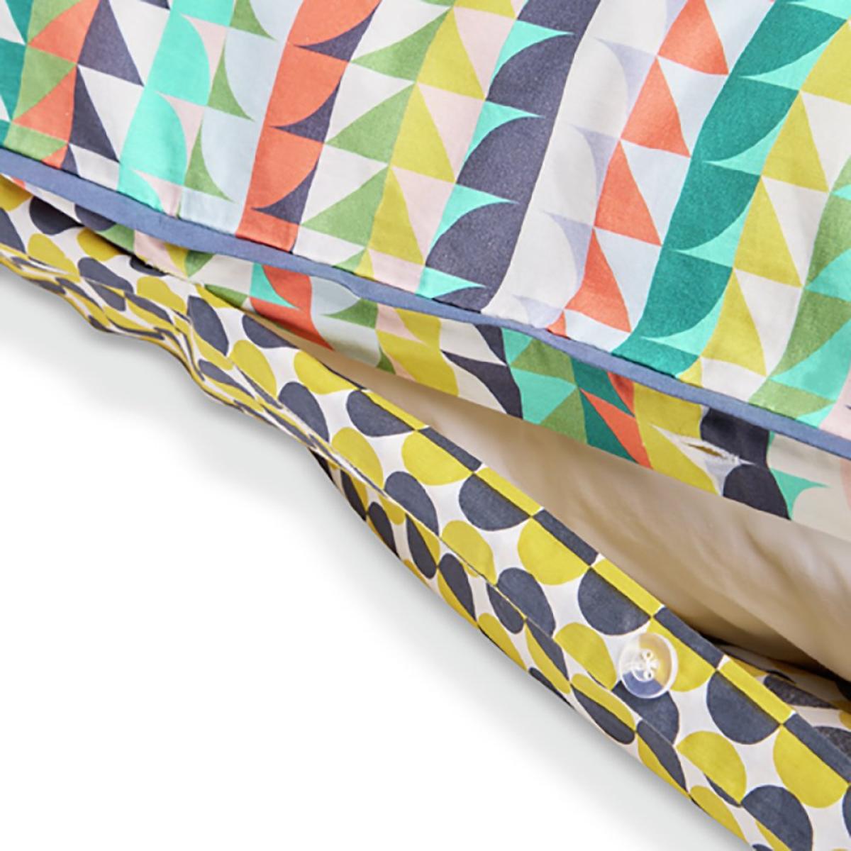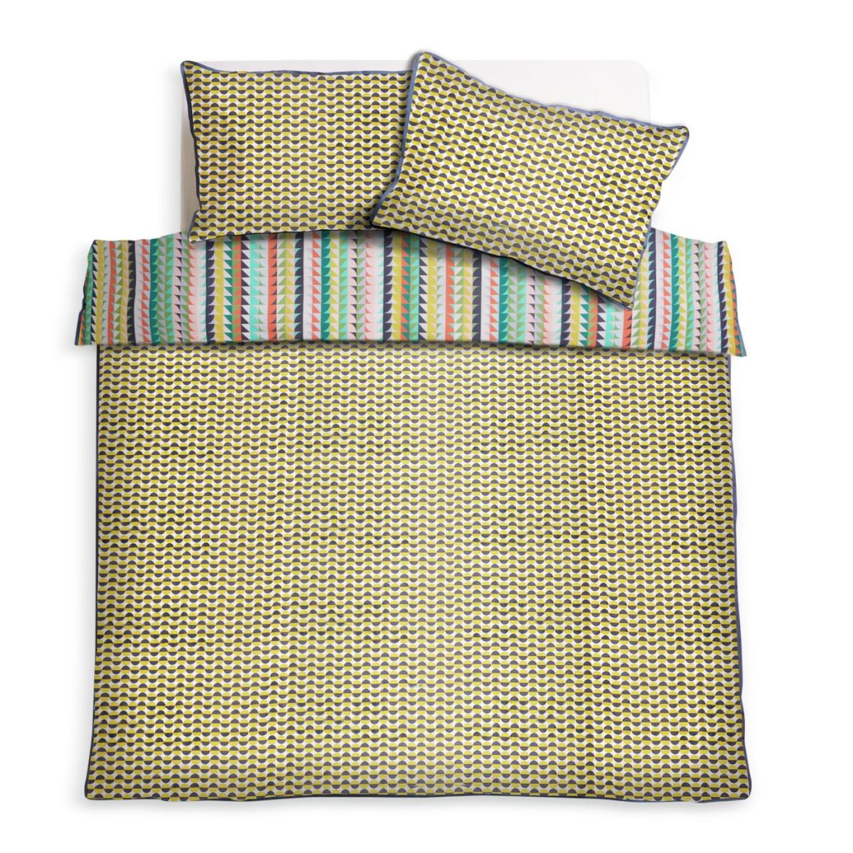 Our Heriward printed bedset, designed by Margo Selby, an award-winning British artist and textile designer, uses colour and layering to create a feathered geometric pattern on both sides. With contrasting piped edge detail and distinctive buttons featuring Margo's logo, the bold and uplifting colours will brighten up any bedroom. This set perfectly demonstrates Margo's joyful, distinctive use of colour and geometric design. Designed by Margo Selby, exclusively for Habitat. Fabric finish: printed. 100% cotton. 180 thread count. Set includes 1 duvet cover and 2 pillowcases. Bed size: king size. Length 220cm, Width 230cm. Buttons for fastening. Standard pillowcase (s). Pillowcase length 75cm, Width 50cm. Machine washable. Suitable for tumble drying.