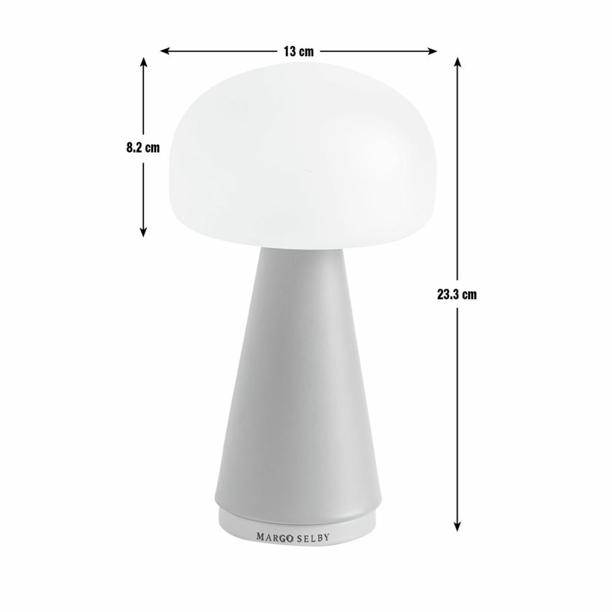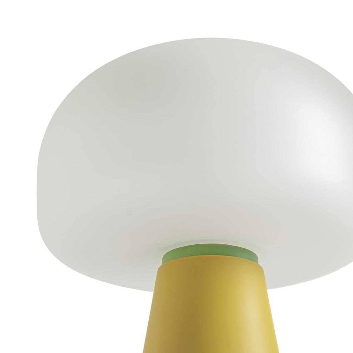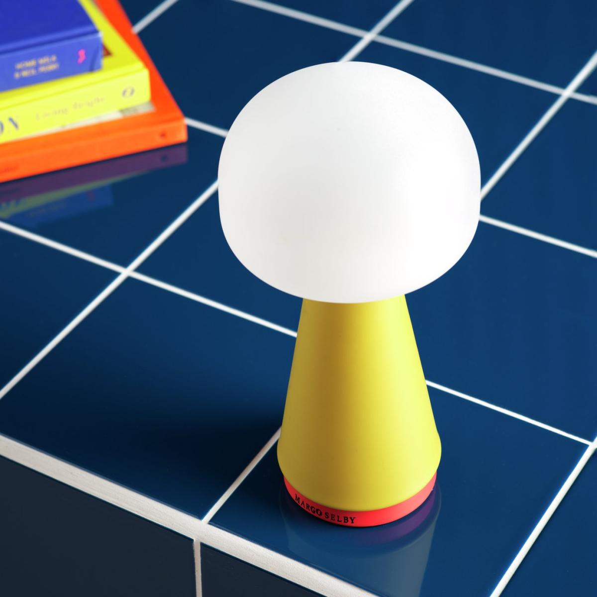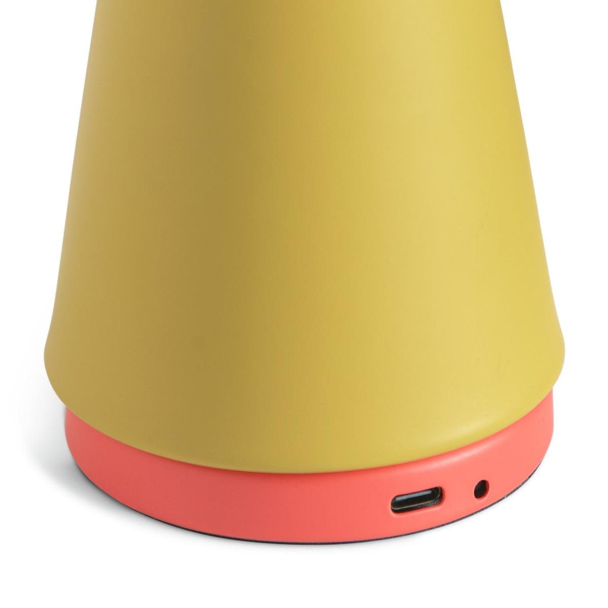 Our Hibberd rechargeable table lamp has been designed by Margo Selby, an award-winning British artist and textile designer. Inspired by the cones of yarn used in textile manufacturing, this striking lamp features a colourful, conical base and a frosted glass shade. Portable and perfect to use where plug sockets are out of reach like outdoor gatherings, as a dining table centre or up on a shelf. It has an on/off button on the base along with a 3-step dimmer. Designed by Margo Selby, exclusively for Habitat. Dimensions: Overall size H23.3, W13cm. Diameter 13cm. Shade size H8.2, D13cm. Diameter of base 13cm. Cord length 1m. Bulb Information: Bulbs required 1 x integrated LED bulb(s)(included). Recommended maximum wattage: 2 watts. Colour rendering index 80. Colour temperature 3000. K. Rated luminous flux 100. General Information: Shade colour: white. Base colour: yellow. Shade material: glass. Base material: metal. USB charging. Battery life from single charge: 8 Hours. Touch sensor - 4 stage touch control. IP rating 20. Minimal assembly. Product is battery powered. This lighting product is a class 3 fitting. Manufacturer's 1 year guarantee.
