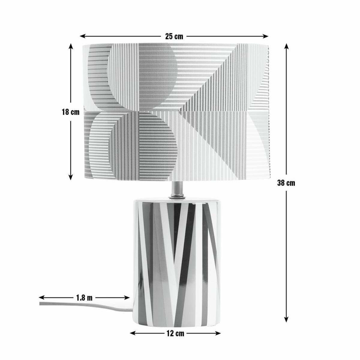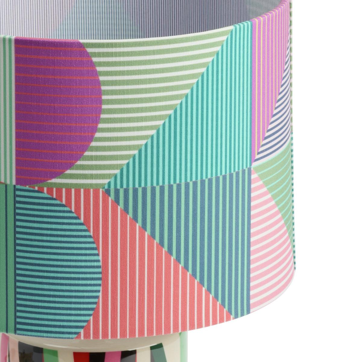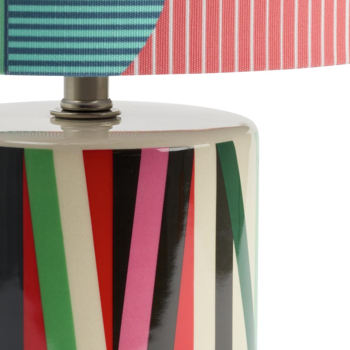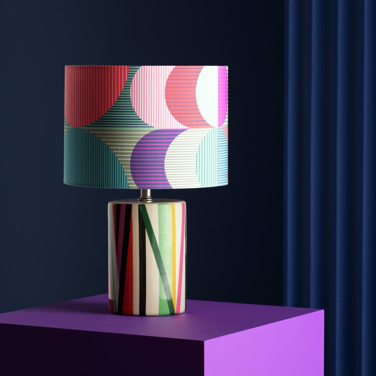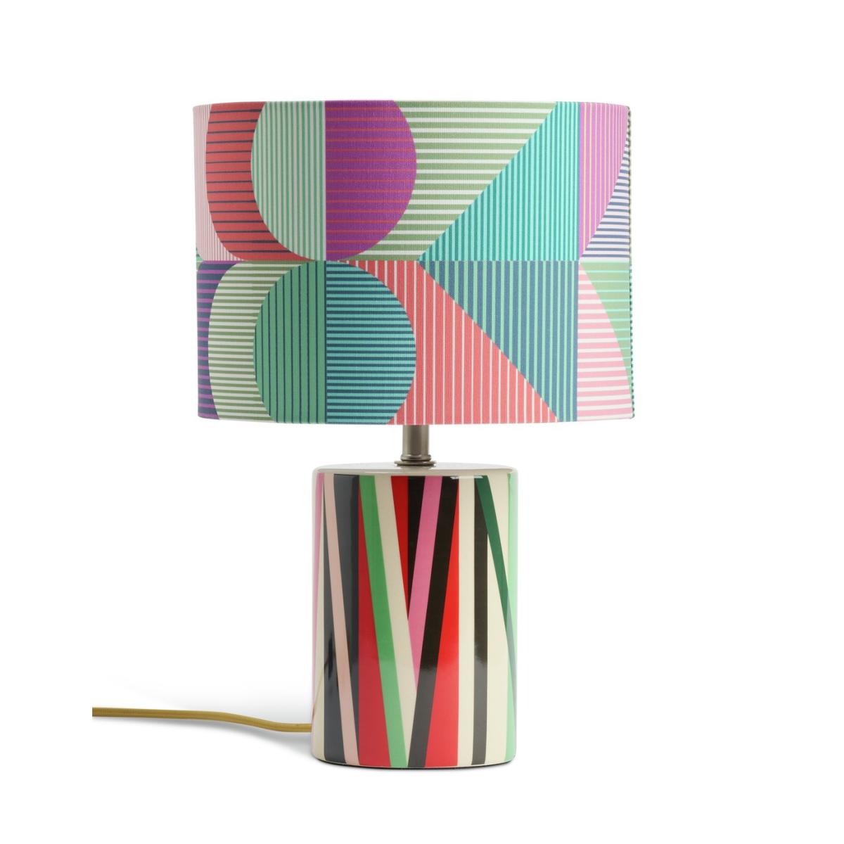 Our Ned table lamp has been designed by Margo Selby, an award-winning British artist and textile designer. With its joyful, distinctive use of colour and geometric pattern on the shade and vibrant signature print on the base, it perfectly demonstrates Margo's ability to create accessories that uplift and refresh instantly. Designed by Margo Selby, exclusively for Habitat. Dimensions: Overall size H38, W25cm. Diameter 25cm. Shade size H18, D25cm. Diameter of base 12cm. Cord length 1.8m. Bulb Information: Bulbs required 1 x candle E14 small edison screw LED bulb(s)(not included). Recommended maximum wattage: 10 watts. LED bulb only. General Information: Shade colour: multicoloured. Base colour: multicoloured. Shade material: polyester. Base material: stoneware. In-line switch. IP rating 20. Minimal assembly. Product is mains powered plug in. This lighting product is a class 2 fitting. Manufacturer's 1 year guarantee.
