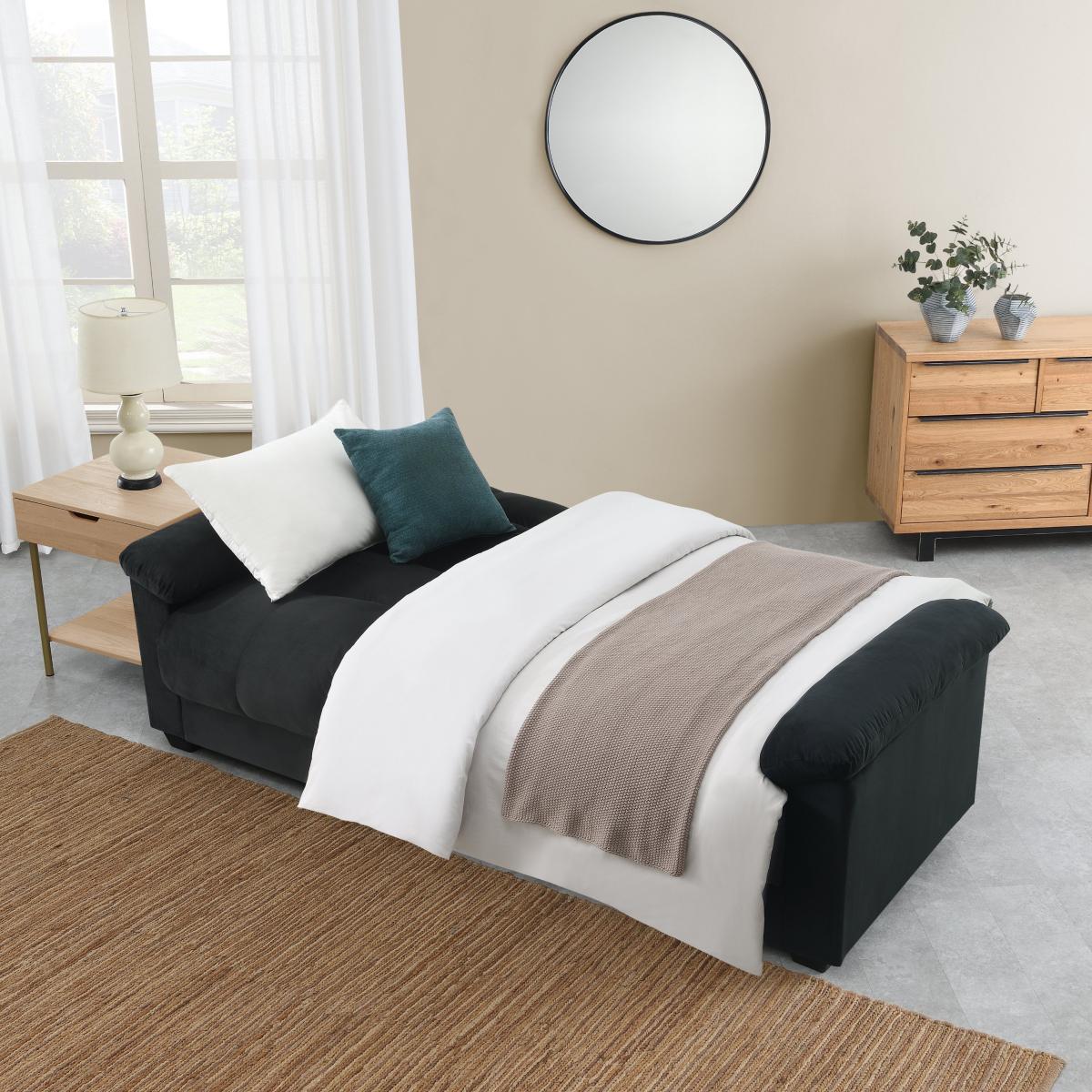 * Velvet Sofa Bed* Extra Storage Solution* 3 Seater Sofa, Double Mattress* Cup Holder included This 3-seater sofa bed seamlessly combines elegance with practicality, offering both comfort and convenience. Upholstered in sumptuous velvet fabric, this sofa bed exudes opulence and sophistication, adding a touch of glamour to your home decor. With its effortless transformation into a comfortable bed, it provides a cosy sleeping space for your guests in seconds. What sets this sofa bed apart is its large storage compartment, thoughtfully designed to accommodate all your pillows, bed linen, and other storage needs, ensuring your living space remains clutter-free and organised. Additionally, the sofa bed features a fold-out table with a cup holder, allowing you to enjoy your favourite drinks and snacks while relaxing or watching a movie.