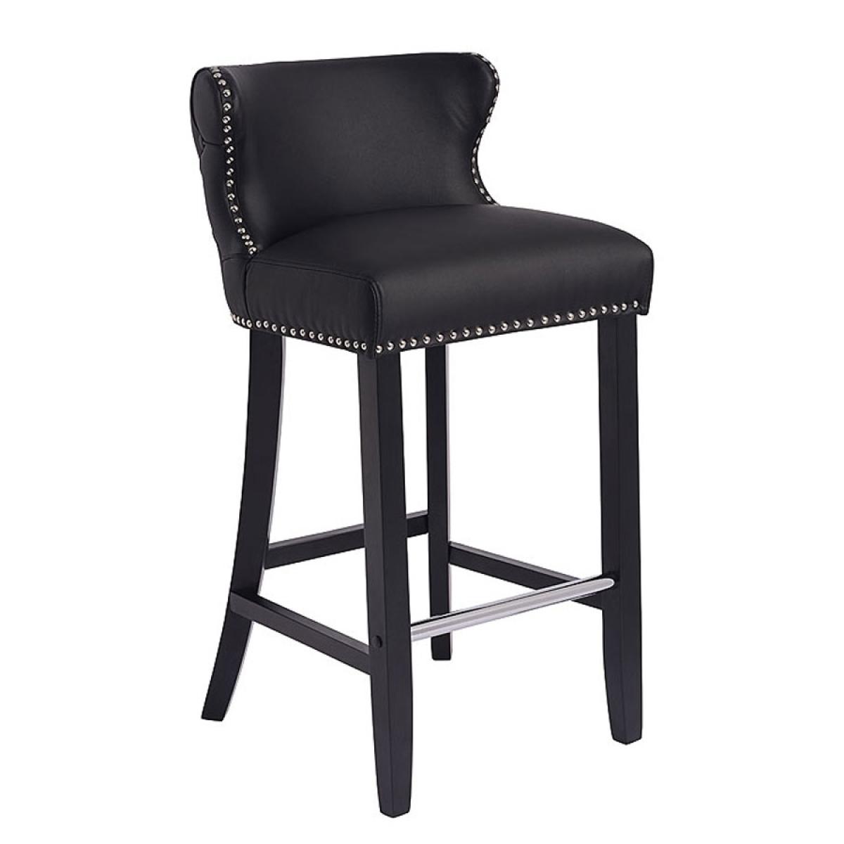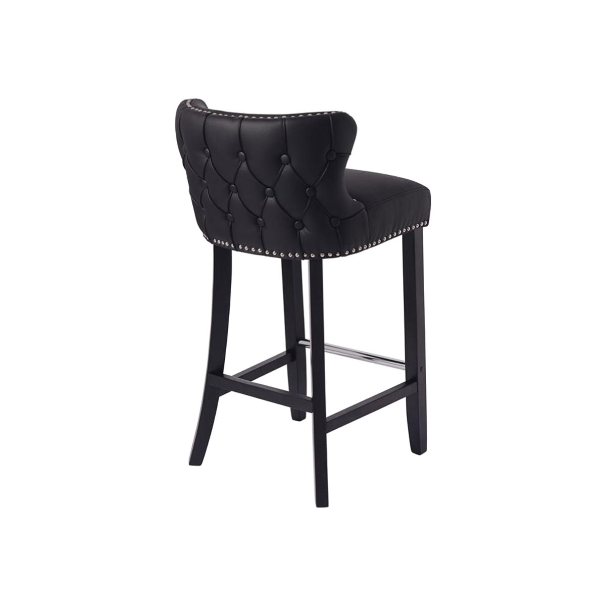 Distinctive buttoning to the back gives character to this elegant bar stool. Comfortable foam seat with sprung webbing. Stained solid ash legs. Polished chrome footrest and upholstery tacks. Minimal assembly required, simply attach legs.