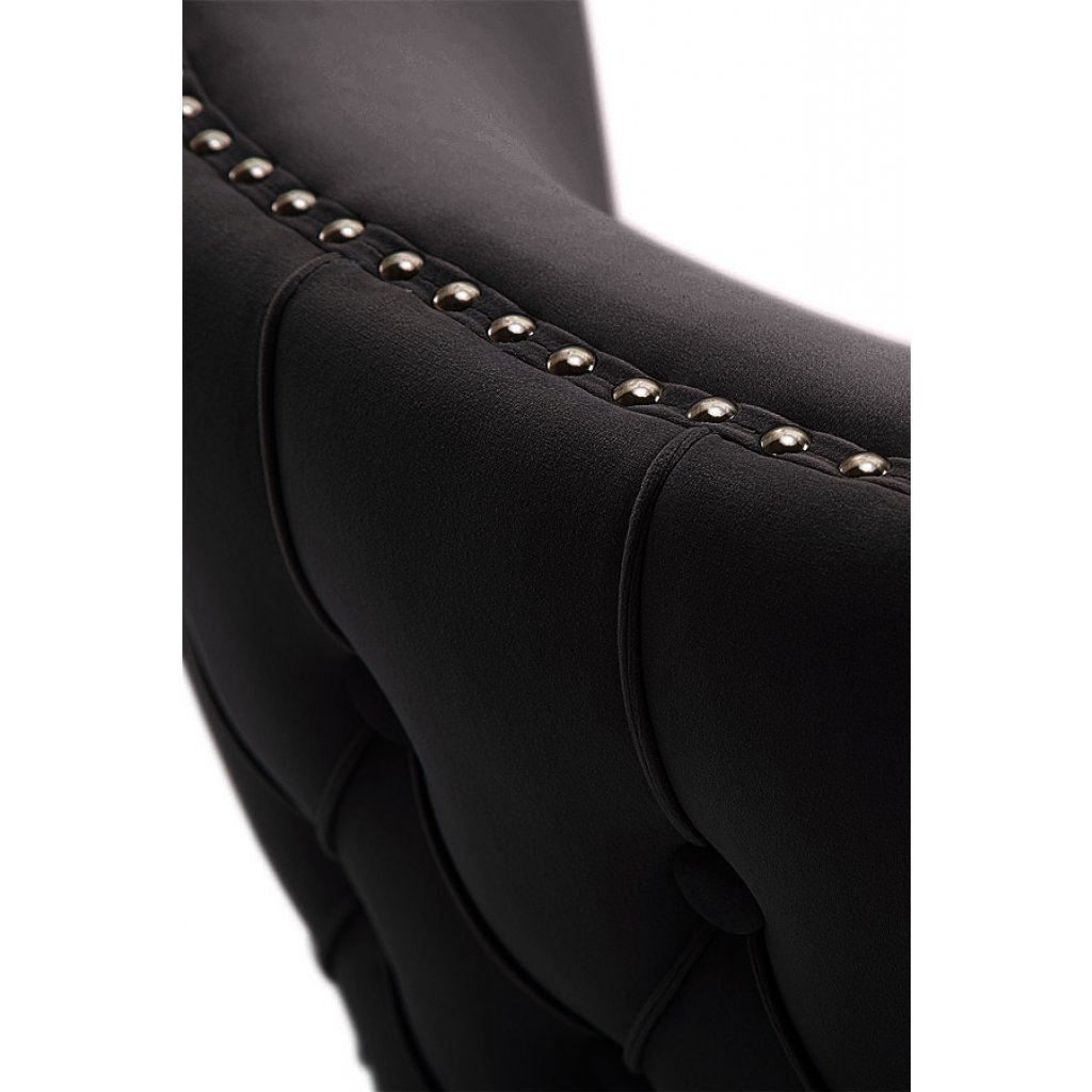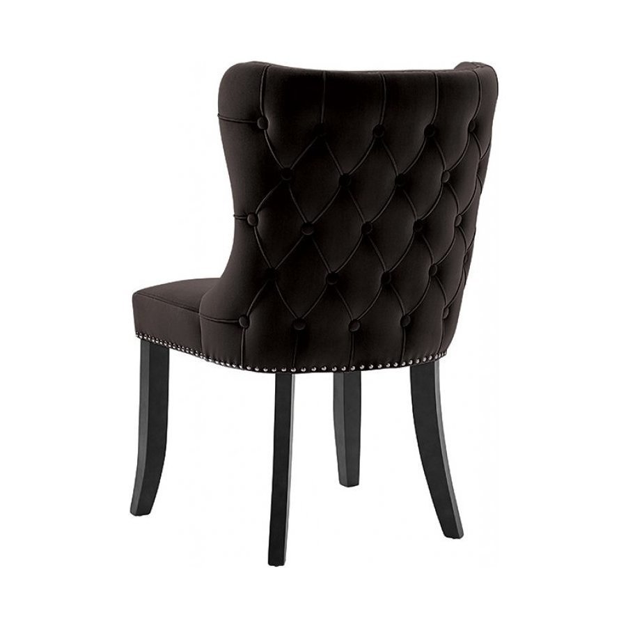 Distinctive buttoning to the back gives character to this elegant chair. Finely tailored velvet upholstery with beautiful pinched pleat detailing and deep buttoning. Comfortable foam seat with sprung webbing. Stained solid ash legs. Minimal assembly required, simply attach legs.