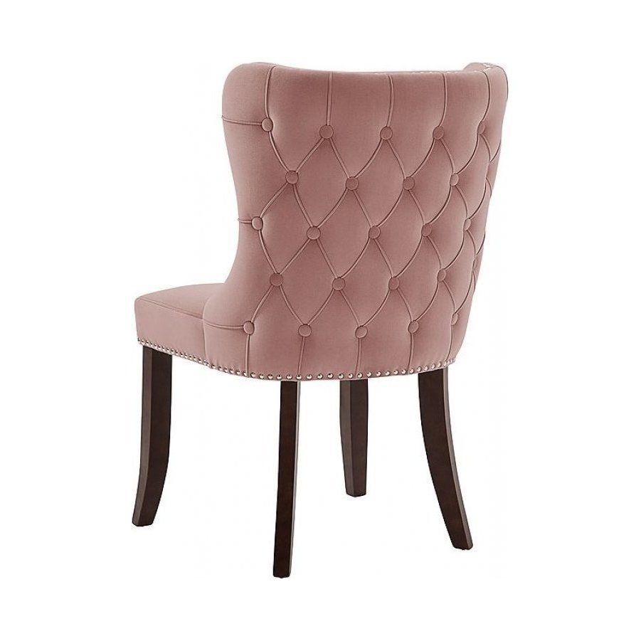 Distinctive buttoning to the back gives character to this elegant chair. Finely tailored velvet upholstery with beautiful pinched pleat detailing and deep buttoning. Comfortable foam seat with sprung webbing. Stained solid ash legs. Minimal assembly required, simply attach legs.