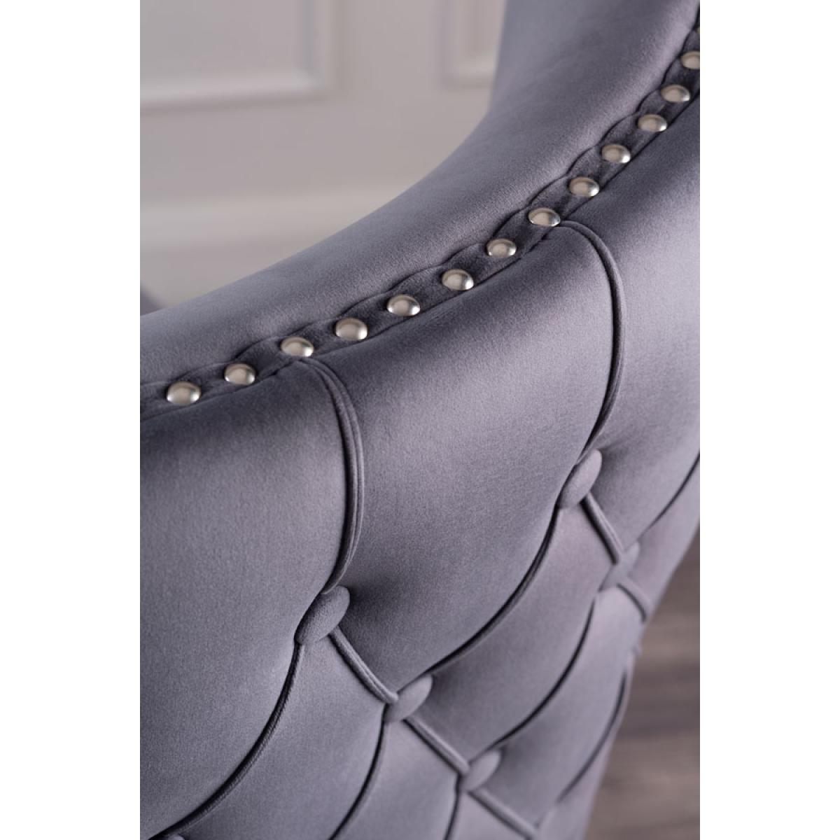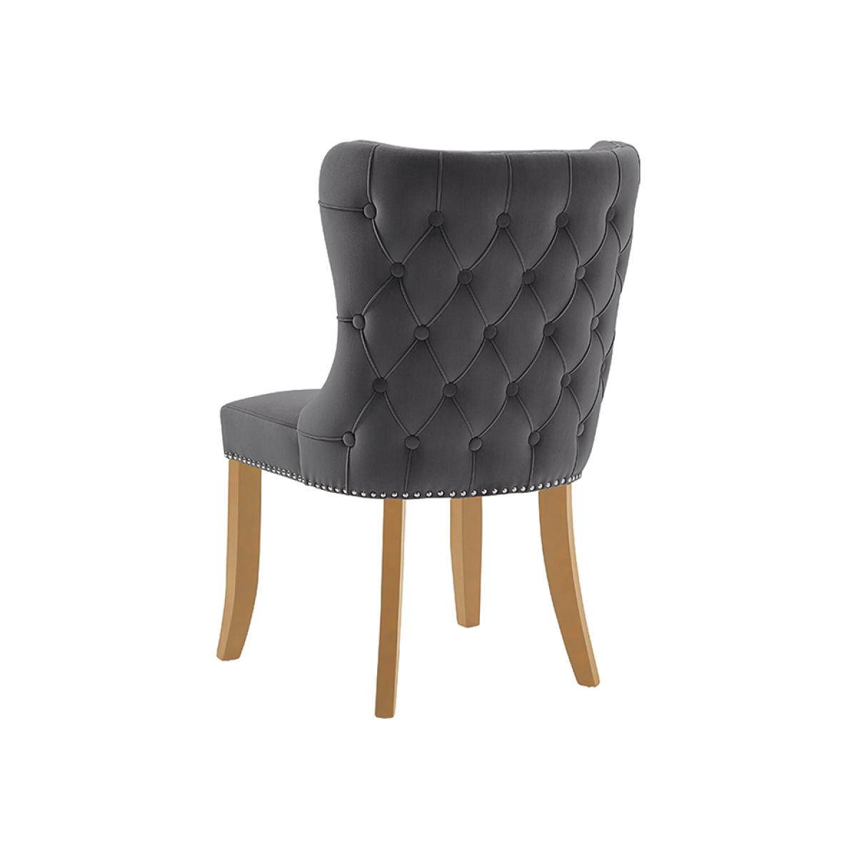Distinctive buttoning to the back gives character to this elegant chair. Finely tailored velvet upholstery with beautiful pinched pleat detailing and deep buttoning. Comfortable foam seat with sprung webbing. Stained solid ash legs. Minimal assembly required, simply attach legs.
