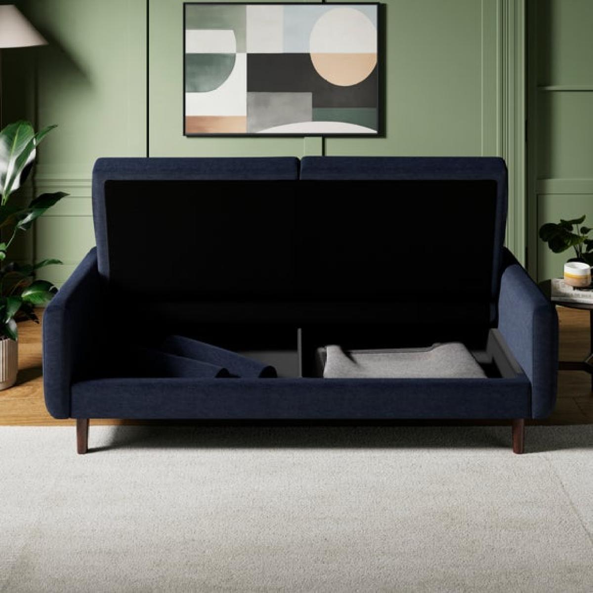 * Modern sofa bed * Rounded arms * Button details * Storage under seat * Clic Clac mechanism This versatile and stylish clic-clac sofa bed features a modern rounded arm design, complete with a button-back for added sophistication. Upholstered in soft chenille, it offers a timeless look that fits effortlessly into various interiors. The built-in storage beneath the seat adds extra practicality, perfect for stowing away bedding or other essentials.