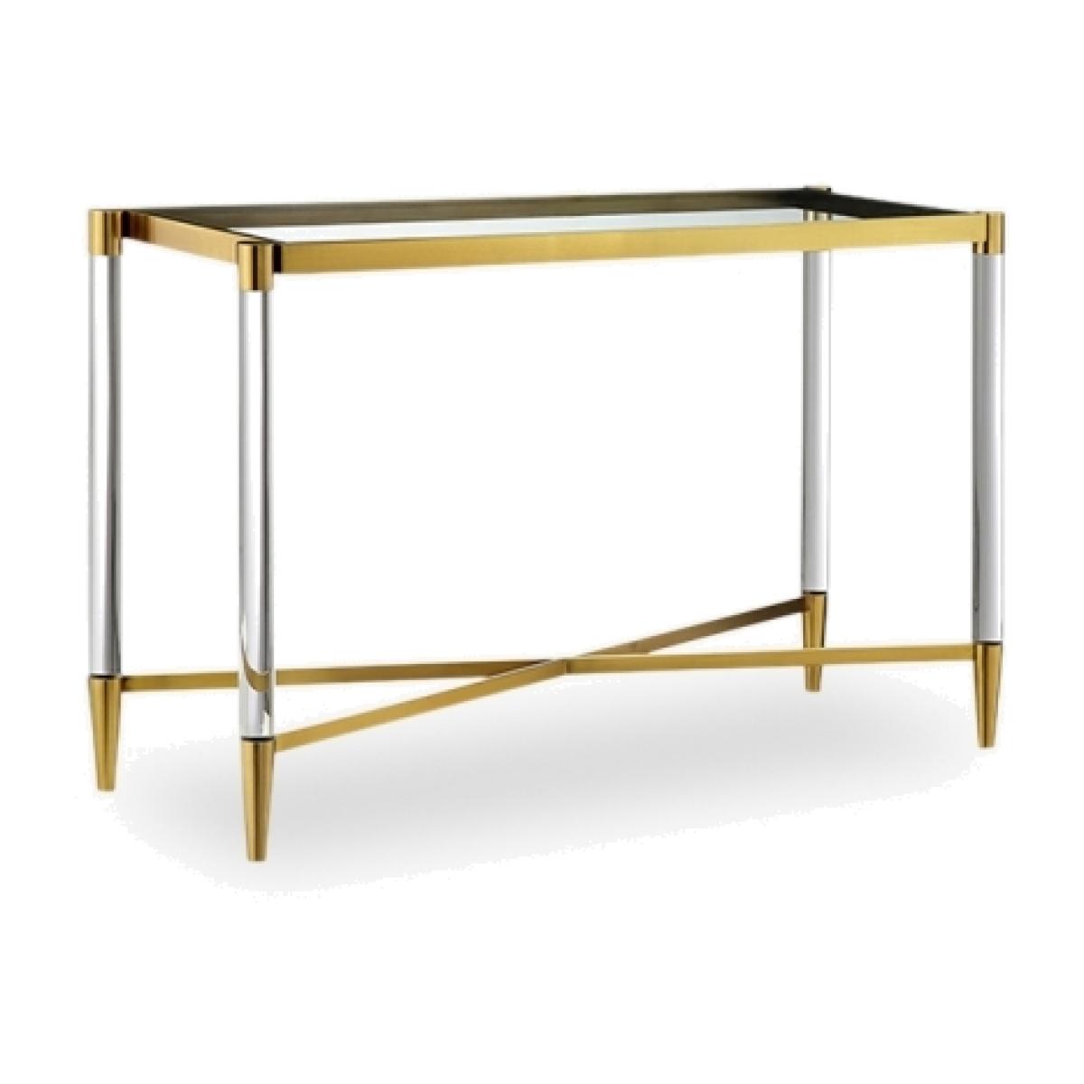 With that polished brass metal frame, the Margot Collection is a luxe design personified. Art Deco accents in the form of glamourous brass and clear acrylic frame, the Margot console table is a highly polished and contemporary piece of furniture for your living room or hallway. With a tempered glass top, you know your prized possessions are in safe hands. Table Top Material: Glass Leg Material: Metal, Acrylic Assembly: Partial Assembly Required Care: Wipe clean with a dry cloth Dimensions Total Size: H 76 x W 120 x D 42cm Weight: 24kg Packing Dimensions: 5 x 13 x 3cm. Buy your Margot Console Table, Brass from a wide range of Furniture, Tables, Kitchen & Dining Room Tables