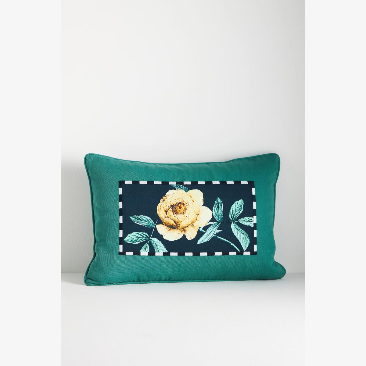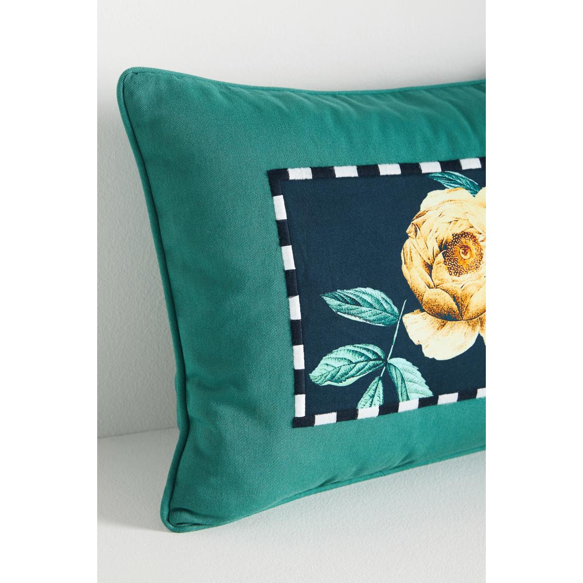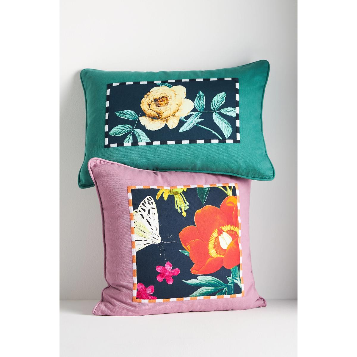 The Margot Cushion, showcasing a framed floral design, brings a touch of timeless elegance and botanical charm to any seat or bed. Margot Cushion by Anthropologie in Blue Size: 14" x 20"