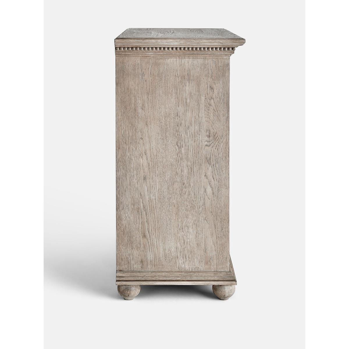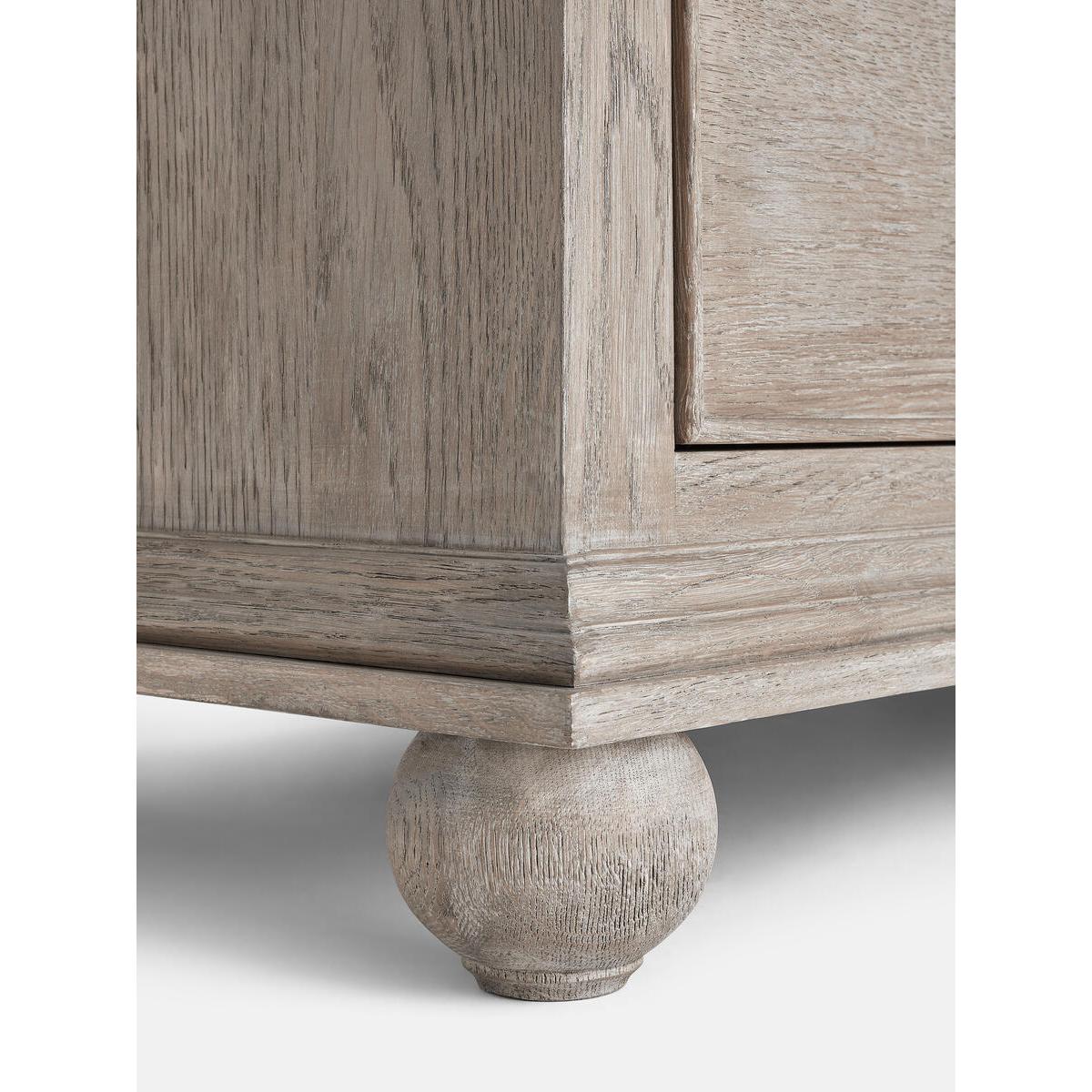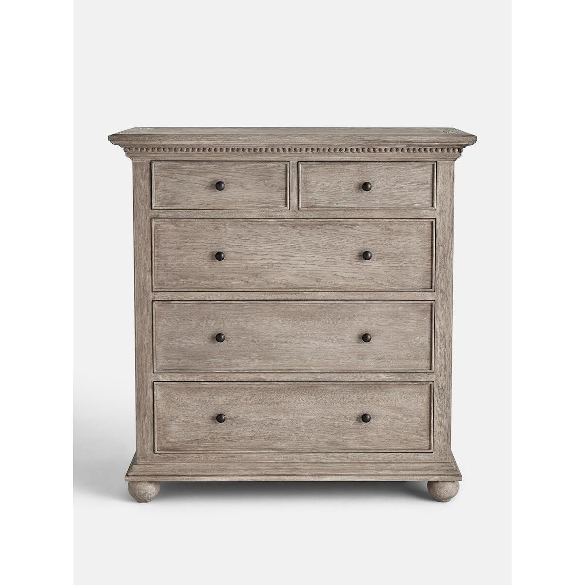 Referencing the natural, country feel of Soho Farmhouse, the oak wood Margot five drawer dresser is fitted with three deep drawers and two shallow top drawers, ideal for small items and accessories. Anchored by solid oak bun feet, the grey-washed dresser is hand-finished with beaded detail, a mitred top and blackened brass handles for a contrast in texture. Grey-washed oak wood dresser Five drawers Three deep drawers Two shallow top drawers Solid oak bun feet Beaded detail Mitered top Blackened brass handles