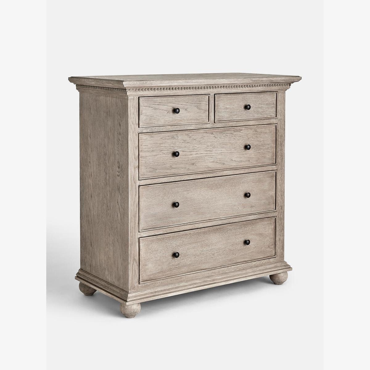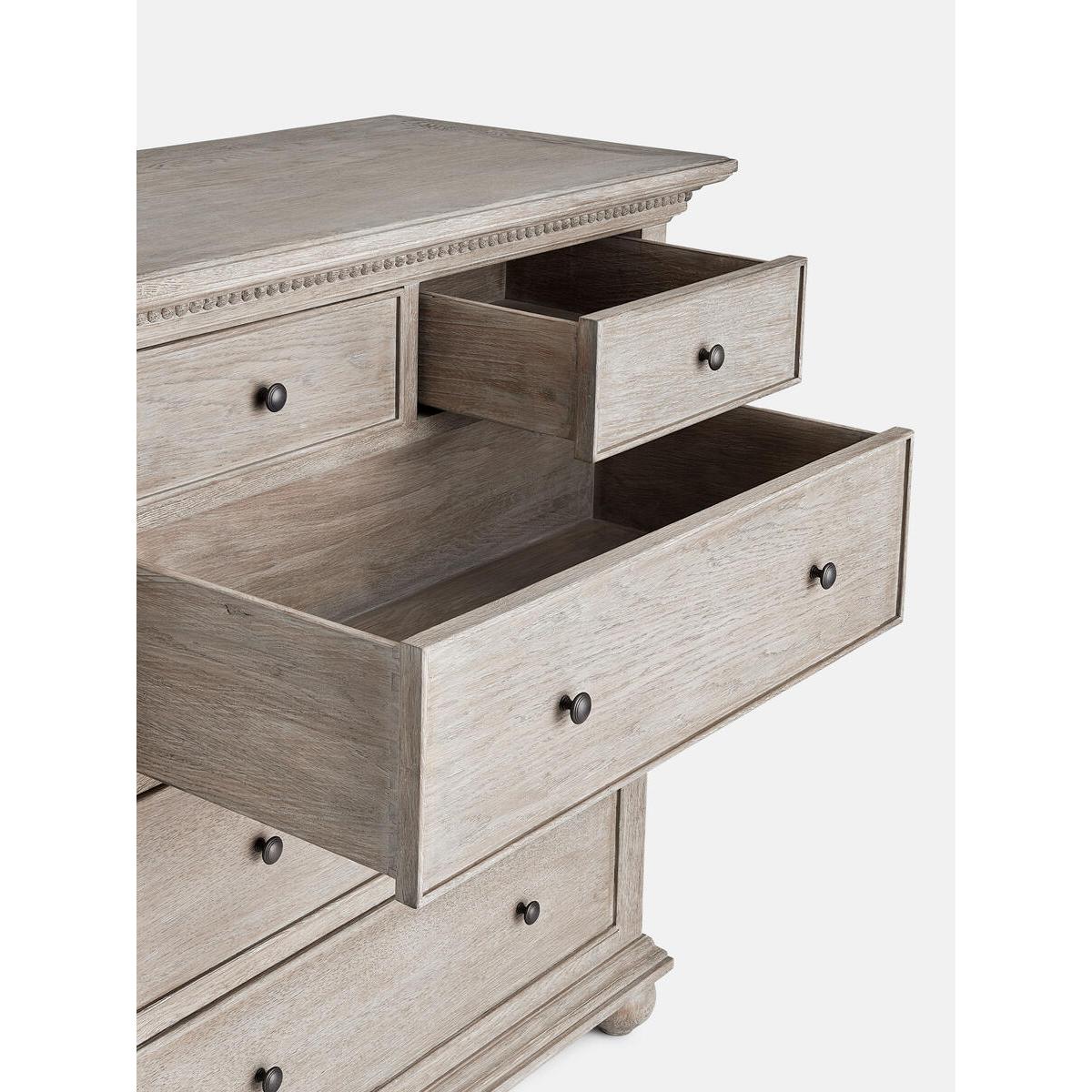 The five drawer dresser is a versatile piece that adds a touch of classic charm to various interiors. I love how its neutral, slightly weathered finish makes it adaptable for both modern and traditional spaces, from bijou bedrooms to rustic country homes. When styling, consider pairing it with brass or black hardware for contrast, or keep it understated with soft, natural textiles. It works particularly well with layered textures and muted colour palettes, creating a relaxed yet refined look. For practical tips, try using the top for decorative accents like vases or framed photos, keeping clutter to a minimum for a sleek appearance. Overall, it’s an understated piece that offers both functionality and style with ease.