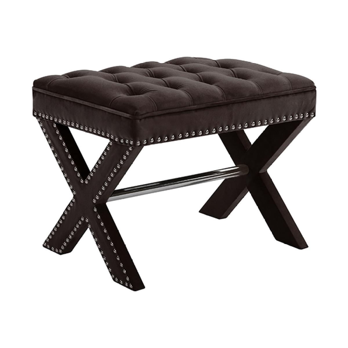 A distinctive stool featuring a fully upholstered cross leg design. Chrome upholstery tacks. Chrome cross brace. Deep buttoned finish. Velvet fabric.