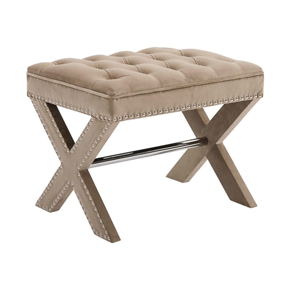 A distinctive stool featuring a fully upholstered cross leg design. Chrome upholstery tacks. Chrome cross brace. Deep buttoned finish. Velvet fabric.