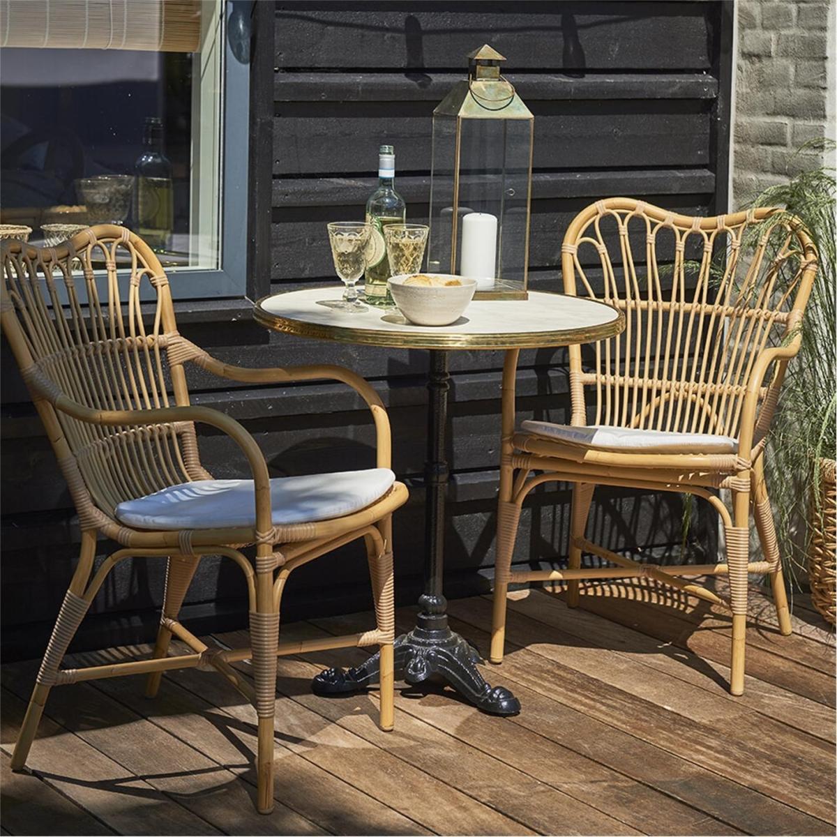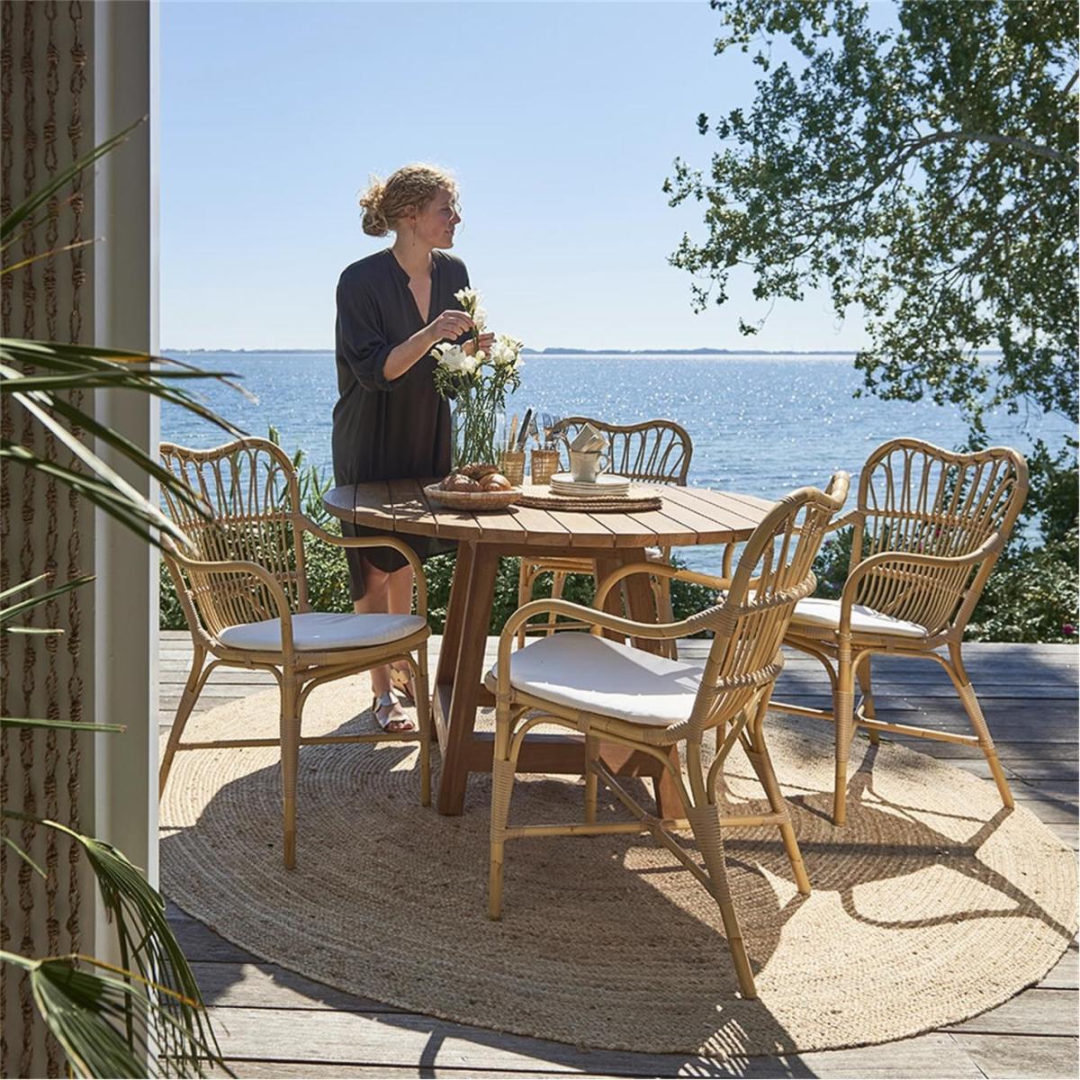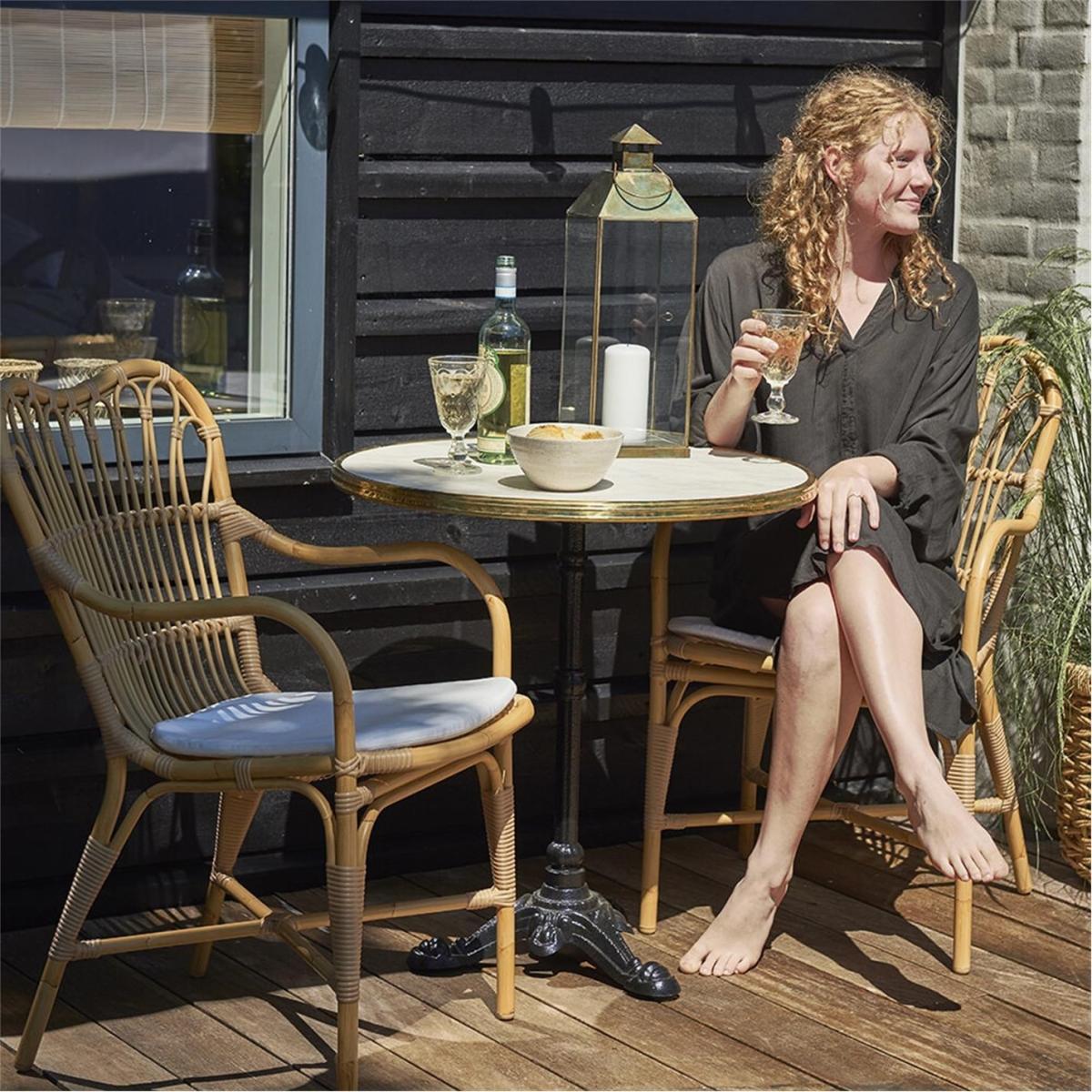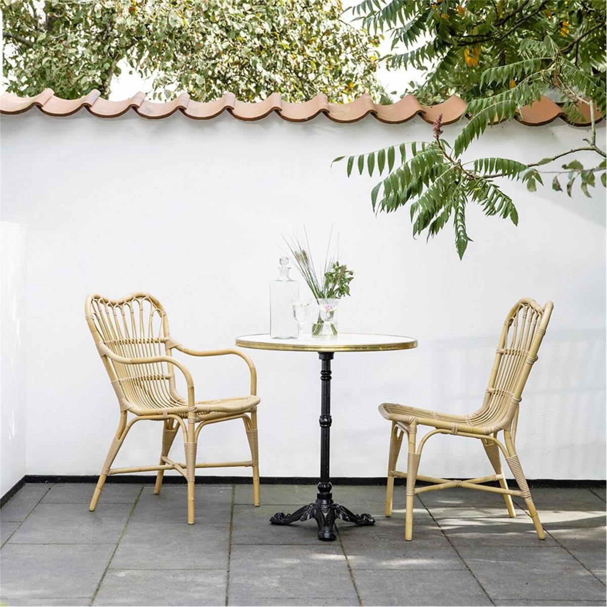 The Margaret Outdoor Dining Chair is crafted from Alu-Rattan and Art Fibre elements. Alu-Rattan is composed of powder-coated aluminium that is weather-resistant, while Art Fibre is an artificial fibre made of polyethene that is maintenance-free and can endure the sun's UV rays. The weather-resistant materials used in the chair's construction make it durable enough to withstand the elements all year long without requiring any upkeep.