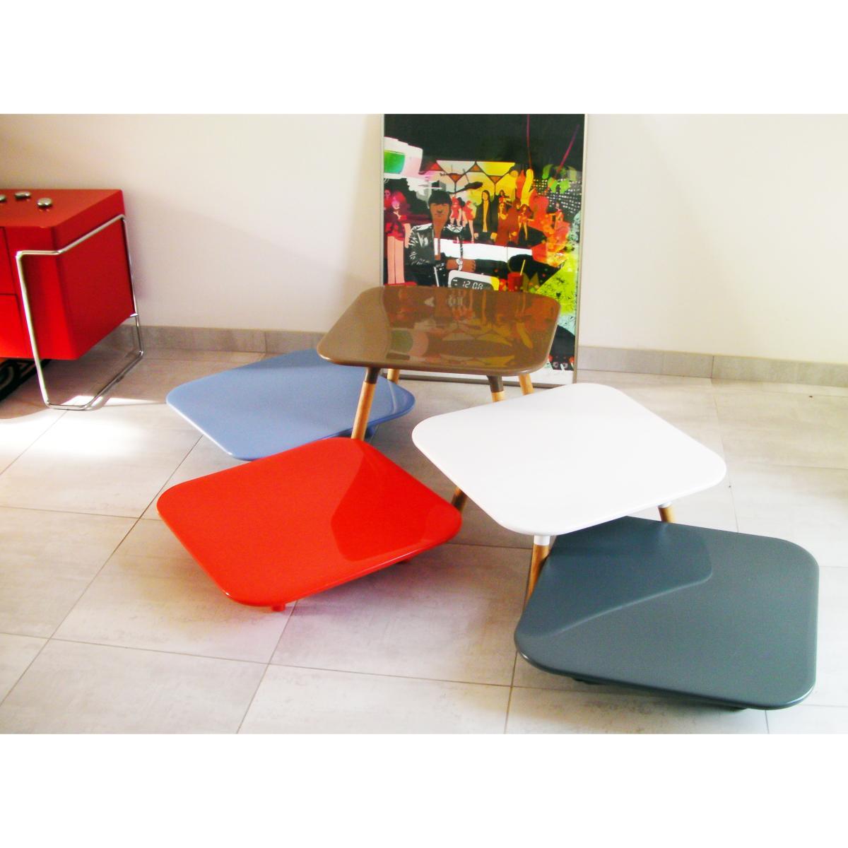 Marguerite tables are a mix of retro lines and scandinavian design wedding shapes and materials. This table lacquered tray, square and round belly, let rise based on its four legs that extend and finish in wood - an alliance vintage aesthetic atmosphere, trendy. Two formats are available, to be used alone or pull, and five colors to meet the needs and desires.