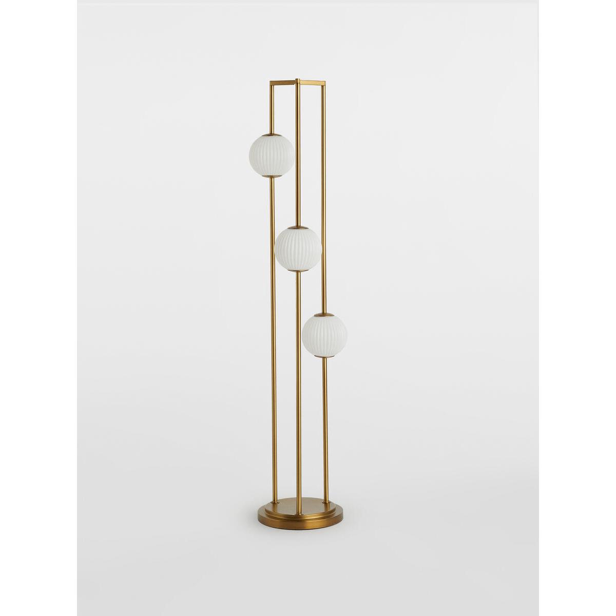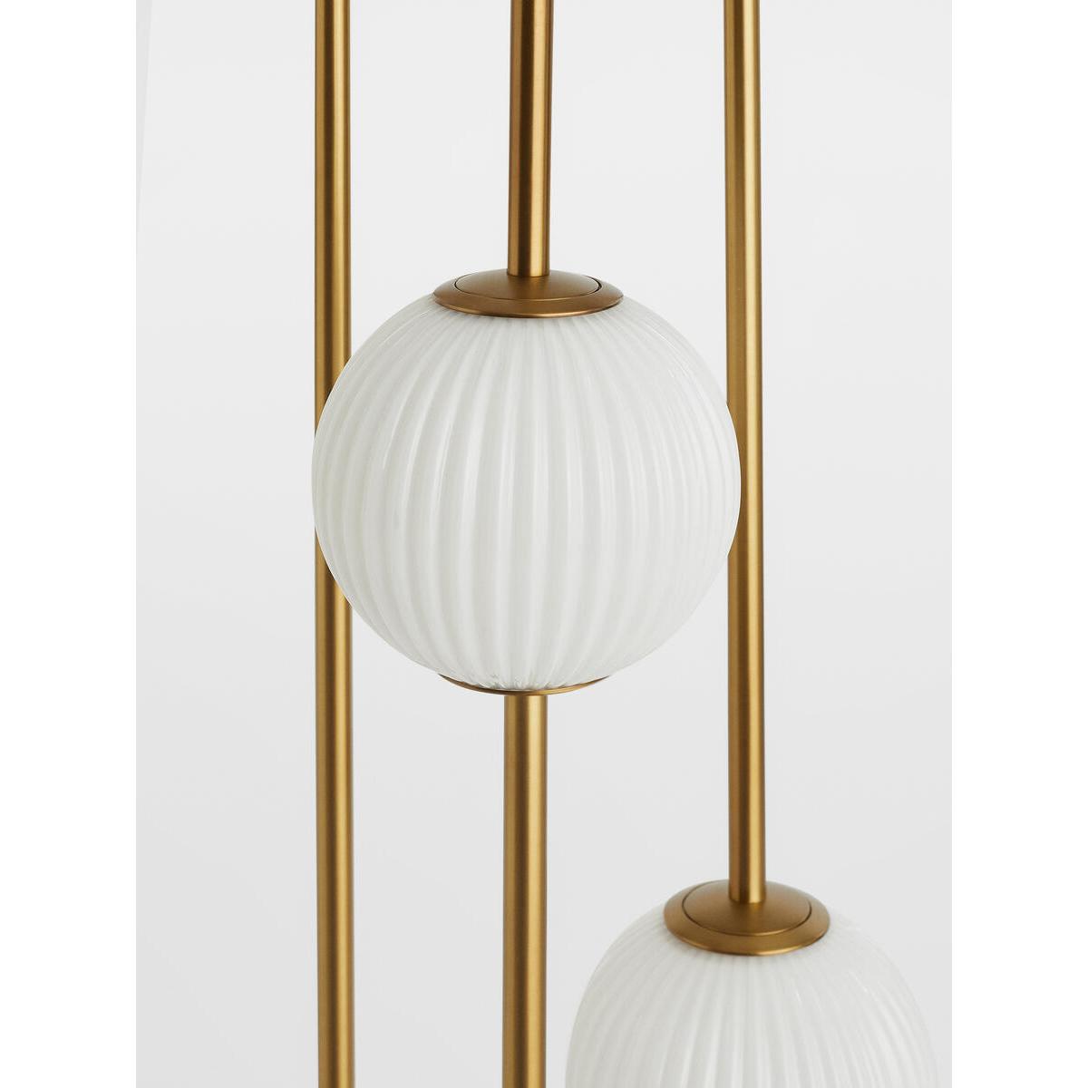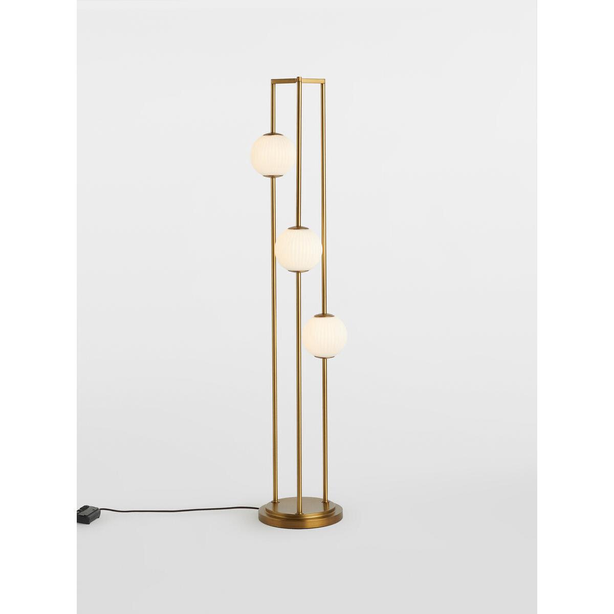 Reminiscent of the styles seen throughout Soho House Berlin, the Orion floor lamp is a structural piece, designed with three thin columns in an antique brass finish. It has white ribbed glass orbs that are fixed at different heights in the frame. Antique brass finish frame Three thin central columns Ribbed white glass Requires 1 x Standard E27 Golf Ball 410 bulb/ max 40W Inspired by Soho House Berlin