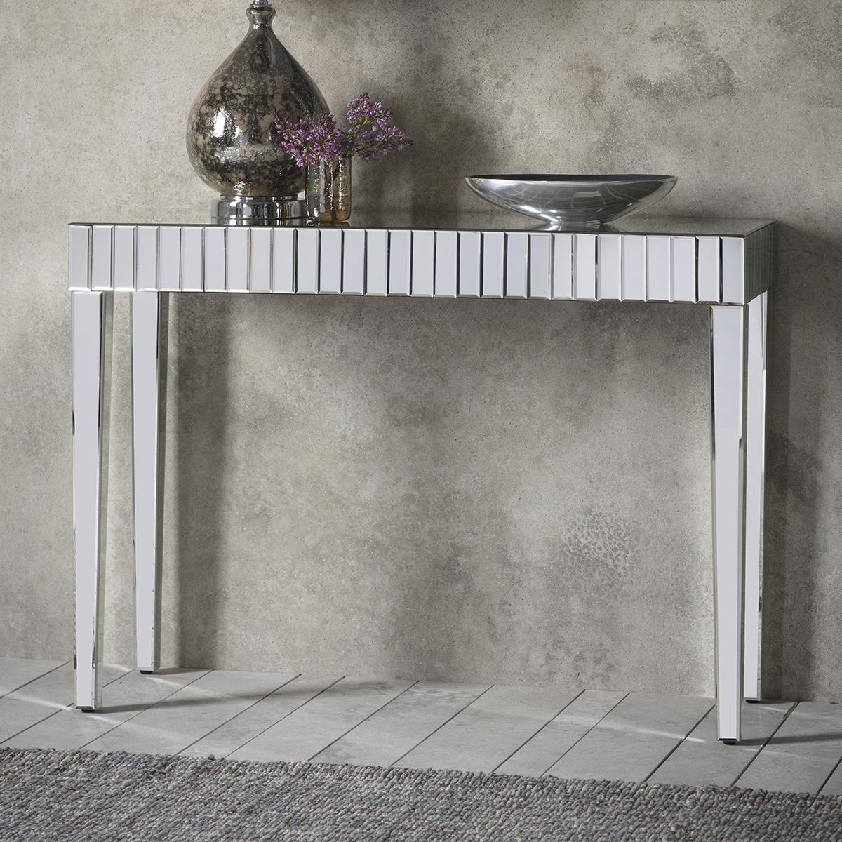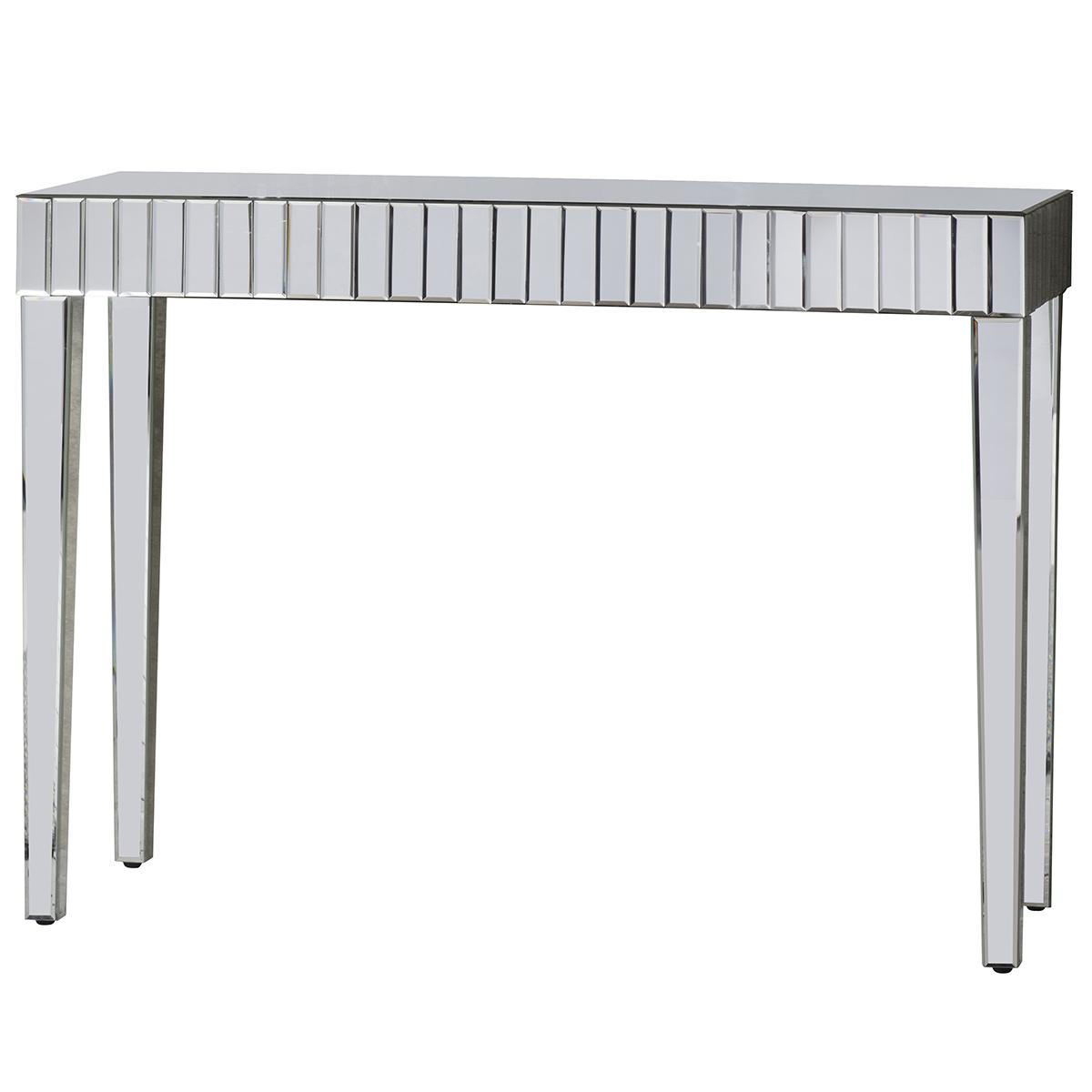 Stunning neo classical mirrored console table with a bevelled mirrored top, individual bevelled mirror panels around the top edge and tapered mirrored legs.