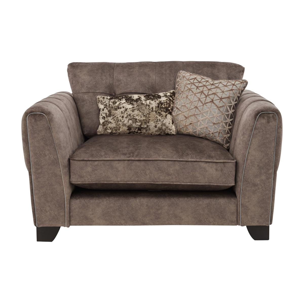 The perfect blend of modern elegance and luxury comfort, the Mariah Collection was designed to stand out. Grand in scale and contemporary in style, its generous, deep seats are upholstered in a unique fabric with the industrial look of leather but the incredible softness of luxury velvet for a truly indulgent lounging experience. Encore foam seats are sumptuously comfortable and keep their shape perfectly without re-plumping and a beautiful array of feather filled scatter cushions with a velvety sheen create a cushioned heaven. The elegant arms are decorated with delicate fluting and each piece comes with the option of brass or chrome studding and piping for a touch of opulence. Available in a variety of plush, gorgeous colours to complement the modern home. Handcrafted in the UK and exclusive to Furniture Village. Treat yourself to this snuggler chair. It’s surprisingly versatile – there’s room for two – and a clear style-leader thanks to its gorgeous nubuck leather-like upholstery. Why you'll love it This classic back fabric snuggler chair stands out in style. Part of our gorgeous Oh So Glam collection. Sumptuous style, serious comfort, superb quality. Luxurious yet durable upholstery looks and feels like nubuck leather. Generously proportioned and ready for lounging with a deep roomy seat. Exceptional craftsmanship – firm seat edge, solid hardwood frame, dark wood feet. Sink-in soft seat cushion comes with our 5-year plumpness guarantee. It’s filled with Encore foam so it springs back into shape, time after time. The high, gently curved arms feature hand-sewn fluting. Opt for brass-effect or chrome-effect piping and studs – at no extra cost. 2 reversible feather-filled scatters included – 1 square cushion and 1 bolster cushion. Handmade in the UK and only at Furniture Village. This classic back fabric snuggler chair is part of our Oh So Glam Mariah range. What you need to know Medium comfort level. Seat suspension: sprung with firm front edge. Seat cushioning: Encore foam. Back support: webbing. Back cushioning: fibre. For ease of delivery, please ensure there is sufficient access to your home. Some fabrics can show wear on areas of more use or in direct sunlight. Plump, turn and rotate seat and back cushions regularly. Please read our upholstery care guide for more advice. Shop our Mariah range for a huge choice of sofa, chair and footstool styles, sizes and fabrics. Item code: MARHSNUGCB-004