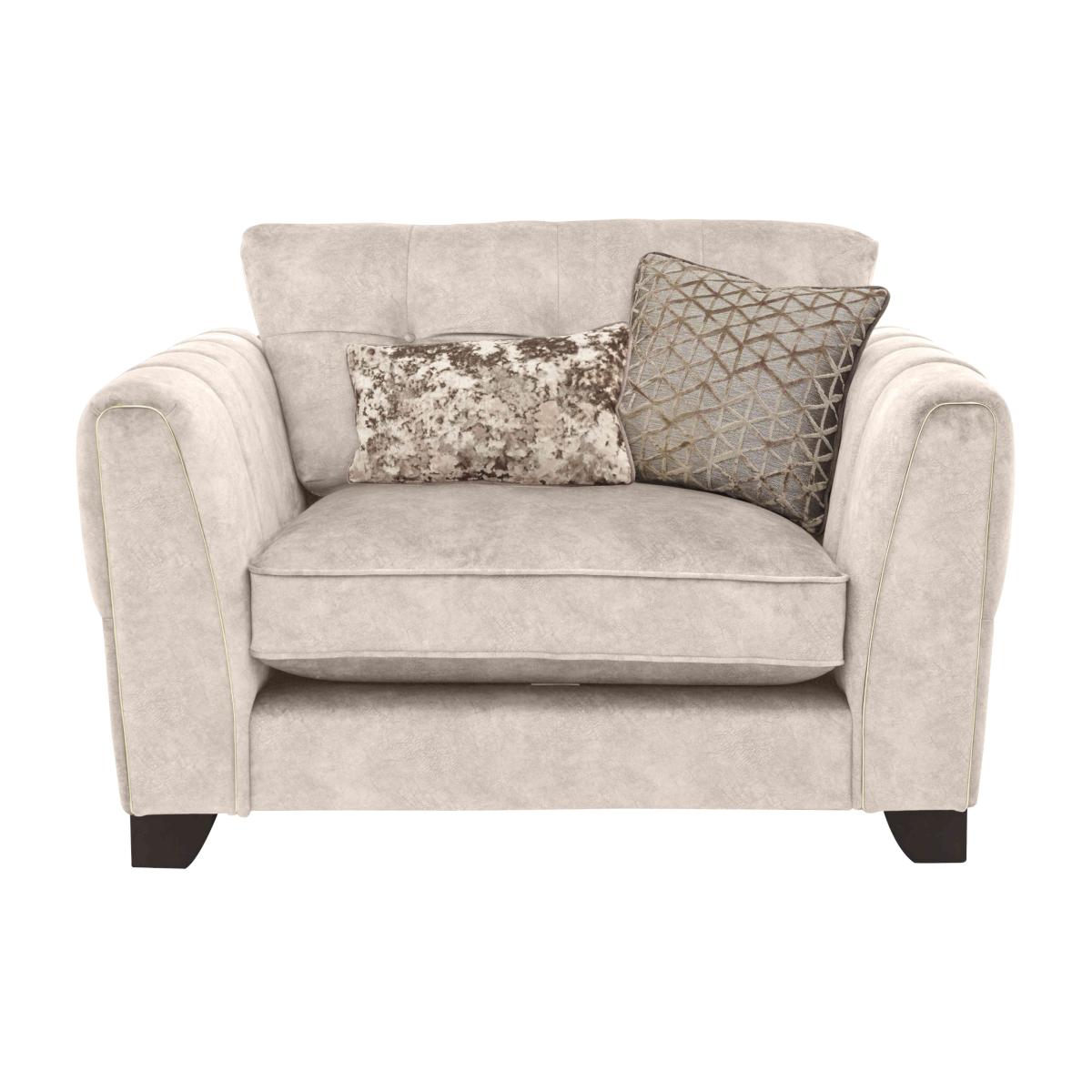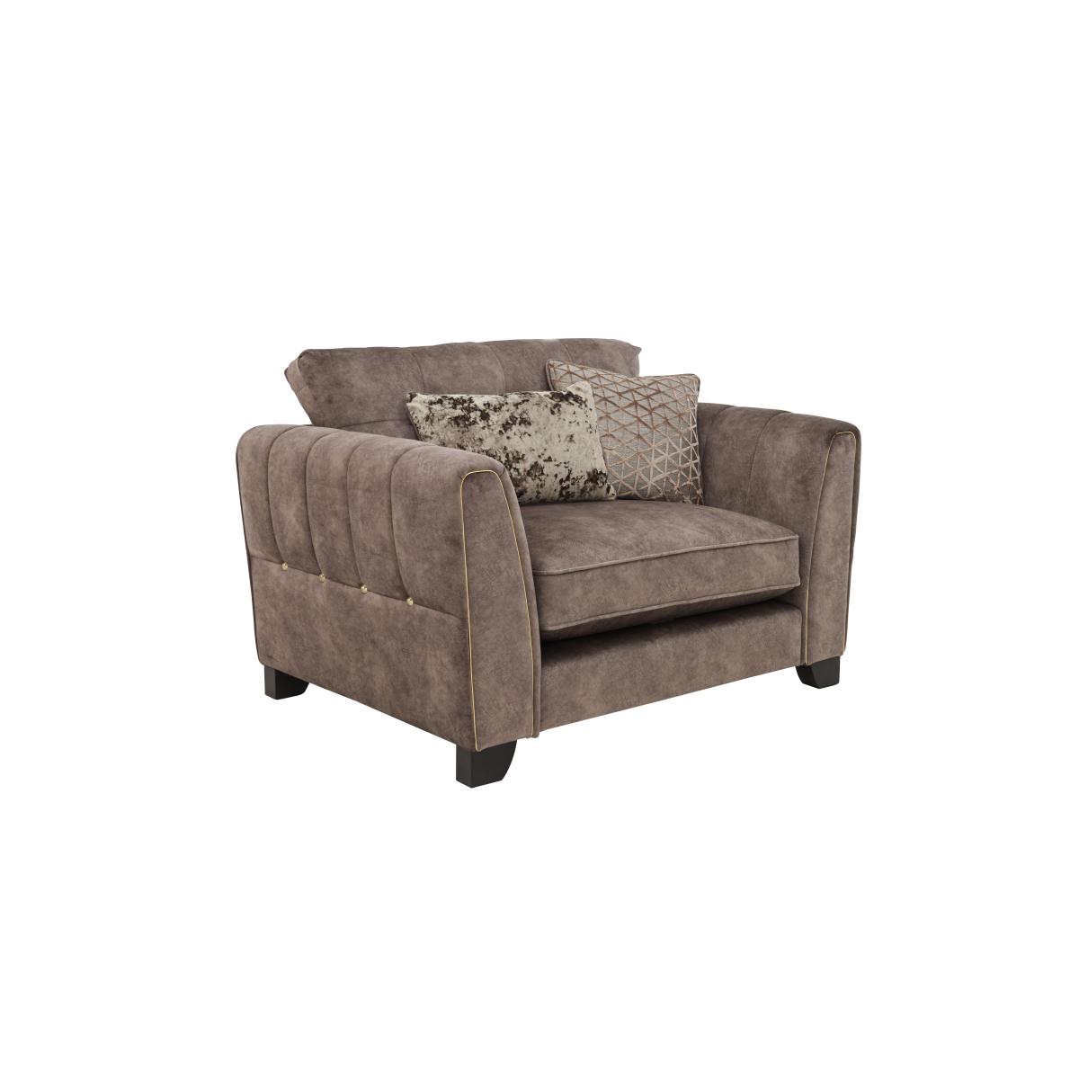 The perfect blend of modern elegance and luxury comfort, the Mariah Collection was designed to stand out. Grand in scale and contemporary in style, its generous, deep seats are upholstered in a unique fabric with the industrial look of leather but the incredible softness of luxury velvet for a truly indulgent lounging experience. Encore foam seats are sumptuously comfortable and keep their shape perfectly without re-plumping and a beautiful array of feather filled scatter cushions with a velvety sheen create a cushioned heaven. The elegant arms are decorated with delicate fluting and each piece comes with the option of brass or chrome studding and piping for a touch of opulence. Available in a variety of plush, gorgeous colours to complement the modern home. Handcrafted in the UK and exclusive to Furniture Village. Treat yourself to this snuggler chair. It’s surprisingly versatile – there’s room for two – and a clear style-leader thanks to its gorgeous nubuck leather-like upholstery. Why you'll love it This classic back fabric snuggler chair stands out in style. Part of our gorgeous Oh So Glam collection. Sumptuous style, serious comfort, superb quality. Luxurious yet durable upholstery looks and feels like nubuck leather. Generously proportioned and ready for lounging with a deep roomy seat. Exceptional craftsmanship – firm seat edge, solid hardwood frame, dark wood feet. Sink-in soft seat cushion comes with our 5-year plumpness guarantee. It’s filled with Encore foam so it springs back into shape, time after time. The high, gently curved arms feature hand-sewn fluting. Opt for brass-effect or chrome-effect piping and studs – at no extra cost. 2 reversible feather-filled scatters included – 1 square cushion and 1 bolster cushion. Handmade in the UK and only at Furniture Village. This classic back fabric snuggler chair is part of our Oh So Glam Mariah range. What you need to know Medium comfort level. Seat suspension: sprung with firm front edge. Seat cushioning: Encore foam. Back support: webbing. Back cushioning: fibre. For ease of delivery, please ensure there is sufficient access to your home. Some fabrics can show wear on areas of more use or in direct sunlight. Plump, turn and rotate seat and back cushions regularly. Please read our upholstery care guide for more advice. Shop our Mariah range for a huge choice of sofa, chair and footstool styles, sizes and fabrics. Item code: MARHSNUGCB-010
