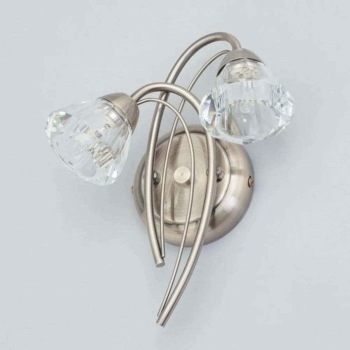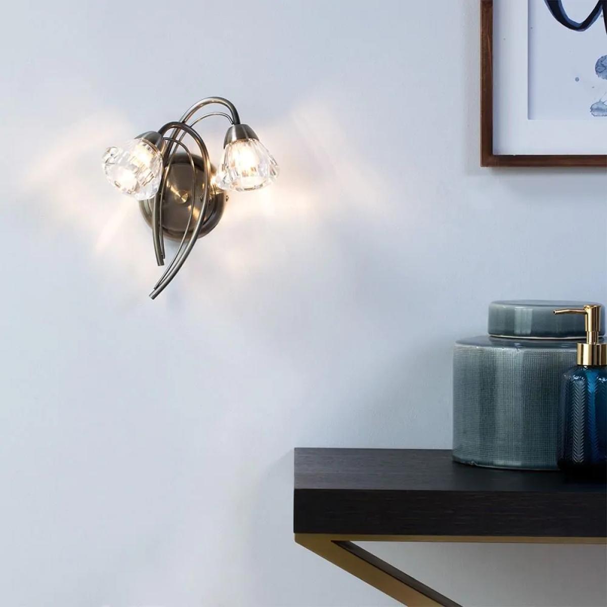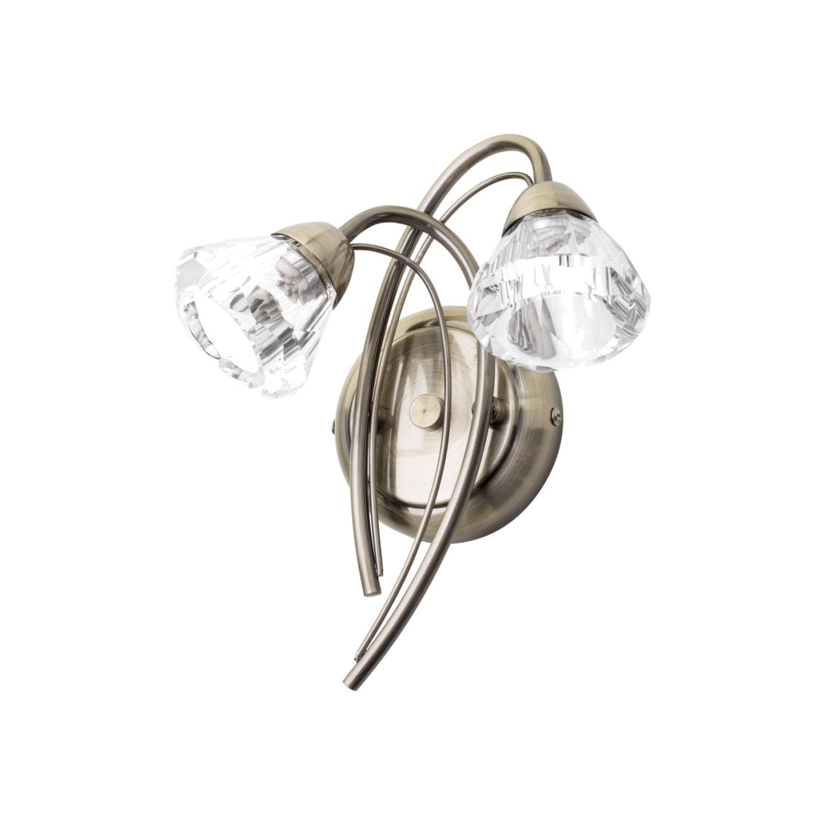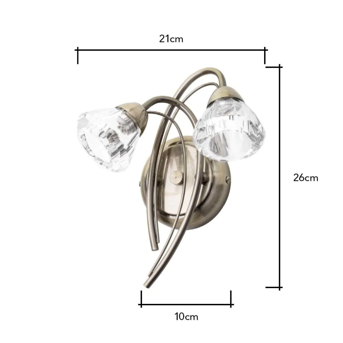 This elegant antique brass coloured fitting features 2 spiralling arms with a cut glass shade at the end of each, which will diffuse the light for a softer and more atmospheric tone. Perfect for any décor style from contemporary to classic, this wall light is a simple piece that will give an ambient glow to your home.