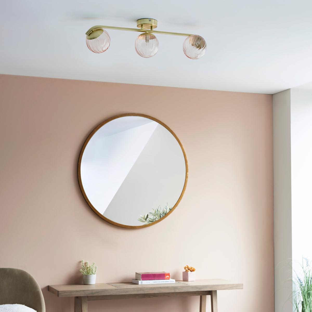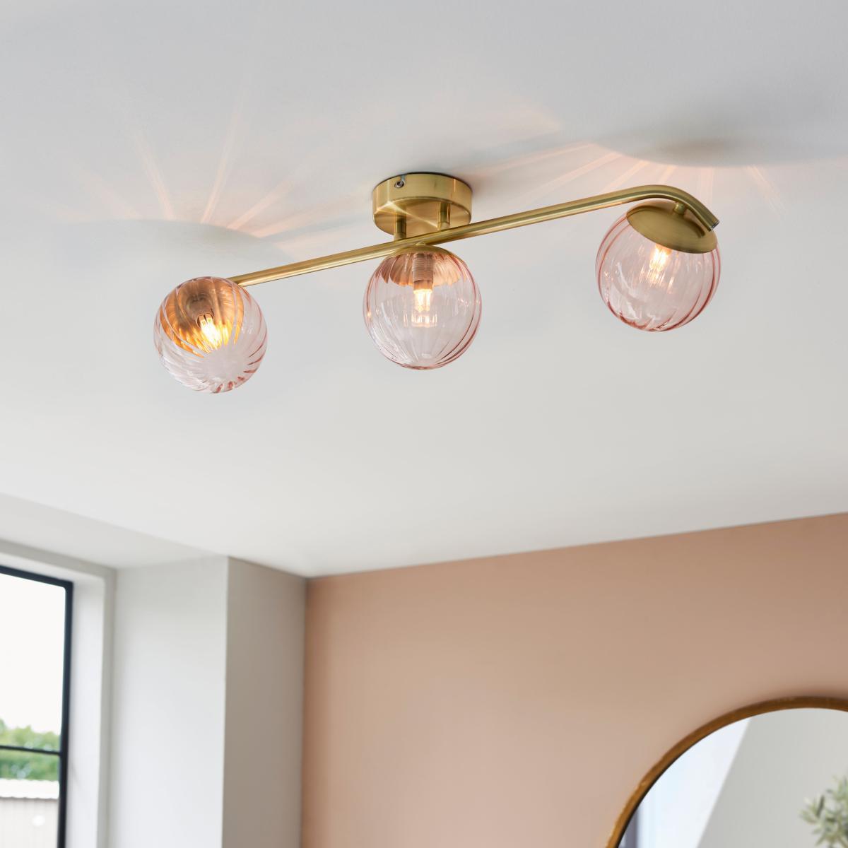 Brighten up your home with this stylish Marie 3 Light Spotlight Bar. This modern light fitting is available in a choice of smoked glass or pink glass ribbed shades, paired with a round metal ceiling cup and straight bar with curved edges, giving this spotlight a feminine look. This spotlight bar is dimmable and available in other colours, with matching family items available to help coordinate your home.