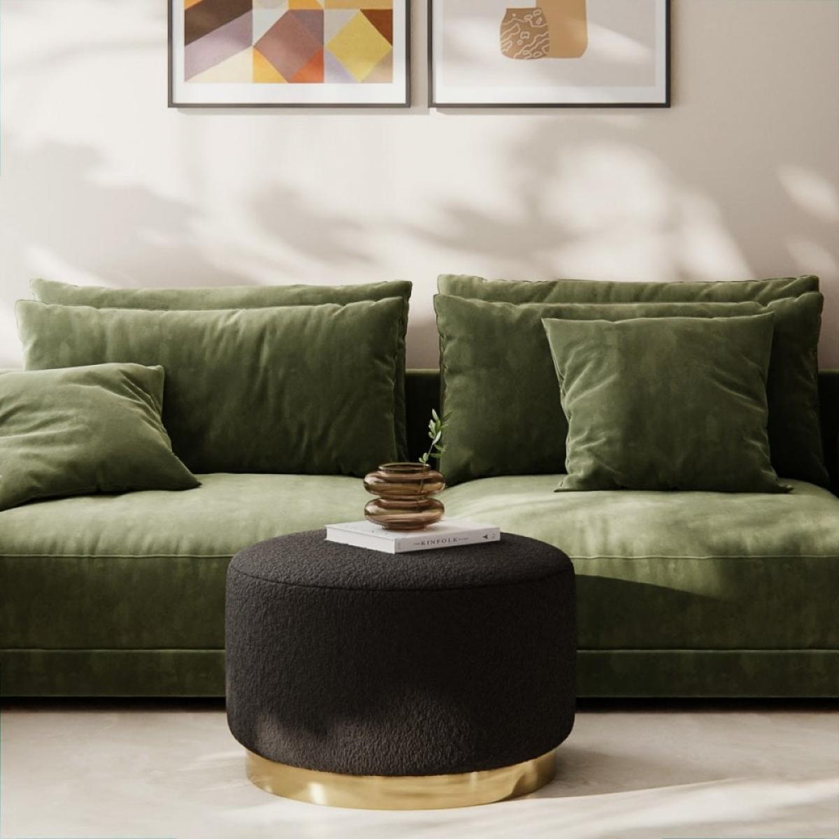 This footstool is a stylish yet practical addition, perfect for adding depth and texture to a variety of interiors. The black boucle fabric offers a soft, tactile feel that works well in contemporary, minimalist spaces or cozy, eclectic rooms. Its compact, rounded shape makes it versatile - use it as a footrest, extra seating, or even a small side table with a tray on top. The gold base adds a touch of glamour, making it suitable for luxe interiors or modern schemes with metallic accents. To style it effectively, pair with neutral tones for a clean look, or combine with rich colours like deep greens or jewel tones to enhance its sophistication. It’s a great piece to introduce tactile contrast and visual interest without overwhelming the space.