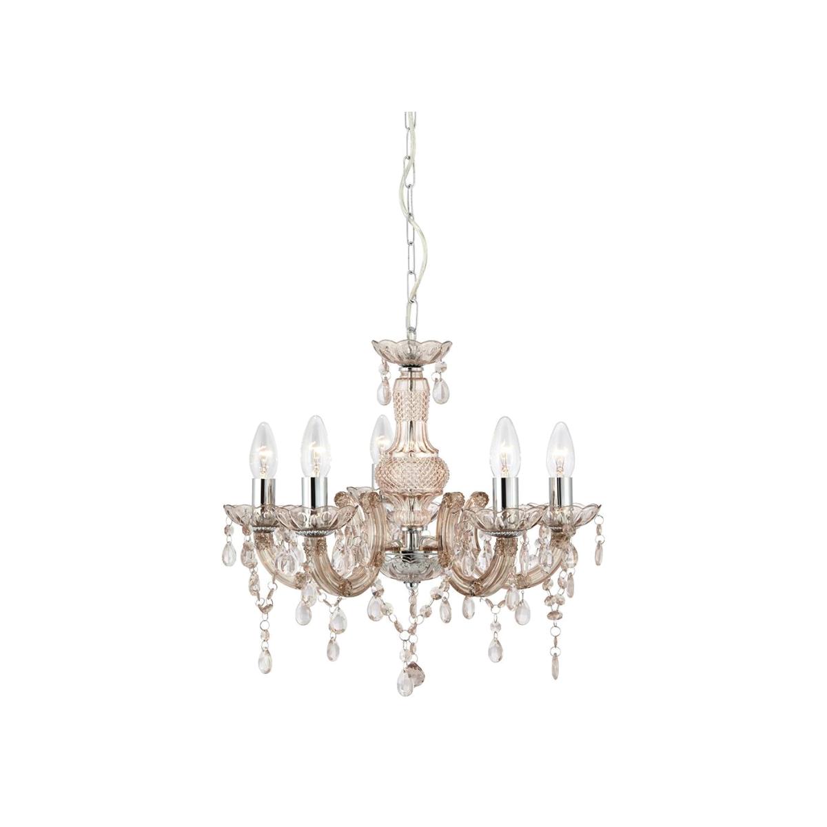 Add some grandeur to your interiors with this stunning chandelier from Searchlight. The Marie Therese 5 Light Chandelier is a traditional fitting with a mink glass and polished chrome frame. It features pear-shaped drops, curved arms and acrylic glass trimmings, which, along with the bare light bulbs, add to the chandelier effect. Ideally placed in a large room as a focal piece. It has a maximum drop of 930mm and measures 480mm in diameter. It requires 5 x SES Candle light bulbs with a maximum wattage of 40w.. Product Code: 1455-5M. I Add some grandeur to your interiors with this stunning chandelier from Searchlight. The Marie Therese 5 Light Chandelier is a traditional fitting with a mink glass and polished chrome frame. It features pear-shaped drops, curved arms and acrylic glass trimmings, which, along with the bare light bulbs, add to the chandelier effect. Ideally placed in a large room as a focal piece. It has a maximum drop of 930mm and measures 480mm in diameter. It requires 5 x SES Candle light bulbs with a maximum wattage of 40w.. Product Code: 1455-5M. I