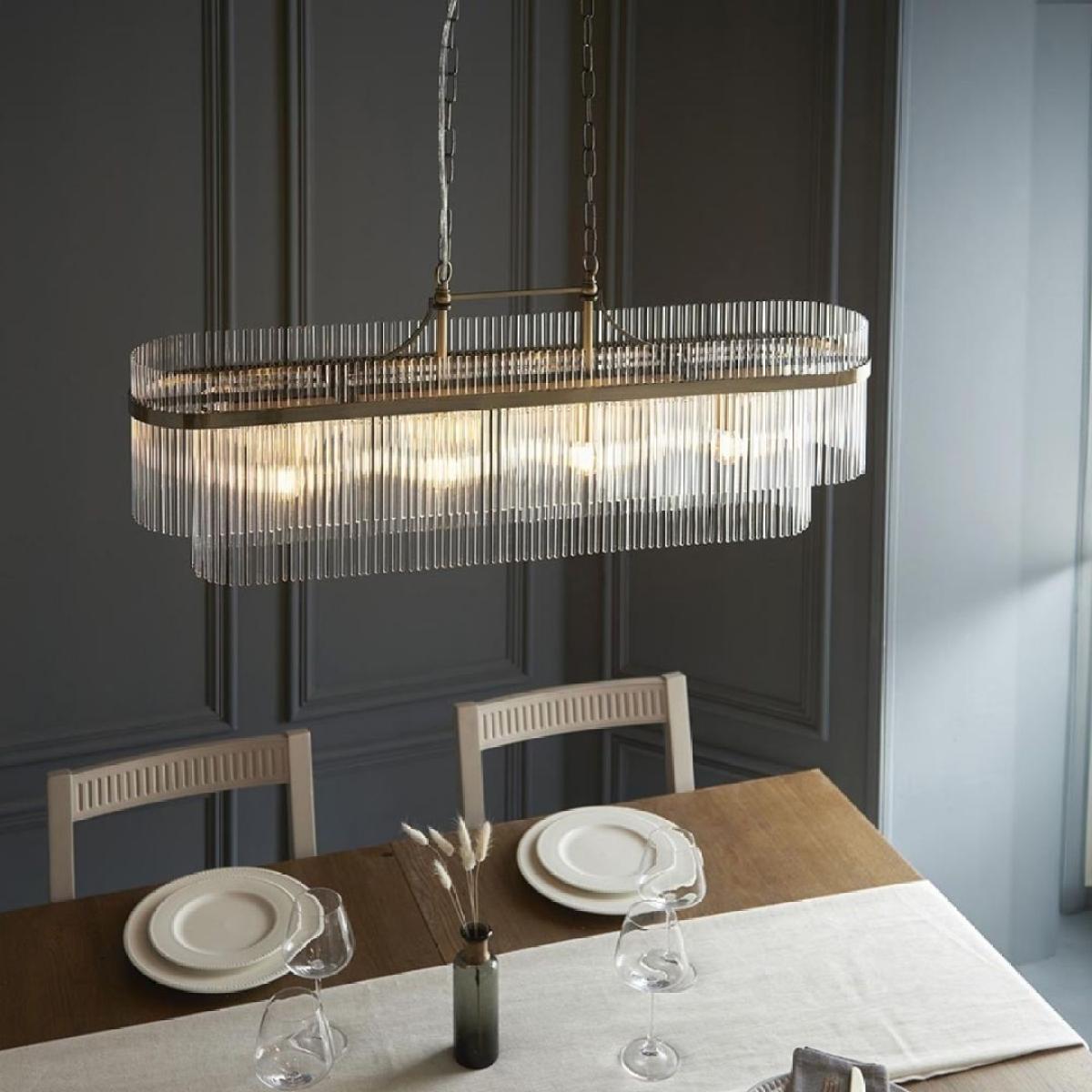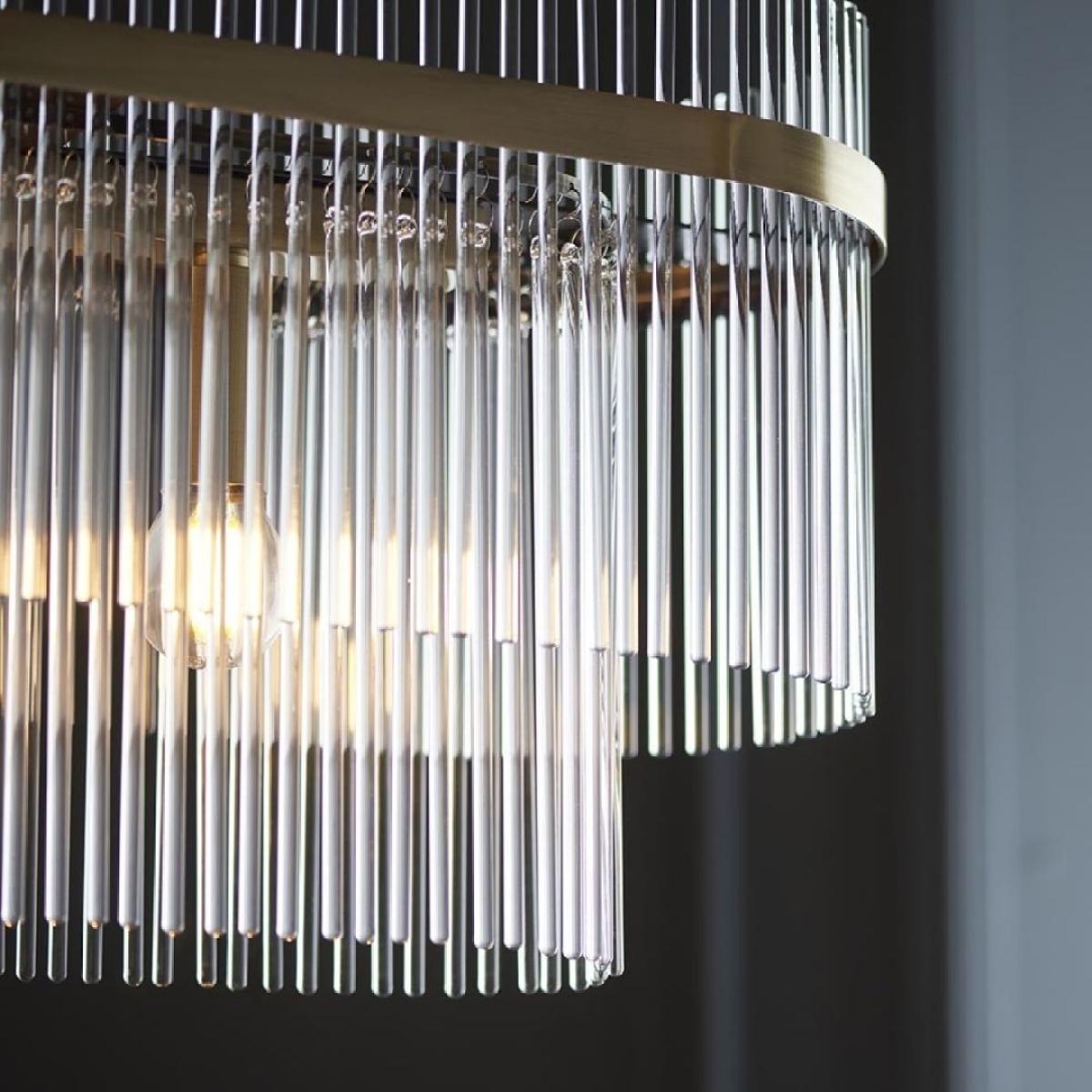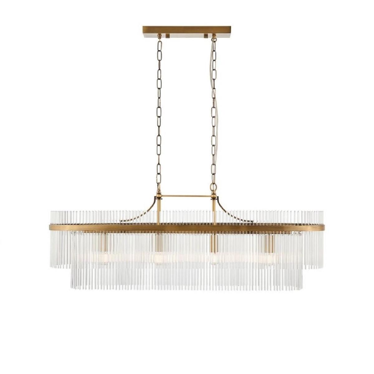 Marietta 4-light pendant bar, featuring an antique brass-plated finish and decorative clear glass rods. The Marietta 4-light pendant bar is a sophisticated statement piece, blending vintage charm with contemporary design. Featuring an antique brass-plated finish, this elegant light is adorned with decorative clear glass rods arranged in a striking two-tiered formation. The combination of warm brass tones and sparkling glass creates a timeless and luxurious aesthetic. Perfect for illuminating kitchen islands, dining tables or open-plan living spaces, the Marietta pendant bar offers both style and functionality. Its refined design makes it a versatile addition to interiors ranging from classic to modern. Marietta 4-light pendant bar, featuring an antique brass-plated finish and decorative clear glass rods. The Marietta 4-light pendant bar is a sophisticated statement piece, blending vintage charm with contemporary design. Featuring an antique brass-plated finish, this elegant light is adorned with decorative clear glass rods arranged in a striking two-tiered formation. The combination of warm brass tones and sparkling glass creates a timeless and luxurious aesthetic. Perfect for illuminating kitchen islands, dining tables or open-plan living spaces, the Marietta pendant bar offers both style and functionality. Its refined design makes it a versatile addition to interiors ranging from classic to modern.