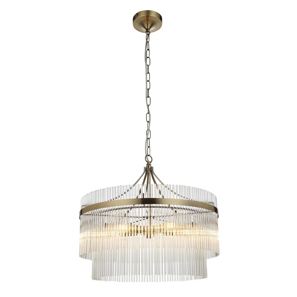 Beautiful contemporary interpretation of the chandelier in antique brass plated finish. Decorative clear glass rods diffuse the light to create an inviting ambience. The chain can be adjusted to suit ceiling height and allow it to be perfectly hung above dining tables or in living spaces. Matching items also available to create a cohesive look.