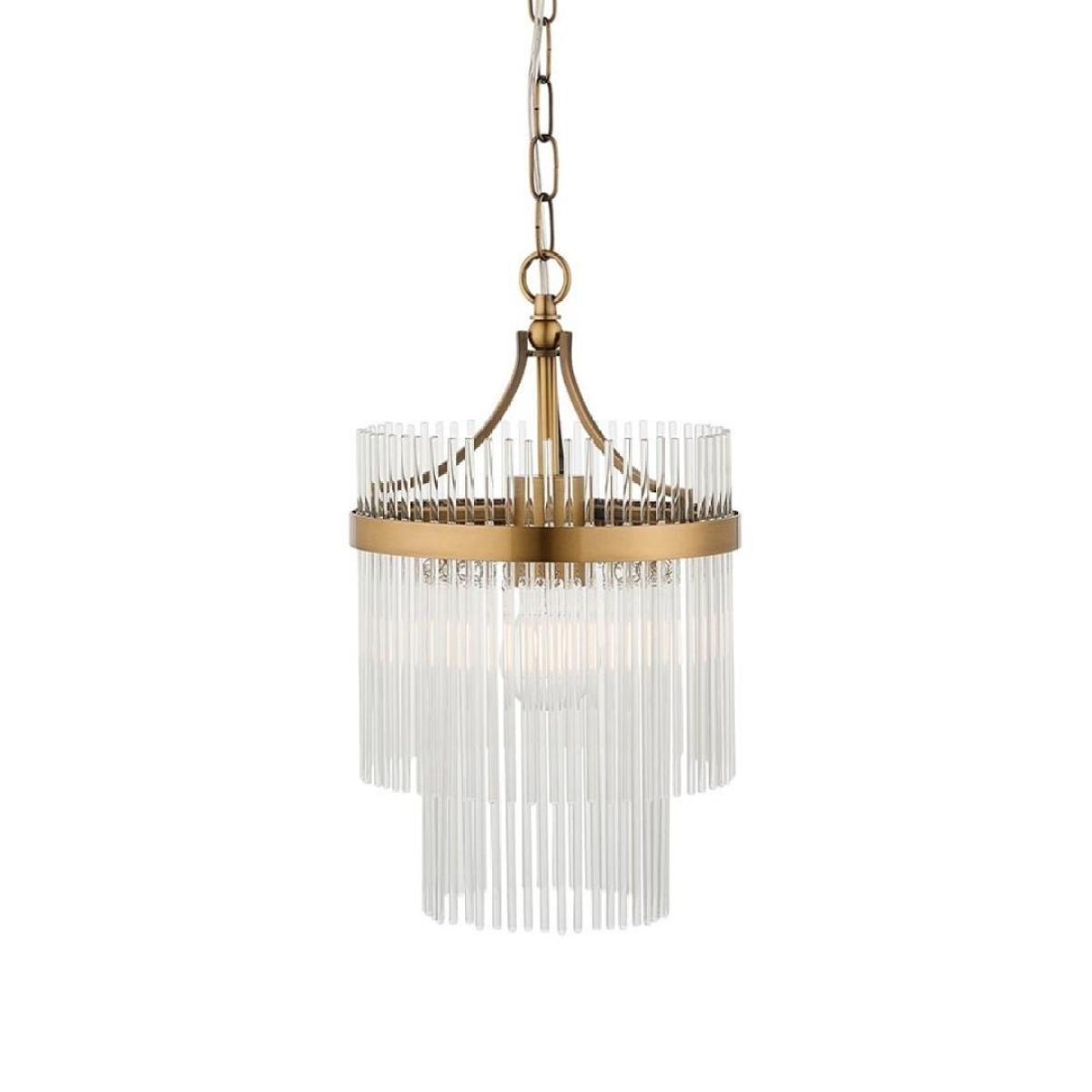 Marietta 1-light pendant ceiling light, featuring an antique brass-plated finish and decorative clear glass rods in a two-tiered design. The Marietta 1-light pendant ceiling light brings a touch of understated elegance to any space. Featuring an antique brass-plated finish, this beautiful design is adorned with decorative clear glass rods arranged in a refined two-tiered formation. The combination of warm brass tones and sparkling glass creates a sophisticated and timeless look. Perfect for kitchens, hallways or dining areas, this pendant light adds a subtle yet stylish focal point while casting a soft and inviting glow. The Marietta pendant ceiling light is ideal for those seeking a contemporary interpretation of classic design. Marietta 1-light pendant ceiling light, featuring an antique brass-plated finish and decorative clear glass rods in a two-tiered design. The Marietta 1-light pendant ceiling light brings a touch of understated elegance to any space. Featuring an antique brass-plated finish, this beautiful design is adorned with decorative clear glass rods arranged in a refined two-tiered formation. The combination of warm brass tones and sparkling glass creates a sophisticated and timeless look. Perfect for kitchens, hallways or dining areas, this pendant light adds a subtle yet stylish focal point while casting a soft and inviting glow. The Marietta pendant ceiling light is ideal for those seeking a contemporary interpretation of classic design.